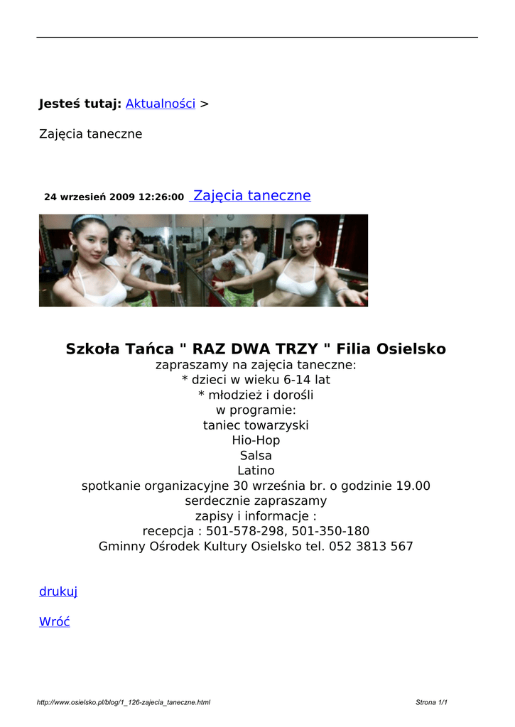 Jesteś tutaj: Aktualności > Zajęcia taneczne 24 wrzesień 2009 12:26:00 Zajęcia taneczne Szkoła Tańca " RAZ DWA TRZY " Filia Osielsko zapraszamy na zajęcia taneczne: * dzieci w wieku 6-14 lat * młodzież i dorośli w programie: taniec towarzyski Hio-Hop Salsa Latino spotkanie organizacyjne 30 września br. o godzinie 19.00 serdecznie zapraszamy zapisy i informacje : recepcja : 501-578-298, 501-350-180 Gminny Ośrodek Kultury Osielsko tel. 052 3813 567 drukuj Wróć http://www.osielsko.pl/blog/1_126-zajecia_taneczne.html Powered by TCPDF (www.tcpdf.org) Strona 1/1
