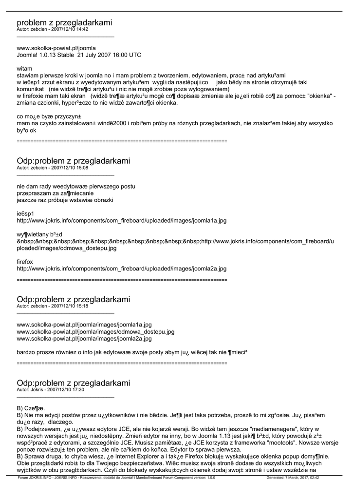 problem z przegladarkami Autor: zebcien - 2007/12/10 14:42 _____________________________________ www.sokolka-powiat.pl/joomla Joomla! 1.0.13 Stable 21 July 2007 16:00 UTC witam stawiam pierwsze kroki w joomla no i mam problem z tworzeniem, edytowaniem, prac± nad artyku³ami w ie6sp1 zrzut ekranu z wyedytowanym artyku³em wygl±da nastêpuj±co jako bêdy na stronie otrzymujê taki komunikat (nie widzê tre¶ci artyku³u i nic nie mogê zrobiæ poza wylogowaniem) w firefoxie mam taki ekran (widzê tre¶æ artyku³u mogê co¶ dopisaæ zmieniæ ale je¿eli robiê co¶ za pomoc± "okienka" zmiana czcionki, hyper³±cze to nie widzê zawarto¶ci okienka. co mo¿e byæ przyczyn± mam na czysto zainstalowan± windê2000 i robi³em próby na róznych przegladarkach, nie znalaz³em takiej aby wszystko by³o ok ============================================================================ Odp:problem z przegladarkami Autor: zebcien - 2007/12/10 15:08 _____________________________________ nie dam rady weedytowaæ pierwszego postu przepraszam za za¶miecanie jeszcze raz próbuje wstawiæ obrazki ie6sp1 http://www.jokris.info/components/com_fireboard/uploaded/images/joomla1a.jpg wy¶wietlany b³±d http://www.jokris.info/components/com_fireboard/u ploaded/images/odmowa_dostepu.jpg firefox http://www.jokris.info/components/com_fireboard/uploaded/images/joomla2a.jpg ============================================================================ Odp:problem z przegladarkami Autor: zebcien - 2007/12/10 15:18 _____________________________________ www.sokolka-powiat.pl/joomla/images/joomla1a.jpg www.sokolka-powiat.pl/joomla/images/odmowa_dostepu.jpg www.sokolka-powiat.pl/joomla/images/joomla2a.jpg bardzo prosze równiez o info jak edytowaæ swoje posty abym ju¿ wiêcej tak nie ¶mieci³ ============================================================================ Odp:problem z przegladarkami Autor: Jokris - 2007/12/10 17:30 _____________________________________ B) Cze¶æ. B) Nie ma edycji postów przez u¿ytkowników i nie bêdzie. Je¶li jest taka potrzeba, proszê to mi zg³osiæ. Ju¿ pisa³em du¿o razy, dlaczego. B) Podejrzewam, ¿e u¿ywasz edytora JCE, ale nie kojarzê wersji. Bo widzê tam jeszcze "mediamenagera", który w nowszych wersjach jest ju¿ niedostêpny. Zmieñ edytor na inny, bo w Joomla 1.13 jest jaki¶ b³±d, który powodujê z³± wspó³pracê z edytorami, a szczególnie JCE. Musisz pamiêtaæ, ¿e JCE korzysta z frameworka "mootools". Nowsze wersje ponoæ rozwi±zuj± ten problem, ale nie ca³kiem do koñca. Edytor to sprawa pierwsza. B) Sprawa druga, to chyba wiesz, ¿e Internet Explorer a i tak¿e Firefox blokuj± wyskakuj±ce okienka popup domy¶lnie. Obie przegl±darki robi± to dla Twojego bezpieczeñstwa. Wiêc musisz swoja stronê dodaæ do wszystkich mo¿liwych wyj±tków w obu przegl±darkach. Czyli do blokady wyskakuj±cych okienek dodaj swoj± stronê i ustaw wszêdzie na Forum JOKRIS.INFO - JOKRIS.INFO - Rozszerzenia, dodatki do Joomla! i Mambofireboard Forum Component version: 1.0.0 Generated: 7 March, 2017, 02:42 "zezwalaj", lub podobnie. Zezwalaj tak¿e na ciasteczka, pobieranie obrazków i.t.d. z twojej strony. Dodatkowo je¶li posiadasz jakie¶ filtry w Firefoxie, to dla Twojej strony wy³±cz je. B) To wszystko. Wiêc zmiana edytora lub skorzystanie z nie przet³umaczonej wersji 1.1.6 edytora JCE z Joomlapl.com, oraz dodanie strony do wyj±tków. Musi dzia³aæ. Pozdrawiam. Jokris. P.s. Jak wstawiæ obrazki do postu znajdziesz w Pomocy Forum. ============================================================================ Odp:problem z przegladarkami Autor: aha44 - 2007/12/11 02:55 _____________________________________ polecam edytor mosce nie robi problemów i jest popolskiemu :) ps. znikaj±cy tekst po wpisaniu literki ¼ opisany zosta³ na joomlapl w dziale demo/pierwsze kroki - jako¶ tak. ============================================================================ Odp:problem z przegladarkami Autor: zebcien - 2007/12/11 09:30 _____________________________________ witam zabra³em sie za zmianê edytora na sugerowany mosce zainstalowa³em bota e103Final_pl_iso.zip a jak instalujê komponent e_final_1.03_pl_Admin.zip to krzyczy mi ze nie mo¿e utworzyæ katalogu na innej mojej stronie testowej z wersj± 12 pozwoli³ to zrobiæ czy¿by ten komponent nie instalowa³ niê na 13? pozdrawiam piotrek ============================================================================ Odp:problem z przegladarkami Autor: aha44 - 2007/12/11 12:26 _____________________________________ wiesz co, ja akurat mam wersje 11, ale krótk± chwilê mia³em 13 i na tej wersji instalowa³o siê co chcia³o, czyli czasem instalowa³em co¶ po kilka razy gdzie 3 razy mówi³o nie, a za czwartym nie by³o problemu. Osobi¶cie da³em sobie spokój z wersja 13 joomli. Ale zobacz inn± wersje mosce, lub sci±gnij z innej strony. Wiem ze ktora¶ nie chcia³a i u mnie chodzic. Ja mam zainstalowan± mosce_admin_final_103pl. Dzia³a rewelka. ============================================================================ Odp:problem z przegladarkami Autor: zebcien - 2007/12/11 12:34 _____________________________________ witam ponownie sprawa 1 pod 13 nie uda³o mi sie zainstalowaæ mosce pod 12 mi siê uda³o ale jak chcê wstawiæ hyper³±cze to pojawia mi siê komunikat "Fatal error: Call to a member function getCfg() on a non-object in /home/g/a/c/gacie/www/includes/joomla.php on line 3421" poni¿ej podajê link do joomla.php http://www.gacie.ovh.org/includes/joomla.php_kopia o dziwo zdj±æ hyper³±cze pozwala bez problemu sprawa 2 co mo¿e byæ przyczyn± tego ¿e przy instalacji komponentów, modu³ów lub dodatków a nawet szablonów instalator krzyczy ¿e niepowodzenie bo nie mo¿na utworzyæ "jakiego¶" katalogu? pozdrawiam piotrek Forum JOKRIS.INFO - JOKRIS.INFO - Rozszerzenia, dodatki do Joomla! i Mambofireboard Forum Component version: 1.0.0 Generated: 7 March, 2017, 02:42 =======================