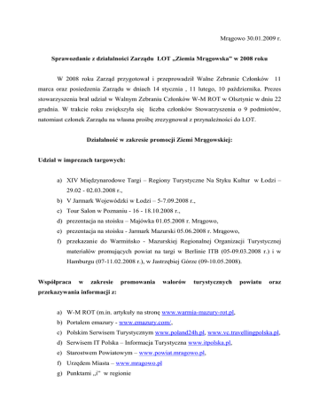 Mrągowo 30.01.2009 r. Sprawozdanie z działalności Zarządu LOT „Ziemia Mrągowska” w 2008 roku W 2008 roku Zarząd przygotował i przeprowadził Walne Zebranie Członków 11 marca oraz posiedzenia Zarządu w dniach 14 stycznia , 11 lutego, 10 października. Prezes stowarzyszenia brał udział w Walnym Zebraniu Członków W-M ROT w Olsztynie w dniu 22 grudnia. W trakcie roku zwiększyła się liczba członków Stowarzyszenia o 9 podmiotów, natomiast członek Zarządu na własna prośbę zrezygnował z przynależności do LOT. Działalność w zakresie promocji Ziemi Mrągowskiej: Udział w imprezach targowych: a) XIV Międzynarodowe Targi – Regiony Turystyczne Na Styku Kultur w Łodzi – 29.02 - 02.03.2008 r., b) V Jarmark Wojewódzki w Łodzi – 5-7.09.2008 r., c) Tour Salon w Poznaniu - 16 - 18.10.2008 r., d) prezentacja na stoisku – Majówka 01.05.2008 r. Mrągowo, e) prezentacja na stoisku - Jarmark Mazurski 05.06.2008 r. Mrągowo, f) przekazanie do Warmińsko - Mazurskiej Regionalnej Organizacji Turystycznej materiałów promujących powiat na targi w Berlinie ITB (05-09.03.2008 r.) i w Hamburgu (07-11.02.2008 r.), w Jastrzębiej Górze (09-10.05.2008). Współpraca w zakresie promowania walorów turystycznych powiatu oraz przekazywania informacji z: a) W-M ROT (m.in. artykuły na stronę www.warmia-mazury-rot.pl, b) Portalem emazury - www.emazury.com/, c) Polskim Serwisem Turystycznym www.poland24h.pl, www.vc.travellingpolska.pl, d) Serwisem IT Polska – Informacja Turystyczna www.itpolska.pl, e) Starostwem Powiatowym – www.powiat.mragowo.pl, f) Urzędem Miasta – www.mragowo.pl g) Punktami „i” w regionie h) Mediami: Radio Wama (obecnie Planeta), Radio Olsztyn, Kurier Mrągowski, ITV Mrągowo, Magazyn podróży VIP, Nasz Powiat Mrągowski, Magazyn Mrągowski i) Współrealizacja filmu „Przewodnik po Ziemi Mrągowskiej” prezentującego m.in. walory przyrodniczo – kulturowe powiatu. Film dostępny jest na stronie www.itv.mragowo.pl, Witryna internetowa: www.it.mragowo.pl W 2008 r. strona administrowana przez MCIT została zmodernizowana, dużym udogodnieniem dla turystów jak i mieszkańców jest wyszukiwarka danych. Członkowie LOT „Ziemia Mrągowska” są uprawnieni do umieszczenia w Bazie Danych pełnych informacji o swojej działalności. Osoba należąca do LOT „Ziemia Mrągowska” ma dostęp do czterech opcji panelu administracyjnego Użytkownika: Dane Teleadresowe, Opis obiektu, Mapa dojazdowa oraz Galeria zdjęć. Dostęp Użytkowników niezrzeszonych w Organizacji ograniczony jest do Danych Teleadresowych. O popularności strony świadczą statystyki opracowywane przez firmę DoIT : 2005 r. od września - 1956 , 2006 r. - 19 284, 2007 r. 46 377, 2008 r. – 60 395 wejść na stronę. Działalność wydawnicza: a) Opracowanie i wydanie mapy Ziemia Mrągowska z atrakcjami turystycznymi powiatu (udostępnienie elektronicznej wersji mapy dla Starostwa Powiatowego, mapa wykorzystana była również w magazynie Nasz Powiat Mrągowski b) Opracowanie plakatów zawierających plan miasta i powiatu oraz dane teleadresowe obiektów członków LOT – plany rozwieszone są w mieście oraz w MCIT c) Opracowanie i wydanie kalendarza ściennego Ziemi Mrągowskiej na 2009 r. Organizacja i udział w imprezach branżowych, konferencjach, szkoleniach a) Zorganizowanie Światowego Dnia Przewodnictwa Turystycznego (23 lutego), przy współpracy z Mrągowskim Centrum Informacji Turystycznej zorganizowano bezpłatne zwiedzanie Mrągowa z licencjonowanym przewodnikiem terenowym przeznaczone dla wszystkich mieszkańców Ziemi Mrągowskiej. Głównym założeniem było pogłębienie wiedzy i zainteresowań mieszkańców na temat miejscowości i regionu, w którym żyją, a) Zorganizowanie konferencji dla delegacji z Białorusi (15 kwietnia). Podczas spotkania omówiono kierunki rozwoju turystyki w powiecie, zagospodarowanie turystyczne powiatu oraz działalność promocyjną. Delegaci z uwagą wysłuchali informacji na temat działalności Lokalnej Organizacji Turystycznej "Ziemia Mrągowska" i MCIT. b) Współorganizacja szkolenia „Trendy w turystyce – pod gruszą czy aktywnie” – 07 maja 2008 r. Program obejmował wykłady, prezentacje multimedialne dotyczące nowatorskiego spojrzenia na turystykę i możliwości organizacji aktywnego wypoczynku w zgodzie z naturą. Szkolenie przeznaczone było dla wszystkich chętnych osób zainteresowanych rozwojem turystyki w powiecie. Uczestnicy zapoznali się z panującymi trendami w turystyce, wysłuchali ciekawych wykładów. Największym zainteresowaniem cieszyła się prezentacja nowatorskiego sprzętu i dyscyplin: trikke, nuclear globe, zorbing, speedminton. c) Udział w Konferencji - Pierwsze Forum Funduszy Europejskich „Polska pięknieje, czyli 7 cudów unijnych Polski” – (7-8 maj Warszawa), d) Udział w konsultacjach społecznych dotyczących przebiegu międzynarodowej trasy rowerowej północnej Polski w Urzędzie Marszałkowskim w Olsztynie – 9 czerwca. e) Współorganizacja Światowego Dnia Turystyki (27 września) – w ramach imprezy ogłoszono konkursy: fotograficzny „Zdjęcie wakacyjne” b/o, plastyczny „Moje wakacje” dla dzieci do 12 roku życia i przy współpracy Starostwa konkurs plastyczny dla młodzieży w wieku ponadgimnazjalnym „190 lat Powiatu Mrągowskiego”; koordynacja działań związanych z przygotowaniem stoisk kulinarnych przez szkoły powiatowe, f) Udział w konferencji w Warszawie (08 października) z udziałem dziennikarzy ze Stowarzyszenia Globtroter - prezentacja atrakcji turystycznych powiatu mrągowskiego: Góra 4 Wiatrów, Mrongoville, g) Udział w wojewódzkich obchodach Światowego Dnia Turystyki (22 października) – przedstawienie korzyści z funkcjonowania LOT, możliwości działania i rozwoju. h) Działalność edukacyjna: zapewnienie opieki pilotażowej grupie szkolnej z Mrągowskiego Centrum Kształcenia (profil turystyczny) podczas wycieczki po Powiecie 