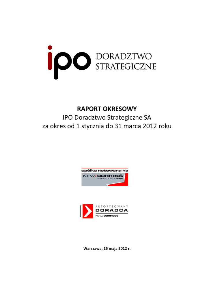 RAPORT OKRESOWY IPO Doradztwo Strategiczne SA za okres od 1 stycznia do 31 marca 2012 roku Warszawa, 15 maja 2012 r. Spis treści 1 Wprowadzenie ................................................................................................................................. 3 1.1 Podstawa sporządzania raportu okresowego za I kwartał 2012 r. ...................................................... 3 1.2 Podstawowe informacje o IPO Doradztwo Strategiczne SA ................................................................ 3 1.3 Władze Spółki ....................................................................................................................................... 4 1.3.1 Zarząd............................................................................................................................................. 4 1.3.2 Rada Nadzorcza ............................................................................................................................. 4 1.4 Akcje i akcjonariat ................................................................................................................................ 4 2 Wybrane dane finansowe ................................................................................................................. 5 2.1 Wybrane dane z bilansu ....................................................................................................................... 5 2.2 Wybrane dane z rachunku zysków i strat............................................................................................. 5 2.3 Informacja dotycząca prognoz ............................................................................................................. 6 3. Działalność IPO DS......................................................................................................................... 6 3.1. Komentarz Zarządu na temat czynników i zdarzeń, które miały wpływ na osiągnięte wyniki finansowe w I kwartale 2012 r. ...................................................................................................................... 6 3.2. Informacja na temat aktywności, jaką w okresie I kwartału 2012 r. Emitent podejmował w obszarze rozwoju prowadzonej działalności .................................................................................................. 6 3.3. Istotne zdarzenia po dacie bilansu ...................................................................................................... 7 4. Pozostałe informacje ..................................................................................................................... 7 4.1. Oświadczenie Zarządu IPO Doradztwo Strategiczne SA w sprawie rzetelności sprawozdania finansowego ................................................................................................................................................... 7 4.2. Dane teleadresowe............................................................................................................................... 7 4.2.1. Kontakt do Spółki ........................................................................................................................... 7 4.2.2. Kontakt dla Inwestorów................................................................................................................. 7 IPO DORADZTWO STRATEGICZNE SA www.ipo.com.pl [email protected] 2 1 Wprowadzenie 1.1 Podstawa sporządzania raportu okresowego za I kwartał 2012 r. Niniejszy raport został sporządzony na podstawie § 5 ust. 1 i 3 oraz zgodnie z ust. 4.1 - 4.2 Załącznika nr 3 do Regulaminu Alternatywnego Systemu Obrotu Informacje bieżące i okresowe przekazywane w alternatywnym systemie obrotu na rynku NewConnect. Raport okresowy IPO Doradztwo Strategiczne SA (Spółka, Emitent, IPO DS) za I kwartał 2012 r. obejmuje okres od 1 stycznia do 31 marca 2012 r. oraz dane porównawcze za okres od 1 stycznia do 31 marca 2011 r. Elementy sprawozdania finansowego zaprezentowane w niniejszym raporcie okresowym zostały sporządzone zgodnie z ustawą z dnia 29 września 1994 r. o rachunkowości (Dz.U. 2009 r. Nr 152, poz. 1223, z późn. zm.). Dane finansowe, o ile nie wskazano inaczej, wyrażone zostały w złotych. 1.2 Podstawowe informacje o IPO Doradztwo Strategiczne SA IPO Doradztwo Strategiczne SA jest spółką akcyjną powołaną na czas nieograniczony aktem notarialnym z dnia 27 stycznia 2010 r. i zarejestrowaną w Krajowym Rejestrze Sądowym pod numerem 0000351323. Spółka akcyjna jest następcą prawnym IPO Doradztwo Strategiczne Sp. z o.o., działającej od kwietnia 2005 r. IPO Doradztwo Strategiczne SA świadczy kompleksowe usługi doradcze, specjalizując się w transakcjach na rynku publicznym, w szczególności na rynku pierwotnym. Działalność Emitenta koncentruje się w trzech obszarach: doradztwo przy wprowadzaniu spółek do obrotu zorganizowanego doradztwo i szkolenia w zakresie obowiązków informacyjnych działalność inwestycyjna (inwestycje typu private equity/venture capital) Oferta IPO Doradztwo Strategiczne SA obejmuje: • doradztwo w zakresie pozyskiwania kapitału w szczególności w drodze emisji akcji i obligacji oraz wprowadzania papierów do zorganizowanego obrotu, • pełnienie funkcji Autoryzowanego Doradcy na rynku NewConnect, • usługi związane z wypełnianiem obowiązków informacyjnych przez spółki notowane na rynku regulowanym, • szkolenia w zakresie obowiązków informacyjnych, • wsparcie relacji inwestorskich. IPO DORADZTWO STRATEGICZNE SA www.ipo.com.pl [email protected] 3 Dodatkowo jednym z obszarów działalności Emitenta są inwestycje typu private equity/venture capital. 1.3 Władze Spółki 1.3.1 Zarząd W okresie I kwartału 2012 r. nie miały miejsca zmiany w Zarządzie IPO DS. W skład Zarządu IPO DS wchodzą następujące osoby: Cezary Nowosad – Prezes Zarządu, Edmund Kozak – Wiceprezes Zarządu, Jarosław Ostrowski – Wiceprezes Zarządu. 1.