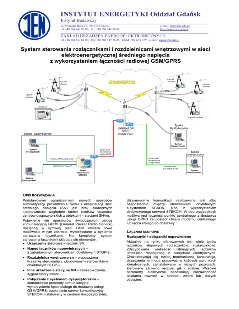 INSTYTUT ENERGETYKI Oddział Gdańsk Instytut Badawczy ul. Mikołaja Reja 27, 80-870 Gdańsk tel. (48 58) 349 82 00, fax: (48 58) 349 76 85 e-mail: [email protected] http://www.ien.gda.pl ZAKŁAD URZĄDZEŃ ENERGOELEKTRONICZNYCH tel. (48 58) 349 81 00, fax: (48 58) 349 76 85, GSM: 602 639 079, e-mail: [email protected] System sterowania rozłącznikami i rozdzielnicami wnętrzowymi w sieci elektroenergetycznej średniego napięcia z wykorzystaniem łączności radiowej GSM/GPRS Łącznik słupowy Łącznik słupowy Łącznik słupowy s s s Łącznik słupowy s Stacja SN s Łącznik słupowy Spółka Dystrybucyjna OPERATOR SIECI GSM/GPRS Spółka Dystrybucyjna System Dyspozytorski System Dyspozytorski Łącze stałe do operatora usługi GPRS Spółka Dystrybucyjna Łącze stałe do operatora usługi GPRS Protokół DNP3 (19,2 kbps) 60870-5-104 (sieć IP) Protokół DNP3 lub 60870-5-104 Serwer dedykowany STEKOM System Dyspozytorski System Dyspozytorski OPIS ROZWIĄZANIA Podstawowym ograniczeniem nowych sposobów automatyzacji prowadzenia ruchu i eksploatacji sieci średniego napięcia (SN) jest brak skutecznych i jednocześnie względnie tanich środków łączności centrów dyspozytorskich z obiektami - stacjami SN/nn. Pojawienie się operatorów świadczących usługę komunikacyjną GPRS (General Packet Radio Service) dostępną w cyfrowej sieci GSM otwiera nowe możliwości w tym zakresie, wykorzystane w systemie sterowania łącznikami. Na kompletny system sterowania łącznikami składają się elementóy: · Urządzenia sieciowe – łączniki SN; · Napęd łączników napowietrznych – z zabudowanym sterownikiem obiektowym STGP-2; · Rozdzielnica wnętrzowa sn – wyposażona w szafkę sterowania z wbudowanym sterownikiem obiektowym STGP-2; · Inne urządzenia stacyjne SN – zabezpieczenia, sygnalizatory zwarć. · Połączenie z systemem dyspozytorskim – standardowe protokoły komunikacyjne, wykorzystanie łącza stałego do dostawcy usługi GSM/GPRS, opcjonalnie serwer komunikacyjny STEKOM instalowany w centrum dyspozytorskim; Utrzymywanie komunikacji realizowane jest albo bezpośrednio między sterownikami obiektowymi a systemem SCADA, albo z wykorzystaniem dedykowanego serwera STEKOM. W obu przypadkach możliwa jest łączność punktu centralnego z dostawcą usługi GPRS za pośrednictwem modemu centralnego lub łącza stałego do dostawcy. ŁĄCZNIKI SŁUPOWE Rozłączniki i odłączniki napowietrzne Aktualnie na rynku oferowanych jest wiele typów łączników słupowych (odłączników, rozłączników). Zdecydowana większość istniejących łączników umożliwia współpracę z napędami elektrycznymi. Charakteryzują się trwałą mechaniczną konstrukcją. Urządzenia te mogą pracować w każdych warunkach klimatycznych, zainstalowane w różnych pozycjach, sterowane zarówno ręcznie, jak i zdalnie. Wysokie parametry elektryczne zapewniają niezawodność działania również w stanach zwarć lub dużych obciążeń. Szafka sterowania i napędu dla łącznika napowietrznego SRS W celu zdalnego sterowania łącznikami każdy napęd ręczny może zostać zastąpiony przez napęd silnikowy ze sterowaniem zdalnym, lokalnym (przyciskami) i ręcznym (korba). Szafka sterowania i napędu posiada zabezpieczenia związane ze sterowaniem łącznika: elektryczne i mechaniczne oraz sygnalizację niezbędną do prowadzenia zdalnego nadzoru i sterowania. Napęd może zostać zablokowany mechanicznie za pomocą kłódki, co zapobiega użyciu zarówno mechanizmu ręcznego jak i silnikowego. Niezależnie od zdalnego sterowania możliwe jest również dokonanie operacji łączeniowej na miejscu za pomocą przycisków lub przy użyciu korby. W szafce montowane są następujące urządzenia: napęd silnikowy, sterownik GPRS typu STGP produkcji Instytut Energetyki oddział Gdańsk – specjalnie zaprojektowany dla tych zastosowań, akumulatory, zasilacz, grzałka, zabezpieczenia elektryczne itp. STACJA SN WNĘTRZOWA · Współpraca z systemem GSM/GPRS w przekazywaniu informacji do/ze sterowników obiektowych, rejestracja zdarzeń nadsyłanych spontanicznie ze sterowników obiektowych; · Prezentacja danych i ich udostępnianie dla innych użytkowników (programów) poprzez dostęp do bazy danych lub określony protokół komunikacyjny. Dane zapisane w bazie danych udostępniane są poprzez usługi ftp, strony WWW lub dedykowane aplikacje. Zaletą funkcjonalną zastosowania serwera dedykowanego STEKOM jest zapewnienie jednorodnego sprzęgu komunikacyjnego z istniejącymi systemami dyspozytorskimi SCADA oraz utrzymywanie bieżącej komunikacji ze sterownikami obiektowymi niezależnie od systemu dyspozytorskiego. Serwer archiwizuje ponadto wszystkie informacje dotyczące sygnalizacji i sterowań w sieci SN oraz umożliwia przygotowanie statystyk łączności i liczby zadziałań łączników SN. Serwer STEKOM może współpracować również z innymi sterownikami obiektowymi GPRS w tym również z STGP-1 produkcji Instytutu Energetyki. Rozdzielnica wnętrzowa Serwer STEKOM umożliwia także zdalne sterowanie oraz monitorowanie pracy rozdzielnic wnętrzowych przeznaczonych do sieci rozdzielczych średniego napięcia, w których instalowany jest sterownik STGP-2. Wewnątrz rozdzielnicy znajdują się wszystkie elementy wysokonapięciowe, tj. szyny zbiorcze i aparatura łączeniowa jak wyłącznik transformatorowy, rozłącznik liniowy, rozłącznik bezpiecznikowy, wyłącznik oraz uziemniki. OFERTA DLA SPÓŁEK DYSTRYBUCYJNYCH Szafka telesterowania SRT Szafki sterowania umieszczana w rozdzielnicy wnętrzowej jest wyposażana w sterowniki obiektowe (telesterowania) typu STGP-2. Sterownik działa w sieci GSM/GPRS i wraz z modułami rozszerzeń umożliwia obsługę do 128 wejść dwustanowych, do 64 wyjść dwustanowych oraz do 8 wejść analogowych. Dostawa elementów WSPÓŁPRACA Z INNYMI URZADZENIAMI System sterowania może współpracować z innymi urządzeniami montowanymi na obiektac
