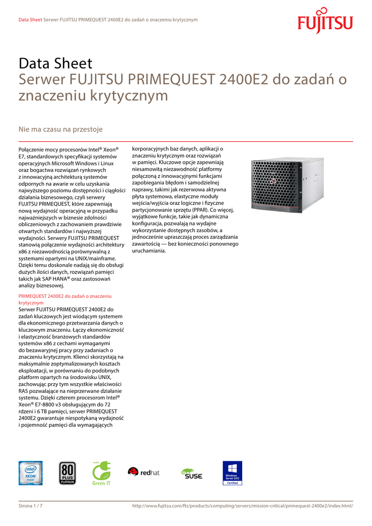Data Sheet Serwer FUJITSU PRIMEQUEST 2400E2 do zadań o