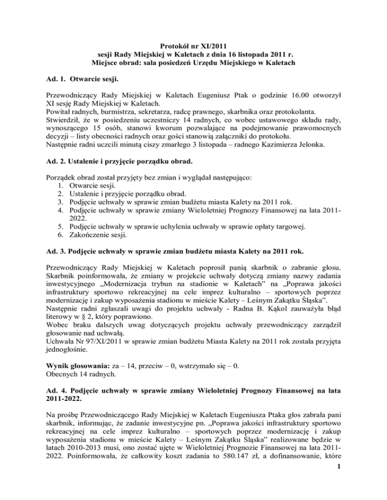 Protokół nr XI/2011 sesji Rady Miejskiej w Kaletach z dnia 16 listopada 2011 r. Miejsce obrad: sala posiedzeń Urzędu Miejskiego w Kaletach Ad. 1. Otwarcie sesji. Przewodniczący Rady Miejskiej w Kaletach Eugeniusz Ptak o godzinie 16.00 otworzył XI sesję Rady Miejskiej w Kaletach. Powitał radnych, burmistrza, sekretarza, radcę prawnego, skarbnika oraz protokolanta. Stwierdził, że w posiedzeniu uczestniczy 14 radnych, co wobec ustawowego składu rady, wynoszącego 15 osób, stanowi kworum pozwalające na podejmowanie prawomocnych decyzji – listy obecności radnych oraz gości stanowią załączniki do protokołu. Następnie radni uczcili minutą ciszy zmarłego 3 listopada – radnego Kazimierza Jelonka. Ad. 2. Ustalenie i przyjęcie porządku obrad. Porządek obrad został przyjęty bez zmian i wyglądał następująco: 1. Otwarcie sesji. 2. Ustalenie i przyjęcie porządku obrad. 3. Podjęcie uchwały w sprawie zmian budżetu miasta Kalety na 2011 rok. 4. Podjęcie uchwały w sprawie zmiany Wieloletniej Prognozy Finansowej na lata 20112022. 5. Podjęcie uchwały w sprawie uchylenia uchwały w sprawie opłaty targowej. 6. Zakończenie sesji. Ad. 3. Podjęcie uchwały w sprawie zmian budżetu miasta Kalety na 2011 rok. Przewodniczący Rady Miejskiej w Kaletach poprosił panią skarbnik o zabranie głosu. Skarbnik poinformowała, że zmiany w projekcie uchwały dotyczą zmiany nazwy zadania inwestycyjnego „Modernizacja trybun na stadionie w Kaletach” na „Poprawa jakości infrastruktury sportowo rekreacyjnej na cele imprez kulturalno – sportowych poprzez modernizację i zakup wyposażenia stadionu w mieście Kalety – Leśnym Zakątku Śląska”. Następnie radni zgłaszali uwagi do projektu uchwały - Radna B. Kąkol zauważyła błąd literowy w § 2, który poprawiono. Wobec braku dalszych uwag dotyczących projektu uchwały przewodniczący zarządził głosowanie nad uchwałą. Uchwała Nr 97/XI/2011 w sprawie zmian budżetu Miasta Kalety na 2011 rok została przyjęta jednogłośnie. Wynik głosowania: za – 14, przeciw – 0, wstrzymało się – 0. Obecnych 14 radnych. Ad. 4. Podjęcie uchwały w sprawie zmiany Wieloletniej Prognozy Finansowej na lata 2011-2022. Na prośbę Przewodniczącego Rady Miejskiej w Kaletach Eugeniusza Ptaka głos zabrała pani skarbnik, informując, że zadanie inwestycyjne pn. „Poprawa jakości infrastruktury sportowo rekreacyjnej na cele imprez kulturalno – sportowych poprzez modernizację i zakup wyposażenia stadionu w mieście Kalety – Leśnym Zakątku Śląska” realizowane będzie w latach 2010-2013 musi, ono zostać ujęte w Wieloletniej Prognozie Finansowej na lata 20112022. Poinformowała, że całkowity koszt zadania to 580.147 zł, a dofinansowanie, które 1 gmina dostałaby po zakwalifikowaniu projektu to 85% tej kwoty, odczytała również zakres zadania. Następnie głos zabrał radny J. Klimek pytając, czy o powyższe środki gmina będzie się dopiero starała czy są one już przydzielone, na co skarbnik odpowiedziała, że gmina składać będzie wniosek do konkursu o dofinansowanie z Unii Europejskiej. Wobec braku dalszych pytań przewodniczący zarządził głosowanie nad uchwałą. Uchwała Nr 98/XI/2011 w sprawie zmiany Wieloletniej Prognozy Finansowej na lata 20112022 została przyjęta jednogłośnie. Wynik głosowania: za – 14, przeciw – 0, wstrzymało się – 0. Obecnych 14 radnych. Ad. 5. Podjęcie uchwały w sprawie uchylenia uchwały w sprawie opłaty targowej. Głos w sprawie zajął radca prawny informując, że projekt uchwały jest następstwem stanowiska jakie zostało podjęte na poprzedniej sesji w związku ze sprawą p. Czeluśniaka, a nowa uchwała podjęta zostanie na kolejnej sesji. Następnie zmieniono tytuł uchwały na: uchylająca uchwałę w sprawie opłaty targowej. W trakcie dyskusji nad projektem uchwały radny R. Sendel pytał o nową lokalizację dla targowiska, burmistrz odpowiedział, że jest kilka koncepcji, ale zostaną one przedstawione podczas posiedzeń komisji przed następną sesją, radna m. Wiatrek wyraziła zadowolenie w związku z uchyleniem uchwały, podtrzymując, że gdyby uchwała zaczęła obowiązywać byłaby krzywdząca dla mieszkańców. Wypowiedział się również burmistrz, informując, że również liczy się z mniej zamożnymi mieszkańcami i uchwała była następstwem pomysłu przeniesienia targowiska a nie jego zlikwidowania. W związku z wyczerpaniem dyskusji nad projektem uchwały przewodniczący E. Ptak odczytał jego treść i zarządził głosowanie. Uchwała Nr 99/XI/2011 uchylająca uchwałę w sprawie opłaty targowej została przyjęta jednogłośnie. Wynik głosowania: za – 14, przeciw – 0, wstrzymało się – 0. Obecnych 14 radnych. W związku z obecnością na sesji mieszkańców ul. Leśnej przewodniczący E. Ptak postanowił udzielić im głosu wprowadzając do porządku obrad punkt 6. Sprawy różne. Co następnie zostało poddane głosowaniu. Wynik głosowania: za – 14, przeciw – 0, wstrzymało się – 0. Obecnych 14 radnych. Ad. 6. Sprawy różne. Mieszkańcy zwrócili się do Radnych z kolejną prośbą rozważenia możliwości poprawy stanu nawierzchni ul. Leśnej. Brak chodników oraz zniszczona trylinka utrudnia poruszanie się pieszym, rowerzystom oraz osobom niepełnosprawnym. Zaapelowali o to, aby w przyszłym roku wymienić ok. 80 mb. trylinki zaś w kolejnych latach wykonać projekt kanalizacji deszczowej oraz nawierzchni asfaltowej i chodnika, a w roku 2014 ostatecznie zrealizować projekt. W temacie tym wypowiedziała się również radna M. Wiatrek, która pisała interpelację w tej sprawie. W trakcie dyskusji, która się następnie wywiązała poruszano trudną sytuację dotyczącą stanu dróg gminnych oraz przyszłorocznego budżetu. Radna B. Kąkol potwierdziła słowa radej M. Wiatrek w sprawie próśb mieszkańców i opowiedziała się za koniecznością wyremontowania tej drogi, z uwagi na niep