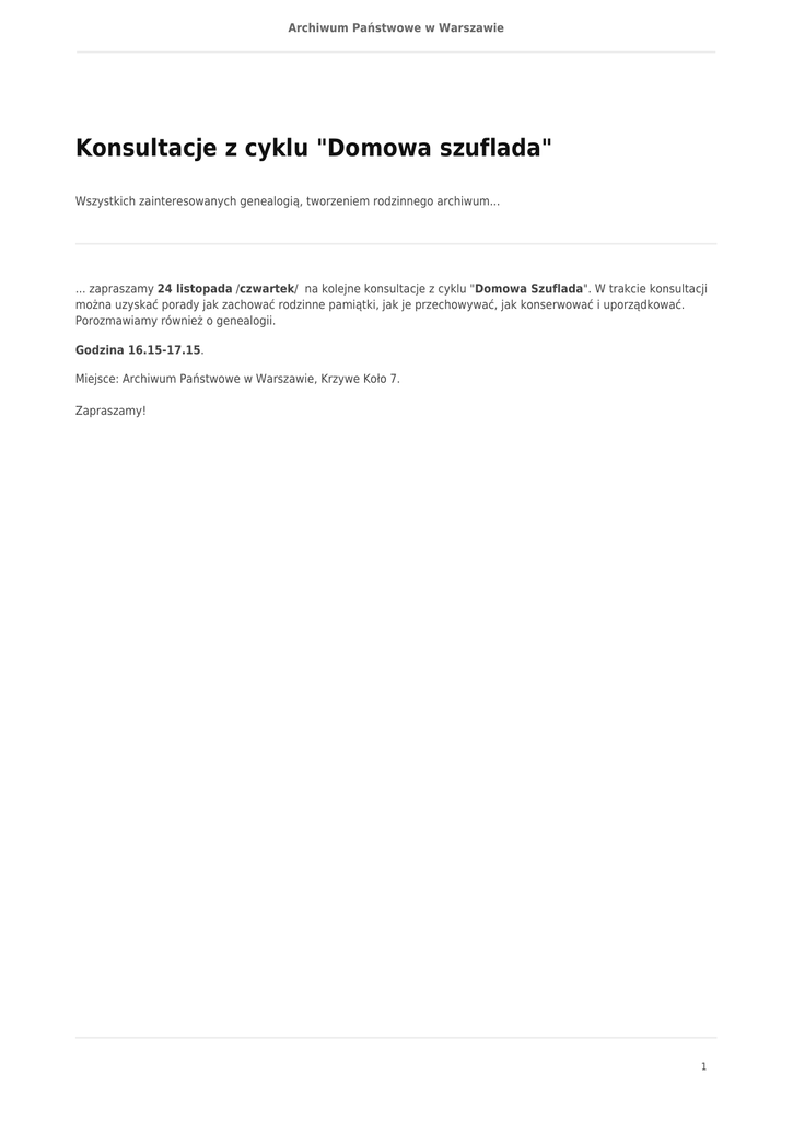 Archiwum Państwowe w Warszawie Konsultacje z cyklu "Domowa szuflada" Wszystkich zainteresowanych genealogią, tworzeniem rodzinnego archiwum... ... zapraszamy 24 listopada /czwartek/ na kolejne konsultacje z cyklu "Domowa Szuflada". W trakcie konsultacji można uzyskać porady jak zachować rodzinne pamiątki, jak je przechowywać, jak konserwować i uporządkować. Porozmawiamy również o genealogii. Godzina 16.15-17.15. Miejsce: Archiwum Państwowe w Warszawie, Krzywe Koło 7. Zapraszamy! 1