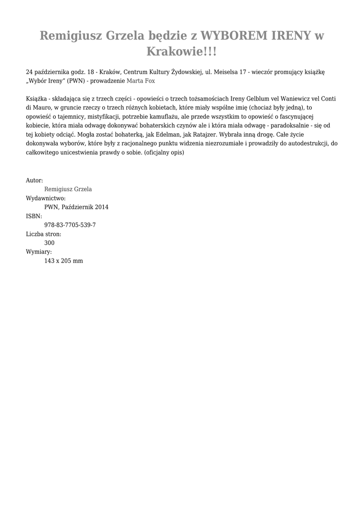 Remigiusz Grzela będzie z WYBOREM IRENY w Krakowie!!! 24 października godz. 18 - Kraków, Centrum Kultury Żydowskiej, ul. Meiselsa 17 - wieczór promujący książkę „Wybór Ireny” (PWN) - prowadzenie Marta Fox Książka - składająca się z trzech części - opowieści o trzech tożsamościach Ireny Gelblum vel Waniewicz vel Conti di Mauro, w gruncie rzeczy o trzech różnych kobietach, które miały wspólne imię (chociaż były jedną), to opowieść o tajemnicy, mistyfikacji, potrzebie kamuflażu, ale przede wszystkim to opowieść o fascynującej kobiecie, która miała odwagę dokonywać bohaterskich czynów ale i która miała odwagę - paradoksalnie - się od tej kobiety odciąć. Mogła zostać bohaterką, jak Edelman, jak Ratajzer. Wybrała inną drogę. Całe życie dokonywała wyborów, które były z racjonalnego punktu widzenia niezrozumiałe i prowadziły do autodestrukcji, do całkowitego unicestwienia prawdy o sobie. (oficjalny opis) Autor: Remigiusz Grzela Wydawnictwo: PWN, Październik 2014 ISBN: 978-83-7705-539-7 Liczba stron: 300 Wymiary: 143 x 205 mm