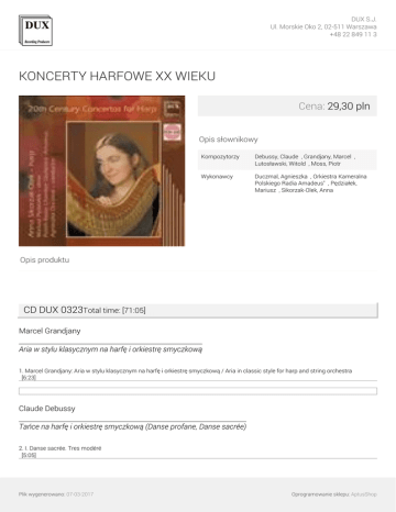 DUX S.J. Ul. Morskie Oko 2, 02-511 Warszawa +48 22 849 11 3 KONCERTY HARFOWE XX WIEKU Cena: 29,30 pln Opis słownikowy Kompozytorzy Debussy, Claude ∎, Grandjany, Marcel ∎, Lutosławski, Witold ∎, Moss, Piotr ∎ Wykonawcy Duczmal, Agnieszka ∎, Orkiestra Kameralna Polskiego Radia Amadeus" ∎, Pędziałek, Mariusz ∎, Sikorzak-Olek, Anna ∎ Opis produktu CD DUX 0323Total time: [71:05] Marcel Grandjany Aria w stylu klasycznym na harfę i orkiestrę smyczkową 1. Marcel Grandjany: Aria w stylu klasycznym na harfę i orkiestrę smyczkową / Aria in classic style for harp and string orchestra [6:23] Claude Debussy Tańce na harfę i orkiestrę smyczkową (Danse profane, Danse sacrée) 2. I. Danse sacrée. Tres modéré [5:05] Plik wygenerowano: 07-03-2017 Oprogramowanie sklepu: AptusShop DUX S.J. Ul. Morskie Oko 2, 02-511 Warszawa +48 22 849 11 3 3. II. Danse profane. Modéré [5:26] Witold Lutosławski Koncert podwójny na obój i harfę 4. I. Rapsodico [6:31] 5. II. Dolente [8:15] 6. III. Marciale e grotesco [7:34] Piotr Moss Rémanences na harfę celtycką i smyczki 7. I. Andantino [5:40] 8. II. Andante [8:26] 9. III. Allegro [7:14] 10. IV. Adagio [10:29] Wykonawcy: Orkiestra Kameralna Polskiego Radia Amadeus Agnieszka Duczmal /dyrygent/ Anna Sikorzak-Olek /harfa/ Mariusz Pędziałek /obój/ Plik wygenerowano: 07-03-2017 Powered by TCPDF (www.tcpdf.org) Oprogramowanie sklepu: AptusShop