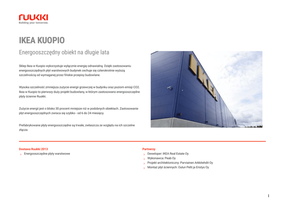 IKEA KUOPIO Energooszczędny obiekt na długie lata Sklep Ikea w Kuopio wykorzystuje wyłącznie energię odnawialną. Dzięki zastosowaniu energooszczędnych płyt warstwowych budynek cechuje się czterokrotnie wyższą szczelnością od wymaganej przez fińskie przepisy budowlane. Wysoka szczelność zmniejsza zużycie energii grzewczej w budynku oraz poziom emisji CO2. Ikea w Kuopio to pierwszy duży projekt budowlany, w którym zastosowano energooszczędne płyty ścienne Ruukki. Zużycie energii jest o blisko 30 procent mniejsze niż w podobnych obiektach. Zastosowanie płyt energooszczędnych zwraca się szybko - od 6 do 24 miesięcy. Prefabrykowane płyty energooszczędne są trwałe, zwłaszcza ze względu na ich szczelne złącza. Dostawa Ruukki 2013 Energooszczędne płyty warstwowe Partnerzy Deweloper: IKEA Real Estate Oy Wykonawca: Peab Oy Projekt architektoniczny: Parviainen Arkkitehdit Oy Montaż płyt ściennych: Oulun Pelti ja Eristys Oy 1