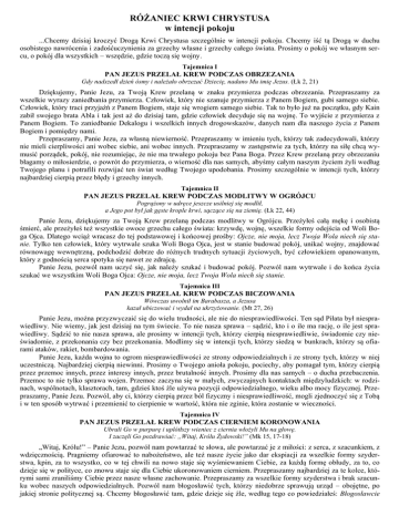 RÓŻANIEC KRWI CHRYSTUSA w intencji pokoju ...Chcemy dzisiaj kroczyć Drogą Krwi Chrystusa szczególnie w intencji pokoju. Chcemy iść tą Drogą w duchu osobistego nawrócenia i zadośćuczynienia za grzechy własne i grzechy całego świata. Prosimy o pokój we własnym sercu, o pokój dla wszystkich – wszędzie, gdzie toczą się wojny. Tajemnica I PAN JEZUS PRZELAŁ KREW PODCZAS OBRZEZANIA Gdy nadszedł dzień ósmy i należało obrzezać Dziecię, nadano Mu imię Jezus. (Łk 2, 21) Dziękujemy, Panie Jezu, za Twoją Krew przelaną w znaku przymierza podczas obrzezania. Przepraszamy za wszelkie wyrazy zaniedbania przymierza. Człowiek, który nie szanuje przymierza z Panem Bogiem, gubi samego siebie. Człowiek, który traci przyjaźń z Panem Bogiem, staje się wrogiem samego siebie. Tak to było już na początku, gdy Kain zabił swojego brata Abla i tak jest aż do dzisiaj tam, gdzie człowiek decyduje się na wojnę. To wyjście z przymierza z Panem Bogiem. To zaniedbanie Dekalogu i wszelkich innych drogowskazów, danych nam dla naszego życia z Panem Bogiem i pomiędzy nami. Przepraszamy, Panie Jezu, za własną niewierność. Przepraszamy w imieniu tych, którzy tak zadecydowali, którzy nie mieli cierpliwości ani wobec siebie, ani wobec innych. Przepraszamy w zastępstwie za tych, którzy na siłę chcą wymusić porządek, pokój, nie rozumiejąc, że nie ma trwałego pokoju bez Pana Boga. Przez Krew przelaną przy obrzezaniu błagamy o miłosierdzie, o powrót do przymierza, o wierność dla nas samych, abyśmy całym naszym życiem żyli według Twojego planu i potrafili rozwijać ten świat według Twojego upodobania. Prosimy szczególnie w intencji tych, którzy najbardziej cierpią przez błędy i grzechy innych. Tajemnica II PAN JEZUS PRZELAŁ KREW PODCZAS MODLITWY W OGRÓJCU Pogrążony w udręce jeszcze usilniej się modlił, a Jego pot był jak gęste krople krwi, sączące się na ziemię. (Łk 22, 44) Panie Jezu, dziękujemy za Twoją Krew przelaną podczas modlitwy w Ogrójcu. Przeżyłeś całą mękę i osobistą śmierć, ale przeżyłeś też wszystkie owoce grzechu całego świata: krzywdę, wojnę, wszelkie formy odejścia od Woli Boga Ojca. Dlatego wciąż wracasz do tej podstawowej i końcowej prośby: Ojcze, nie moja, lecz Twoja Wola niech się stanie. Tylko ten człowiek, który wytrwale szuka Woli Boga Ojca, jest w stanie budować pokój, unikać wojny, znajdować równowagę wewnętrzną, podchodzić dobrze do różnych trudnych sytuacji życiowych, być człowiekiem opanowanym, który z godnością serca spotyka się nawet ze zdrajcą. Panie Jezu, pozwól nam uczyć się, jak należy szukać i budować pokój. Pozwól nam wytrwale i do końca życia szukać we wszystkim Woli Boga Ojca: Ojcze, nie moja, lecz Twoja Wola niech się stanie. Tajemnica III PAN JEZUS PRZELAŁ KREW PODCZAS BICZOWANIA Wówczas uwolnił im Barabasza, a Jezusa kazał ubiczować i wydał na ukrzyżowanie. (Mt 27, 26) Panie Jezu, można przyzwyczaić się do wielu trudności, ale nie do niesprawiedliwości. Ten sąd Piłata był niesprawiedliwy. Nie wiemy, jak jest dzisiaj na tym świecie. To nie nasza sprawa – sądzić, kto i o ile ma rację, o ile jest sprawiedliwy. Sądzić to nie nasza sprawa, ale prosimy w intencji tych, którzy cierpią niesprawiedliwie, świadomie czy nieświadomie, z przekonania czy bez przekonania. Modlimy się w intencji tych, którzy siedzą w bunkrach, którzy są ofiarami ataków, rakiet, bombardowania. Panie Jezu, każda wojna to ogrom niesprawiedliwości ze strony odpowiedzialnych i ze strony tych, którzy w niej uczestniczą. Najbardziej cierpią niewinni. Prosimy o Twojego anioła pokoju, pociechy, aby pomagał tym, którzy cierpią przez przemoc innych, przez interesy innych, przez brutalność innych. Prosimy dla nas samych – o ducha przebaczenia. Przemoc to nie tylko sprawa wojen. Przemoc zaczyna się w małych, zwyczajnych kontaktach międzyludzkich: w rodzinach, wspólnotach, klasztorach, tam, gdzieś ktoś źle używa pozycji odpowiedzialnego, wieku albo mocy fizycznej. Przepraszamy, Panie Jezu. Pozwól, aby ci, którzy cierpią przez ból fizyczny i niesprawiedliwość, mogli zjednoczyć się z Tobą i w ten sposób wytrwać i przemienić to cierpienie w wartość, która nie zginie, która zostanie w wieczności. Tajemnica IV PAN JEZUS PRZELAŁ KREW PODCZAS CIERNIEM KORONOWANIA Ubrali Go w purpurę i uplótłszy wieniec z ciernia włożyli Mu na głowę. I zaczęli Go pozdrawiać: „Witaj, Królu Żydowski!” (Mk 15, 17-18) „Witaj, Królu!” – Panie Jezu, pozwól nam powtarzać te słowa, ale powtarzać je z miłości: z serca, z szacunkiem, z wdzięcznością. Pragniemy ofiarować to nabożeństwo, ale też nasze życie jako dar ekspiacji za wszelkie formy szyderstwa, kpin, za to wszystko, co w tej chwili na nowo staje się wyśmiewaniem Ciebie, za każdą formę obłudy, za to, co dzieje się w polityce, co znowu staje się dla Ciebie ukoronowaniem cierniem. Przepraszamy najbardziej za te kolce, którymi sami zraniliśmy Ciebie przez nasze własne zachowanie. Przepraszamy za wszelkie formy szyderstwa i brak szacunku wobec naszych odpowiedzialnych. Pozwól nam błogosławić tych, którzy niedobrze sprawują urząd – obojętne, po jakiej stronie politycznej są. Chcemy błogosławić tam, gdzie dzieje się źle, według tego co powiedziałeś: Błogosławcie tym, którzy wam urągają. Ty modliłeś się w milczeniu. Błogosławiłeś w swoim sercu tych, którzy włożyli Tobie na głowę koronę, przez którą przelałeś tyle Krwi. Przepraszamy. Pozwól nam patrzeć na wszystkie te sprawy polityczne, które w tej chwili poruszają cały świat, przez tajemnicę Twojej czerwonej korony. Tajemnica V PAN JEZUS PRZELAŁ KREW NA DRODZE KRZYŻOWEJ A On sam, dźwigając krzyż, wszedł na miejsce zwane Miejscem Czaszki, które po hebrajsku nazywa się Golgota. (J 19, 17) Panie Jezu, droga zbawienia, droga do pokoju jest drog