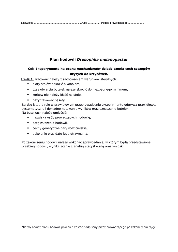 Nazwiska.............................................................. Grupa …............. Podpis prowadzącego...................... Plan hodowli Drosophila melanogaster Cel: Eksperymentalna ocena mechanizmów dziedziczenia cech szczepów użytych do krzyżówek. UWAGA: Pracować należy z zachowaniem warunków sterylnych: blaty stołów odkazić alkoholem, czas otwarcia butelek należy skrócić do niezbędnego minimum, korków nie należy kłaść na stole, dezynfekować pęsety. Bardzo istotną rolę w prawidłowym przeprowadzeniu eksperymentu odgrywa prawidłowe, systematyczne i dokładne notowanie wyników oraz oznaczanie butelek. Na butelkach należy umieścić: nazwiska osób prowadzących hodowlę, datę założenia hodowli, cechy genetyczne pary rodzicielskiej, pokolenie oraz datę jego otrzymania. Po zakończeniu hodowli należy wykonać sprawozdanie, w którym będą przedstawione: przebieg hodowli, wyniki łącznie z analizą statystyczną oraz wnioski. *Każdy arkusz planu hodowli powinien zostać podpisany przez prowadzącego po zakończeniu zajęć. Nazwiska.............................................................. Grupa …............. Podpis prowadzącego...................... tydzień 1 ……………. Przygotowanie szczepów do hodowli: wybieramy 2 różne szczepy do krzyżowania przygotowujemy po 10 „penicylinówek” dla każdego szczepu (20 na parę) umieszczamy w każdej buteleczce po JEDNEJ larwie lub poczwarce, dokładnie zamykając i podpisując każdą z nich. Nazwiska.............................................................. Grupa …............. Podpis prowadzącego...................... tydzień 2 ……………. Przygotowanie pokolenia rodzicielskiego P: po przepoczwarzeniu oznaczamy płeć uzyskanych muszek przygotowujemy 2 duże butelki z pożywką do hodowli (nałożyć po 1 krążku bibuły) wpuszczamy muszki do każdej z dwóch (krzyżówka dwukierunkowa): 1. 2 samce szczepu A x 3 samice szczepu B 2. 2 samce szczepu B x 3 samice szczepu A Nazwiska.............................................................. Grupa …............. Podpis prowadzącego...................... tydzień 3 ……………. Przygotowanie do wyklucia pokolenia F1: usuwamy osobniki rodzicielskie P (pokolenie F1 pozostaje w butelkach w postaci larw) całość pozostawiamy przez kolejny tydzień aż do pojawienia się imago F1 Nazwiska.............................................................. Grupa …............. Podpis prowadzącego...................... tydzień 4 ……………. Przygotowanie do hodowli pokolenia F2: wszystkie dorosłe owady F1 przenosimy na nowe pożywki (nie łączyć hodowli!) Nazwiska.............................................................. Grupa …............. Podpis prowadzącego...................... tydzień 5 ……………. Ocena pokolenia F1: przenosimy F1 do butelek bez pożywki, dokładnie zamykamy i zamrażamy określamy fenotypy wszystkich osobników oraz liczbę samców i samic w każdej klasie fenotypowej Przygotowanie do wyklucia pokolenia F2: butelki z pożywkami wraz z larwami F2 dokładnie zamykamy i pozostawiamy na kolejny tydzień. Nazwiska.............................................................. Grupa …............. Podpis prowadzącego...................... tydzień 6 ……………. Ocena pokolenia F2: imago zamrażamy określamy fenotypy wszystkich osobników oraz liczbę samców i samic w każdej klasie fenotypowej Nazwiska.............................................................. Grupa …............. Podpis prowadzącego...................... podsumowanie ……………. Obliczenia statystyczne: Obliczamy frekwencje fenotypów i płci i porównujemy je z wartościami oczekiwanymi (test χ2), wyciągamy wnioski Wykonujemy sprawozdanie z hodowli