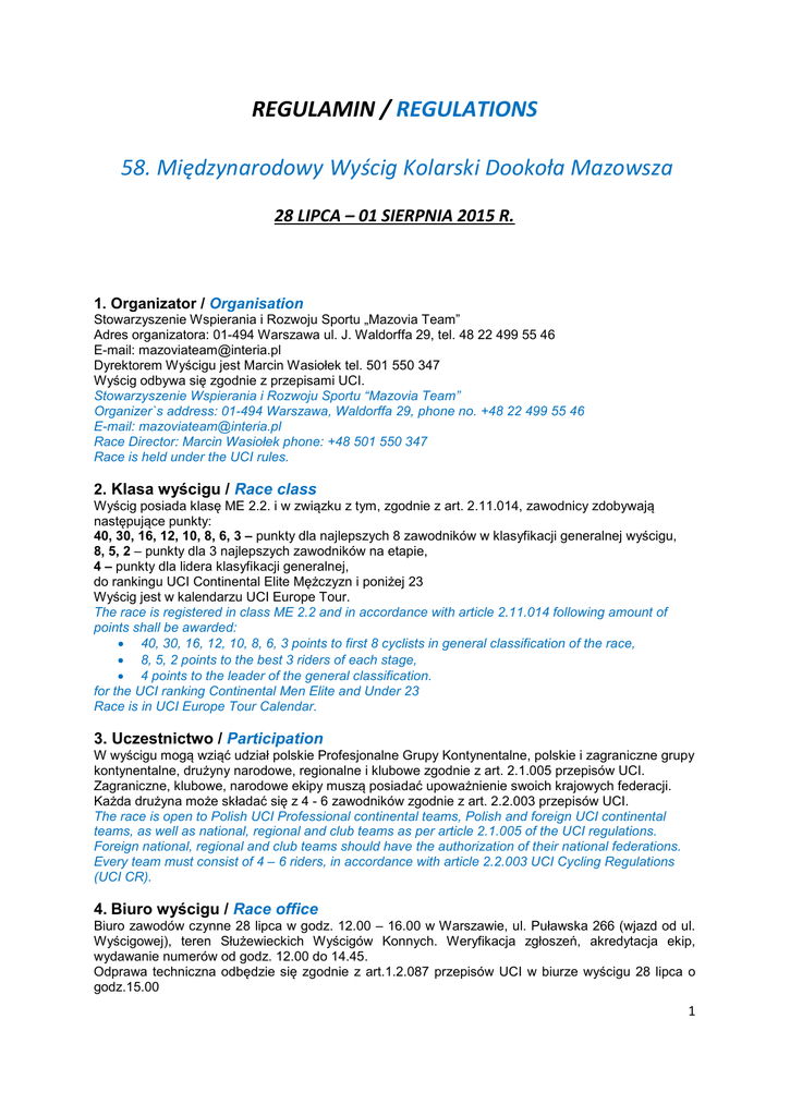REGULAMIN / REGULATIONS 58. Międzynarodowy Wyścig Kolarski Dookoła Mazowsza 28 LIPCA – 01 SIERPNIA 2015 R. 1. Organizator / Organisation Stowarzyszenie Wspierania i Rozwoju Sportu „Mazovia Team” Adres organizatora: 01-494 Warszawa ul. J. Waldorffa 29, tel. 48 22 499 55 46 E-mail: [email protected] Dyrektorem Wyścigu jest Marcin Wasiołek tel. 501 550 347 Wyścig odbywa się zgodnie z przepisami UCI. Stowarzyszenie Wspierania i Rozwoju Sportu “Mazovia Team” Organizer`s address: 01-494 Warszawa, Waldorffa 29, phone no. +48 22 499 55 46 E-mail: [email protected] Race Director: Marcin Wasiołek phone: +48 501 550 347 Race is held under the UCI rules. 2. Klasa wyścigu / Race class Wyścig posiada klasę ME 2.2. i w związku z tym, zgodnie z art. 2.11.014, zawodnicy zdobywają następujące punkty: 40, 30, 16, 12, 10, 8, 6, 3 – punkty dla najlepszych 8 zawodników w klasyfikacji generalnej wyścigu, 8, 5, 2 – punkty dla 3 najlepszych zawodników na etapie, 4 – punkty dla lidera klasyfikacji generalnej, do rankingu UCI Continental Elite Mężczyzn i poniżej 23 Wyścig jest w kalendarzu UCI Europe Tour. The race is registered in class ME 2.2 and in accordance with article 2.11.014 following amount of points shall be awarded: • 40, 30, 16, 12, 10, 8, 6, 3 points to first 8 cyclists in general classification of the race, • 8, 5, 2 points to the best 3 riders of each stage, • 4 points to the leader of the general classification. for the UCI ranking Continental Men Elite and Under 23 Race is in UCI Europe Tour Calendar. 3. Uczestnictwo / Participation W wyścigu mogą wziąć udział polskie Profesjonalne Grupy Kontynentalne, polskie i zagraniczne grupy kontynentalne, drużyny narodowe, regionalne i klubowe zgodnie z art. 2.1.005 przepisów UCI. Zagraniczne, klubowe, narodowe ekipy muszą posiadać upoważnienie swoich krajowych federacji. Każda drużyna może składać się z 4 - 6 zawodników zgodnie z art. 2.2.003 przepisów UCI. The race is open to Polish UCI Professional continental teams, Polish and foreign UCI continental teams, as well as national, regional and club teams as per article 2.1.005 of the UCI regulations. Foreign national, regional and club teams should have the authorization of their national federations. Every team must consist of 4 – 6 riders, in accordance with article 2.2.003 UCI Cycling Regulations (UCI CR). 4. Biuro wyścigu / Race office Biuro zawodów czynne 28 lipca w godz. 12.00 – 16.00 w Warszawie, ul. Puławska 266 (wjazd od ul. Wyścigowej), teren Służewieckich Wyścigów Konnych. Weryfikacja zgłoszeń, akredytacja ekip, wydawanie numerów od godz. 12.00 do 14.45. Odprawa techniczna odbędzie się zgodnie z art.1.2.087 przepisów UCI w biurze wyścigu 28 lipca o godz.15.00 1 At the start, the race office shall be open starting on Tuesday, 28 July from 12:00 to 16:00 in the race office located at the following address: Warsaw, ul. Puławska 266 (entrance from Wyścigowa), the area of Hippodrome Służewiec. Verification of applications, issuing accreditations of teams and start numbers will take place at the race office on Tuesday, 28 July from 12:00 to 14:45 The technical briefing in accordance with article 1.2.087 of the UCI regulations, in the presence of the Members of the Commissaires’ Panel will be held at the race office July 28 at 15.00. 5. Kolejność startu na prologu - jazda indywidualna na czas / Starting order for individual time trial Prolog zostanie rozegrany jako jazda indywidualna na czas na dystansie 2500 m. Zawodnicy startują co pół minuty według klucza 6, 5, 4, 3, 2, 1 Czyli: pierwszy zawodnik numer 6, 16, 26, 36, 46, 56, itd. dla wszystkich drużyn, Zgodnie z przepisami art. 2.6.025 przepisów UCI: - czas będzie mierzony z dokładnością do 0,01 sek., a do klasyfikacji podawany jest w pełnych sekundach. Zwycięzca otrzymuje koszulkę lidera wyścigu – indywidualna klasyfikacja generalna. 2. zawodnik otrzymuje koszulkę lidera klasyfikacji aktywnego. 3. zawodnik otrzymuje koszulkę lidera klasyfikacji górskiej. Zawodnik spełniający wymogi U-23 otrzymuje koszulkę lidera klasyfikacji U-23. Klasyfikację na prologu wlicza się do klasyfikacji generalnej indywidualnej i drużynowej. The prologue will be held as an individual time trial, 2500 m long. Riders start every each half minute in order: 6, 5, 4, 3, 2, 1. Which means that the first starting rider will be a rider who has got no. 6, 16, 26, 36, 46, 56, etc. According to UCI article 2.6.025 time will be kept with accuracy to one-hundredth of a second. In General Classification time will be shown in whole seconds. st The winner of ITT shall wear the jersey of Individual General Classification leader during the 1 stage. The second best rider of ITT shall wear the jersey of Intermediate Sprints Classification leader during st the 1 stage. st The third best rider of ITT shall wear the jersey of Mountains Classification leader during the 1 stage. st The best U-23 rider shall wear the jersey of U23 Classification leader during the 1 stage. 6. Radio wyścigu / Radio Tour Radio Wyścigu będzie pracowało w języku polskim i angielskim, na kanale 1 na częstotliwości 82,1250 MHz. Radio Tour, will be broadcasted on channel 1 (82,1250 MHz) in polish and English. 7. Neutralna pomoc techniczna / Neutral vehicles Organizator zapewnia 3 odpowiednio wyposażone pojazdy neutralnej pomocy technicznej, poruszające się zgodnie z decyzją Komisarzy. Serwis zapewnia firma Harfa-Harryson, samochód Mavic. The Organizer provides 3 adequately equipped neutral technical support vehicles. Technical support will be provided by Harfa-Harryson company, Mavic car. 8. Przepisy dotyczące ostatnich 3 kilometrów / Accidents on the last three kilometers. W przypadku stwierdzenia przez sędziów kraksy lub defektu na ostatnich 3 km etapu ze startu wspólnego, obowiązują art.2.6.027 Przepisów UCI. In case of a duly noted fall, puncture or mechanical incident in the last thre