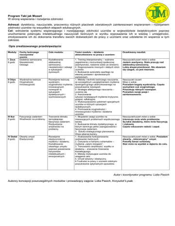 Program Taki jak Mozart W stronę wspierania i rozwijania zdolności Adresat: dyrektorzy, nauczyciele, pracownicy różnych placówek oświatowych zainteresowani wspieraniem i rozwijaniem zdolności uczniów na wszystkich etapach edukacyjnych. Cel: wdrożenie systemu wspierającego i rozwijającego zdolności uczniów w województwie świętokrzyskim poprzez uruchomienie potencjału intelektualnego nauczycieli twórczych w wyniku wyposażenia ich w wiedzę i umiejętności, zmotywowanie ich do dokonania transferu swoich doświadczeń do pracy z uczniami oraz udzielenie im wsparcia w tym zakresie. Opis zrealizowanego przedsięwzięcia: Moduły: I Zeus 8 godz Cechy twórczego nauczyciela/ ucznia: Dodatnia samoocena Niezależność Odwaga II Odys 8 godz. Wyobraźnia twórcza Oryginalność Innowacyjność III Ikar 8 godz. Fascynacja zadaniem Wrażliwość na problemy IV Dedal Otwarty umysł 8 godz. Elastyczność Cele modułu: Kształtowanie adekwatnej samooceny , niezależności i odwagi w sytuacjach życiowych Treści modułu – działania ukierunkowane na pracę z uczniem: 1. Trening interpersonalny – wybrane zagadnienia z komunikacji społecznej (asertywność, radzenie sobie ze stresem). 2. Diagnozowanie mocnych i słabych stron uczniów. 3. Budowanie autorytetu opartego na własnej postawie i aprobowanych wartościach. Rozwijanie twórczej 1. Metody i techniki twórczego nauczania, wyobraźni, ze szczególnym uwzględnieniem myślenia oryginalności myślenia, dywergencyjnego ukierunkowanego na innowacyjnych poszukiwanie rozwiązań. rozwiązań w 2. Strategie efektywnego nauczania – sytuacjach uczenia się. dydaktycznych i 2. Aranżowanie wychowawczych sytuacji rozwijających myślenie krytyczne, pytajne, refleksyjne. 3. Wykorzystywanie uzdolnień specjalnych uczniów w różnych sytuacjach dydaktycznych. 4. Promowanie oryginalności i innowacyjności myślenia i działania uczniów. Tworzenie klimatu 1. Skupianie uwagi uczniów na sprzyjającego interesujących problemach współczesnego fascynacji zadaniem. świata. Rozbudzanie 2. Budowanie klimatu dydaktycznego, w wrażliwości na którym dominuje pełne zaangażowanie i problemy. fascynacja zadaniem. 3. Sztuka strategicznego planowania. Wizja własnej kariery. Rozwijanie 1. Analizowanie funkcjonowania elastyczności w osobowości twórczych. myśleniu i działaniu. 2. Ćwiczenia w łamaniu schematów – Kształtowanie myślenie „całym mózgiem”. otwartego umysłu 3. Trenowanie cierpliwości, wysiłku w poprzez poszerzanie działaniu – znaczenie Oceniania horyzontów Kształtującego. intelektualnych i 4. Metody motywujące uczniów do emocjonalnych. osiągania celu. 5. Umysł sztywny i elastyczny. 6.Trudności w pracy z uczniem zdolnymposzukiwanie optymalnych sposobów. Oczekiwany rezultat: Nauczyciel/uczeń mówi o sobie: Jestem asertywny. Stale pracuję nad adekwatną samooceną. Lubię eksperymentować. Nie obawiam się czegoś, co jest nieznane. Nauczyciel /uczeń Mówi o sobie: Posiadam bogatą wyobraźnię. Często wymyślam coś oryginalnego. Poszukuję różnych rozwiązań. Posiadam swoje pasje i zainteresowania. Nauczyciel/uczeń mówi o sobie: Interesuje mnie wiele problemów. Są takie dziedziny, które mnie fascynują i ciekawią. Często odczuwam radość i zapał. Nauczyciel/uczeń mówi o sobie: Posiadam otwarty, „tolerancyjny” umysł. Potrafię łamać schematy. Stać mnie na wysiłek w dążeniu do celu. Autor i koordynator programu: Lidia Pasich Autorzy koncepcji poszczególnych modułów i prowadzący zajęcia: Lidia Pasich, Krzysztof Łysak
