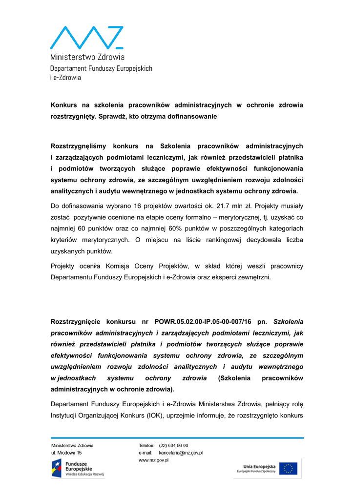 Konkurs na szkolenia pracowników administracyjnych w ochronie zdrowia rozstrzygnięty. Sprawdź, kto otrzyma dofinansowanie Rozstrzygnęliśmy konkurs na Szkolenia pracowników administracyjnych i zarządzających podmiotami leczniczymi, jak również przedstawicieli płatnika i podmiotów tworzących służące poprawie efektywności funkcjonowania systemu ochrony zdrowia, ze szczególnym uwzględnieniem rozwoju zdolności analitycznych i audytu wewnętrznego w jednostkach systemu ochrony zdrowia. Do dofinasowania wybrano 16 projektów owartości ok. 21.7 mln zł. Projekty musiały zostać pozytywnie ocenione na etapie oceny formalno – merytorycznej, tj. uzyskać co najmniej 60 punktów oraz co najmniej 60% punktów w poszczególnych kategoriach kryteriów merytorycznych. O miejscu na liście rankingowej decydowała liczba uzyskanych punktów. Projekty oceniła Komisja Oceny Projektów, w skład której weszli pracownicy Departamentu Funduszy Europejskich i e-Zdrowia oraz eksperci zewnętrzni. Rozstrzygnięcie konkursu nr POWR.05.02.00-IP.05-00-007/16 pn. Szkolenia pracowników administracyjnych i zarządzających podmiotami leczniczymi, jak również przedstawicieli płatnika i podmiotów tworzących służące poprawie efektywności funkcjonowania systemu ochrony zdrowia, ze szczególnym uwzględnieniem rozwoju zdolności analitycznych i audytu wewnętrznego w jednostkach systemu ochrony zdrowia (Szkolenia pracowników administracyjnych w ochronie zdrowia). Departament Funduszy Europejskich i e-Zdrowia Ministerstwa Zdrowia, pełniący rolę Instytucji Organizującej Konkurs (IOK), uprzejmie informuje, że rozstrzygnięto konkurs pn. Szkolenia pracowników administracyjnych i zarządzających podmiotami leczniczymi, jak również przedstawicieli płatnika i podmiotów tworzących służące poprawie efektywności funkcjonowania systemu ochrony zdrowia, ze szczególnym uwzględnieniem rozwoju zdolności analitycznych i audytu wewnętrznego w jednostkach systemu ochrony zdrowia (Szkolenia pracowników administracyjnych w ochronie zdrowia) nr POWR.05.02.00-IP.05-00-007/16, ogłoszony w ramach V Osi priorytetowej Wsparcie dla obszaru zdrowia, Działanie 5.2 Działania projakościowe i rozwiązania organizacyjne w systemie ochrony zdrowia ułatwiające dostęp do niedrogich, trwałych oraz wysokiej jakości usług zdrowotnych Programu Operacyjnego Wiedza Edukacja Rozwój i zatwierdzono listę wszystkich ocenianych projektów oraz listę projektów wybranych do dofinansowania. Jednocześnie, zgodnie z art. 44 ust. 5 ustawy z dnia 11 lipca 2014 r. o zasadach realizacji programów w zakresie polityki spójności finansowanych w perspektywie finansowej 2014–2020 (Dz. U. 2016 r. poz. 217), IOK przedstawia skład Komisji Oceny Projektów (KOP): - Pani Aleksandra Bednarska - Pan Łukasz Borek - Pani Marta Fijołek - Pan Grzegorz Kuczyński - Pani Agnieszka Kuzia - Pani Dorota Ludorowska - Pani Jolanta Meller - Pani Joanna Szczygielska - Pani Dorota Trojanowska - Pani Olga Wróblewska - Pan Kamil Żak Poniżej IOK zamieszcza listę wszystkich ocenionych projektów oraz listę projektów wybranych do dofinansowania. O miejscu na liście rankingowej decyduje liczba przyznanych punktów. Do dofinansowania zostały wybrane projekty, które zostały ocenione pozytywnie na etapie oceny formalno – merytorycznej, tj. bezwarunkowo uzyskały co najmniej 60 punktów oraz co najmniej 60% punktów spełniania kryteriów merytorycznych. w poszczególnych kategoriach oceny
