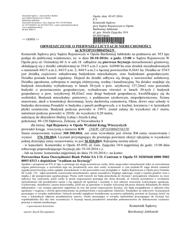 Komornik Sądowy (dawniej Rew.Bartło) przy Sądzie Rejonowym w Opolu Bartłomiej Jabłoński Kancelaria Komornicza Gen. Zajączka 18/4, 45-050 Opole tel. (077)4566831 fax (077)4537426 e-mail: [email protected] www.opolekomornik.pl BJ Km 3090/14 Opole, dnia 05-07-2016 P.T. Komornik Sądowy przy Sądzie Rejonowym w Opolu Bartłomiej Jabłoński ul. gen. Józefa Zajączka 18/4 45-050 Opole *0020001151256* OBWIESZCZENIE O PIERWSZEJ LICYTACJI NIERUCHOMOŚCI nr KWOP1O/00045562/9 Komornik Sądowy przy Sądzie Rejonowym w Opolu Bartłomiej Jabłoński na podstawie art. 953 kpc podaje do publicznej wiadomości, że: w dniu 20-10-2016r. o godz. 13:00 w Sądzie Rejonowym W Opolu przy ul. Ozimskiej 60 A w sali 18 odbędzie się pierwsza licytacja nieruchomości gruntowej, składającej się z działki zabudowanej nr 354/5 a.m.2 o pow. 0,0940 ha oraz działek niezabudowanych o numerach 442/5 a.m.2, 443/5 a.m. 2, 444/5 a.m.2 o łącznej powierzchni 0,5641 ha. Działka nr 354/5 jest działką częściowo zabudowaną budynkiem mieszkalnym, oraz budynkami gospodarczymi. Działka posiada kształt regularny. Dojazd do działki odbywa się drogą o nawierzchni asfaltowej. Działka ogrodzona, uzbrojona w energię elektryczną, wodną i kanalizacyjną. Na działce znajduje się budynek mieszkalny wybudowany w latach 30-tych o pow. użytkowej 157,26m2 oraz pozostałe budynki o przeznaczeniu gospodarczym, wybudowane również w latach 30-tych ( budynek gospodarczy o pow. iużytkowej 48,82m2 oraz drugi budynek gospodarczy, kwalifikujący się do rozbiórki). Budynek mieszkalny: parterowy, z poddaszem użytkowym, niepodpiwniczony. Ściany murowane, dach o konstrukcji drewnianej, kryty dachówką cementową. Okna, drzwi oraz schody w budynku drewniane.Posadzki w budynku z paneli podłogowych, a w kuchni, korytarzu i w lazienkach płytki ceramiczne. Budynek podczas powodzi w 1997r. został zalany do wysokości ok.1 metra, natomiast podczas powodzi w 2010r. do wysokości 0,20 metra. należącej do dłużników:Haliny Łabaj i Józefa Łabaj położonej: 49-120 Dąbrowa, Żelazna, ul Niewodnicka 4 dla której Sąd Rejonowy w Opolu Wydział Ksiąg Wieczystych prowadzi księgę wieczystą o numerze KW [NKW: OP1O/00045562/9] Suma oszacowania wynosi 368 200,00zł, zaś cena wywołania jest równa 3/4 sumy oszacowania i wynosi 276 150,00zł. Licytant przystępujący do przetargu powinien złożyć rękojmię w wysokości jednej dziesiątej sumy oszacowania, to jest 36 820,00zł. Rękojmię można uiścić: - w kancelarii Komornika w Opole 45-050, ul. Gen. Zajączka 18/4 najpóźniej do godz. 15.00 dnia roboczego poprzedzającego licytację (do 19-10-2016 r.), - lub na konto komornika najpóżniej do dnia 19-10-2016 r. na konto: Powszechna Kasa Oszczędności Bank Polski SA I O. Centrum w Opolu 53 10203668 0000 5002 0093 0313 z dopiskiem "wadium na licytację" << ODPIS >> Zgodnie z przepisem art.976 §1 kpc w przetargu nie mogą uczestniczyć osoby, które mogą nabyć nieruchomość tylko za zezwoleniem organu państwowego, a zezwolenia tego nie przedstawiły oraz inne osoby wymienione w tym artykule.W ciągu dwóch ostatnich tygodni przed licytacją wolno oglądać nieruchomość w dni powszednie oraz przeglądać w Sądzie Rejonowym w Opolu przy Ozimska 60 A pok. 116 odpis protokołu oszacowania nieruchomości, operat szacunkowy biegłego sądowego, wypis z rejestru gruntów wraz z mapką z akt postępowania egzekucyjnego. Prawa osób trzecich nie będą przeszkodą do licytacji i przysądzenia własności na rzecz nabywcy bez zastrzeżeń, jeżeli osoby te przed rozpoczęciem przetargu nie złożą dowodu, że wniosły powództwo o zwolnienie nieruchomości lub przedmiotów razem z nią zajętych od egzekucji i uzyskały w tym zakresie orzeczenie wstrzymujące egzekucję. Użytkowanie, służebności i prawa dożywotnika, jeżeli nie są ujawnione w księdze wieczystej lub przez złożenie dokumentu do zbioru dokumentów i nie zostaną zgłoszone najpóźniej na trzy dni przed rozpoczęciem licytacji, nie będą uwzględnione w dalszym toku egzekucji i wygasną z chwilą uprawomocnienia się postanowienia o przysądzeniu własności. Kandydaci na nabywców licytacyjnych pozostający w związku małżeńskim i których stosunki majątkowe kształtowane są umową małżeńską, powinni na licytację stawić się wraz z notarialnym odpisem przedmiotowej umowy. Osoby pozostające w związku małżeńskim przystępujące do licytacji bez współmałżónka (ki) aby móc uczestniczyć w licytacji muszą przedstawić notarialne pełnomocnictwo do dokonywania czynności prawnej w imieniu nieobecnego. z upoważnienia Komornika asesor Jacek Szczepaniec Komornik Sądowy Bartłomiej Jabłoński z upoważnienia Komornika asesor Jacek Szczepaniec Komornik Sądowy Bartłomiej Jabłoński