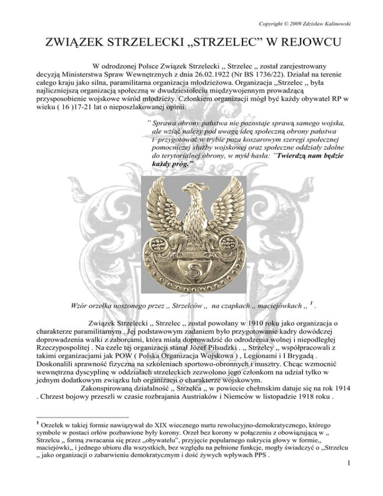 Copyright © 2009 Zdzisław Kalinowski ZWIĄZEK STRZELECKI „STRZELEC” W REJOWCU W odrodzonej Polsce Związek Strzelecki ,, Strzelec ,, został zarejestrowany decyzją Ministerstwa Spraw Wewnętrznych z dnia 26.02.1922 (Nr BS 1736/22). Działał na terenie całego kraju jako silna, paramilitarna organizacja młodzieżowa. Organizacja ,,Strzelec ,, była najliczniejszą organizacją społeczną w dwudziestoleciu międzywojennym prowadzącą przysposobienie wojskowe wśród młodzieży. Członkiem organizacji mógł być każdy obywatel RP w wieku ( 16 )17-21 lat o nieposzlakowanej opinii. ” Sprawa obrony państwa nie pozostaje sprawą samego wojska, ale wziąć należy pod uwagę ideę społeczną obrony państwa i przygotować w trybie poza koszarowym szeregi społecznej pomocniczej służby wojskowej oraz społeczne oddziały zdolne do terytorialnej obrony, w myśl hasła: ”Twierdzą nam będzie każdy próg.” Wzór orzełka noszonego przez ,, Strzelców ,, na czapkach ,, maciejówkach ,, 1 . Związek Strzelecki ,, Strzelec ,, został powołany w 1910 roku jako organizacja o charakterze paramilitarnym . Jej podstawowym zadaniem było przygotowanie kadry dowódczej doprowadzenia walki z zaborcami, która miała doprowadzić do odrodzenia wolnej i niepodległej Rzeczypospolitej . Na czele tej organizacji stanął Józef Piłsudzki . ,, Strzelcy ,, współpracowali z takimi organizacjami jak POW ( Polska Organizacja Wojskowa ) , Legionami i I Brygadą . Doskonalili sprawność fizyczna na szkoleniach sportowo-obronnych i musztry. Chcąc wzmocnić wewnętrzna dyscyplinę w oddziałach strzeleckich zezwolono jego członkom na udział tylko w jednym dodatkowym związku lub organizacji o charakterze wojskowym. Zakonspirowaną działalność ,, Strzelca ,, w powiecie chełmskim datuje się na rok 1914 . Chrzest bojowy przeszli w czasie rozbrajania Austriaków i Niemców w listopadzie 1918 roku . Orzełek w takiej formie nawiązywał do XIX wiecznego nurtu rewolucyjno-demokratycznego, którego symbole w postaci orłów pozbawione były korony. Orzeł bez korony w połączeniu z obowiązującą w ,, Strzelcu ,, formą zwracania się przez „obywatelu”, przyjęcie popularnego nakrycia głowy w formie,, maciejówki,, i jednego ubioru dla wszystkich, bez względu na pełnione funkcje, mogły świadczyć o ,,Strzelcu ,, jako organizacji o zabarwieniu demokratycznym i dość żywych wpływach PPS . 1 1 Copyright © 2009 Zdzisław Kalinowski Struktury Związku Strzeleckiego ściśle współpracowały z organizacją POW i Strażą Kresową 2 ( Towarzystwem Straży Kresowej ). W odrodzonej Polsce forma organizacyjna związku przedstawiała się następująco: Na czele stał Zarząd Główny, wybierany przez Walny Zjazd Delegatów. W skład Zarządu Głównego wchodził z urzędu Komendant Główny ZS mianowany przez Ministra Spraw Wojskowych. Komendant Główny był zarazem pomocnikiem dyrektora Państwowego Urzędu Wychowania Fizycznego i Przysposobienia Wojskowego. Na stanowiska komendantów okręgów byli przydzielani oficerowie służby czynnej, którzy pełnili jednocześnie funkcję inspektorów WF i PW na terenie okręgów korpusów. Takie rozwiązanie dawało to ścisłe połączenie ZS,, Strzelec,, z aparatem państwowym. Na te kierownicze stanowiska kierowano oficerów ze służby czynnej przydzielonych przez ministra spraw wojskowych. Natomiast na niższych szczeblach organizacji ,, Strzeleckich ,, takich jak Komendy Powiatów i gmin funkcje instruktorskie pełnili oficerowie rezerwy . Komendami gminnymi byli podoficerowie rezerwy. .Struktura organizacyjna jednostki strzeleckiej: dowódca jednostki strzeleckiej ( batalion ) - oddział z-ca dowódcy ds. szkolenia z-ca dowódcy ds. logistyki pisarz jednostki strzeleckiej dowódcy kompanii dowódcy plutonów dowódcy drużyn ( kompania ) - pododdział ( pluton ) - ,, ( drużyna ) - ,, strzelcy Jednostka,, Strzelecka ,, jako oddział składał się z pododdziałów. Najmniejszym pododdziałem była drużyna (7 osób). Trzy drużyny tworzyły pluton, trzy plutony to kompania, natomiast trzy kompanie składały się na batalion. --------------------- ,, ---------------------------Dotychczasowa tajna organizacja działająca pod zaborami z chwila odzyskania przez Polskę niepodległości stała się otwarta na szeroki dopływ członków. W krótkim czasie zyskała dużą popularność dzięki atrakcyjnej ofercie prowadzonych zajęć , które podzielono na cztery działy : wychowanie obywatelskie , przysposobienie wojskowe , wychowanie fizyczne , przysposobienie zawodowe rolnicze. W ramach przysposobienia wojskowego tworzono sekcje strzelecko- sportowe . 2 Straż Kresowa została zorganizowana w Rejowcu w nocy z 11/12 lutego 1918 roku .Jej statut organizacyjny został przyjęty 22 kwietnia 1918 roku. Była to spontaniczna reakcja na znak protestu przeciwko postanowieniom Traktatu Brzeskiego. Straż Kresową inspirowała ,, OMN ,, Organizacja Młodzieży Narodowej ( Omen ) . ,, Sprawa chełmska ,, w znaczący sposób zaważyła na wzajemnych relacjach polsko – żydowsko – ukraińskich w Rejowcu . W dobitny sposób znalazło to swoje odzwierciedlenie w okresie dwudziestolecia międzywojennego i czasu okupacji . W moim przekonaniu jest to klucz do zrozumienia wielu problemów rejowieckich . Oznaki wzajemnych niechęci można było zaobserwować już od roku 1905. Natomiast z całą wyrazistością zarysowały się po roku 1912 , czyli wyodrębnienia Ziemi Chełmskiej i wcielania jej do cesarstwa rosyjskiego ( dnia 26 kwietnia / 9 maja 1912 roku w Dumie Państwowej postanowiono utworzy gubernię chełmską ) . Taki stan rzeczy doprowadził ,że każda strata posiadania przez Polaków na rzecz innej nacji a zwłaszcza żydowskiej była traktowana jak ,, krzywda wyrządzona przyszłej Niepodległej Polsce ,, .Nie tylko etniczno –językowo -demograficzna jakość była bardzo istotna ale nie bez znaczenia były dobra materialne w okresie na