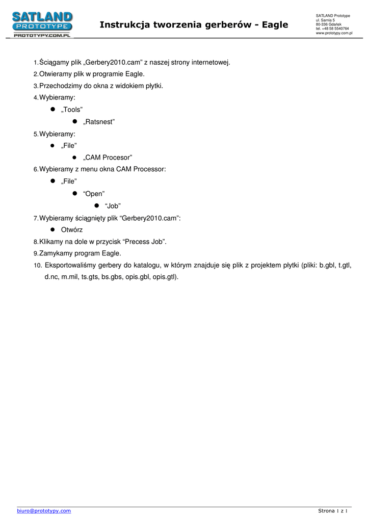 Instrukcja tworzenia gerberów - Eagle SATLAND Prototype ul. Sarnia 5 80-336 Gdańsk tel. +48 58 5540764 www.prototypy.com.pl 1. Ściągamy plik „Gerbery2010.cam” z naszej strony internetowej. 2. Otwieramy plik w programie Eagle. 3. Przechodzimy do okna z widokiem płytki. 4. Wybieramy: „Tools” „Ratsnest” 5. Wybieramy: „File” „CAM Procesor” 6. Wybieramy z menu okna CAM Processor: „File” “Open” “Job” 7. Wybieramy ściągnięty plik “Gerbery2010.cam”: Otwórz 8. Klikamy na dole w przycisk “Precess Job”. 9. Zamykamy program Eagle. 10. Eksportowaliśmy gerbery do katalogu, w którym znajduje się plik z projektem płytki (pliki: b.gbl, t.gtl, d.nc, m.mil, ts.gts, bs.gbs, opis.gbl, opis.gtl). [email protected] Strona 1 z 1