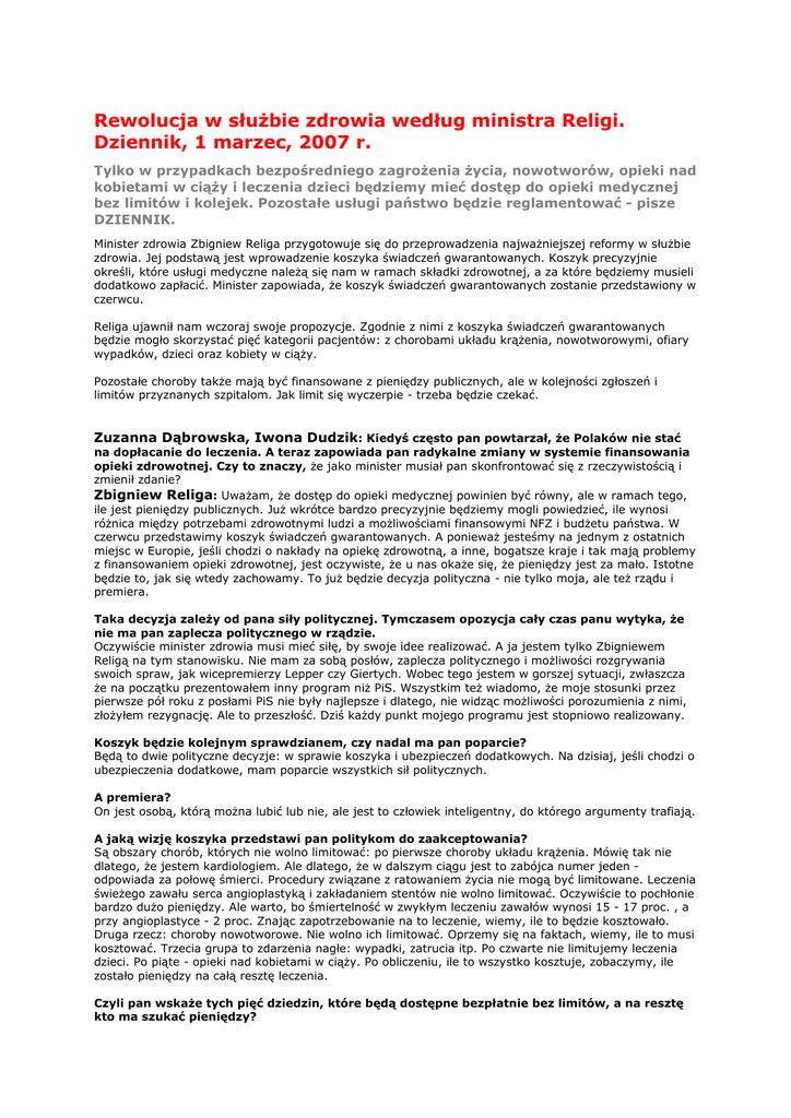Rewolucja w słuŜbie zdrowia według ministra Religi. Dziennik, 1 marzec, 2007 r. Tylko w przypadkach bezpośredniego zagroŜenia Ŝycia, nowotworów, opieki nad kobietami w ciąŜy i leczenia dzieci będziemy mieć dostęp do opieki medycznej bez limitów i kolejek. Pozostałe usługi państwo będzie reglamentować - pisze DZIENNIK. Minister zdrowia Zbigniew Religa przygotowuje się do przeprowadzenia najwaŜniejszej reformy w słuŜbie zdrowia. Jej podstawą jest wprowadzenie koszyka świadczeń gwarantowanych. Koszyk precyzyjnie określi, które usługi medyczne naleŜą się nam w ramach składki zdrowotnej, a za które będziemy musieli dodatkowo zapłacić. Minister zapowiada, Ŝe koszyk świadczeń gwarantowanych zostanie przedstawiony w czerwcu. Religa ujawnił nam wczoraj swoje propozycje. Zgodnie z nimi z koszyka świadczeń gwarantowanych będzie mogło skorzystać pięć kategorii pacjentów: z chorobami układu krąŜenia, nowotworowymi, ofiary wypadków, dzieci oraz kobiety w ciąŜy. Pozostałe choroby takŜe mają być finansowane z pieniędzy publicznych, ale w kolejności zgłoszeń i limitów przyznanych szpitalom. Jak limit się wyczerpie - trzeba będzie czekać. Zuzanna Dąbrowska, Iwona Dudzik: Kiedyś często pan powtarzał, Ŝe Polaków nie stać na dopłacanie do leczenia. A teraz zapowiada pan radykalne zmiany w systemie finansowania opieki zdrowotnej. Czy to znaczy, Ŝe jako minister musiał pan skonfrontować się z rzeczywistością i zmienił zdanie? Zbigniew Religa: UwaŜam, Ŝe dostęp do opieki medycznej powinien być równy, ale w ramach tego, ile jest pieniędzy publicznych. JuŜ wkrótce bardzo precyzyjnie będziemy mogli powiedzieć, ile wynosi róŜnica między potrzebami zdrowotnymi ludzi a moŜliwościami finansowymi NFZ i budŜetu państwa. W czerwcu przedstawimy koszyk świadczeń gwarantowanych. A poniewaŜ jesteśmy na jednym z ostatnich miejsc w Europie, jeśli chodzi o nakłady na opiekę zdrowotną, a inne, bogatsze kraje i tak mają problemy z finansowaniem opieki zdrowotnej, jest oczywiste, Ŝe u nas okaŜe się, Ŝe pieniędzy jest za mało. Istotne będzie to, jak się wtedy zachowamy. To juŜ będzie decyzja polityczna - nie tylko moja, ale teŜ rządu i premiera. Taka decyzja zaleŜy od pana siły politycznej. Tymczasem opozycja cały czas panu wytyka, Ŝe nie ma pan zaplecza politycznego w rządzie. Oczywiście minister zdrowia musi mieć siłę, by swoje idee realizować. A ja jestem tylko Zbigniewem Religą na tym stanowisku. Nie mam za sobą posłów, zaplecza politycznego i moŜliwości rozgrywania swoich spraw, jak wicepremierzy Lepper czy Giertych. Wobec tego jestem w gorszej sytuacji, zwłaszcza Ŝe na początku prezentowałem inny program niŜ PiS. Wszystkim teŜ wiadomo, Ŝe moje stosunki przez pierwsze pół roku z posłami PiS nie były najlepsze i dlatego, nie widząc moŜliwości porozumienia z nimi, złoŜyłem rezygnację. Ale to przeszłość. Dziś kaŜdy punkt mojego programu jest stopniowo realizowany. Koszyk będzie kolejnym sprawdzianem, czy nadal ma pan poparcie? Będą to dwie polityczne decyzje: w sprawie koszyka i ubezpieczeń dodatkowych. Na dzisiaj, jeśli chodzi o ubezpieczenia dodatkowe, mam poparcie wszystkich sił politycznych. A premiera? On jest osobą, którą moŜna lubić lub nie, ale jest to człowiek inteligentny, do którego argumenty trafiają. A jaką wizję koszyka przedstawi pan politykom do zaakceptowania? Są obszary chorób, których nie wolno limitować: po pierwsze choroby układu krąŜenia. Mówię tak nie dlatego, Ŝe jestem kardiologiem. Ale dlatego, Ŝe w dalszym ciągu jest to zabójca numer jeden odpowiada za połowę śmierci. Procedury związane z ratowaniem Ŝycia nie mogą być limitowane. Leczenia świeŜego zawału serca angioplastyką i zakładaniem stentów nie wolno limitować. Oczywiście to pochłonie bardzo duŜo pieniędzy. Ale warto, bo śmiertelność w zwykłym leczeniu zawałów wynosi 15 - 17 proc. , a przy angioplastyce - 2 proc. Znając zapotrzebowanie na to leczenie, wiemy, ile to będzie kosztowało. Druga rzecz: choroby nowotworowe. Nie wolno ich limitować. Oprzemy się na faktach, wiemy, ile to musi kosztować. Trzecia grupa to zdarzenia nagłe: wypadki, zatrucia itp. Po czwarte nie limitujemy leczenia dzieci. Po piąte - opieki nad kobietami w ciąŜy. Po obliczeniu, ile to wszystko kosztuje, zobaczymy, ile zostało pieniędzy na całą resztę leczenia. Czyli pan wskaŜe tych pięć dziedzin, które będą dostępne bezpłatnie bez limitów, a na resztę kto ma szukać pieniędzy? Ta reszta to np. leczenie przepukliny, zapalenia płuc, wrzodów Ŝołądka i innych chorób przewlekłych. Obawiam się, Ŝe po odliczeniu z ogólnej puli tych pięciu najpilniejszych dziedzin okaŜe się, Ŝe zostało na to niewiele pieniędzy. I tu dochodzimy do decyzji politycznej, co zrobić z resztą. I jedyne, co moŜemy zrobić, to limitowanie, czyli określenie, ile określonych procedur moŜemy sfinansować w danym roku. Inną moŜliwością byłoby powiedzenie, Ŝe za wszystko, co wypadło z koszyka, trzeba po prostu zapłacić i jak kogoś nie stać, to trudno. A ja proponuję, Ŝeby przyznać otwarcie: tak, są kolejki, ale moŜna się doczekać na dany zabieg. Kolejki przeskoczyć nie moŜna, to rzecz święta. I to jest lepsze rozwiązanie. Bo wielu ludzi nie stać na płacenie. Natomiast jeśli pacjent z jakichś powodów nie chce czekać, damy mu prawnie taką moŜliwość, Ŝe za pieniądze sobie zrobi to, co jest mu potrzebne. W publicznym szpitalu? Dochodzimy do waŜnego problemu, do którego wczoraj przekonywałem posłów koalicyjnych i zyskałem ich akceptację. Mamy szpitale publiczne i niepubliczne. Dziś szpitale niepubliczne mogą mieć kontrakty z NFZ, a takŜe leczyć odpłatnie. Takiej moŜliwości nie mają szpitale publiczne, choć medycznie stoją na wyŜszym poziomie. Dlaczego szpital publiczny mamy karać? Dla mnie to bez sensu. Dlatego chc