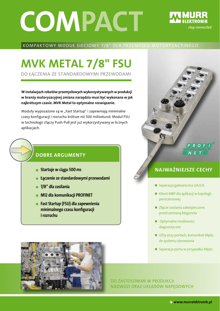 K O M P A K T OWY MOD UŁ SIECIOWY 7/8“ DLA PRZEMYSŁU MO TO RYZACYJ NE GO mvk metal 7/8" fsu DO ŁĄCZENIA ZE STANDARDOWYMI PRZEWODAMI W instalacjach robotów przemysłowych wykorzystywanych w produkcji w branży motoryzacyjnej zmiana narzędzia musi być wykonana w jak najkrótszym czasie. MVK Metal to optymalne rozwiązanie. Moduły wyposażone są w „Fast Startup“ i zapewniają minimalne czasy konfiguracji i rozruchu krótsze niż 500 milisekund. Moduł FSU w technologii złączy Push-Pull jest już wykorzystywany w licznych aplikacjach. DOBRE ARGUMENTY Startuje w ciągu 500 ms NAJWAŻNIEJSZE CECHY Łączenie ze standardowymi przewodami 7/8“ dla zasilania Separacja galwaniczna UA/US M12 dla komunikacji PROFINET Klient MRP dla aplikacji w topologii Fast Startup (FSU) dla zapewnienia minimalnego czasu konfiguracji i rozruchu Złącze zasilania zabezpieczone pierścieniowej przed zamianą biegunów Optymalne możliwości diagnostyczne LEDy przy portach, komunikat błędu do systemu sterowania Separacja portu w przypadku błędu DO ZASTOSOWAŃ W PRODUKCJI NADWOZI ORAZ UKŁADÓW NAPĘDOWYCH ÔÔ www.murrelektronik.pl COMPACT mvk metal Sprawdzony i niezawodny – MVK Metal jest przeznaczony do zastosowania w trudnych warunkach Odporny na odpryski podczas spawania dzięki uszlachetnionej powierzchni metalowej obudowy Wysoka odporność na wstrząsy i wibracje dzięki pełnemu zalaniu elektroniki Odporny na oleje i chłodziwa Solidna i zwarta konstrukcja Wysoki stopień ochrony IP67 DANE TECHNICZNE Dane do zamówienia MVK MPNIO DI8 DO8 FSU Przyłącza Magistrala M12 Zasilanie czujnik/system/aktuator Gniazda I/O Magistrala sieciowa Napięcie robocze Tryby pracy Szybkość transmisji FSU (Fast Start-Up) Wejście Zasilanie czujnika US Typ PIN 4 (gniazdo 4,5,6,7) PIN 2 (gniazdo 4,5,6,7) Dioda LED Wyjście Zasilanie aktuatora Prąd przełączania na wyjście PIN 2 (gniazdo 0,1,2,3) PIN 4 (gniazdo 0,1,2,3) Dioda LED Diagnostyka Stan komunikacji Diagnostyka Diagnostyka Monitoring Dane ogólne Stopień ochrony Zakres temperatur Nr kat. 55339 Kodowanie D 7/8“, 5-polowe, maks. 9 A M12, kodowanie A, 5-polowe 24 V DC (18…30,2 V) zgodnie z EN 61131-2 Automatyczna negocjacja/Auto MDI/MDI-X 100 MBit/s pełny dupleks maks. 500 ms 24 V DC, (EN 61131-2), maks. 200 mA na każde gniazdo M12 dla czujników 3-przewodowych lub przełączników mechanicznych z przełączaniem p (EN 61131-2) Wejście Wejście LED (żółta) na wejście 24 V DC, (EN 61131-2), suma maks. 12 A maks. 2 A (odporne na zwarcie i przeciążenie) Wyjście Wyjście Dioda LED (żółta) wyjście zajęte; dioda LED (czerwona) wyjście zwarte; dioda LED (czerwona) błędne połączenie na diodę LED przez diodę LED na moduł i kanał przez magistralę na moduł i kanał napięcie, zwarcie i przeciążenie IP67 0...+55°C (temperatura składowania -25...+70°C) Informacje przedstawione powyżej zostały opracowane z najwyższą starannością. Odpowiedzialność co do ich poprawności, kompletności i aktualności jest ograniczona do rażącego przewinienia. ÔÔ www.murrelektronik.pl