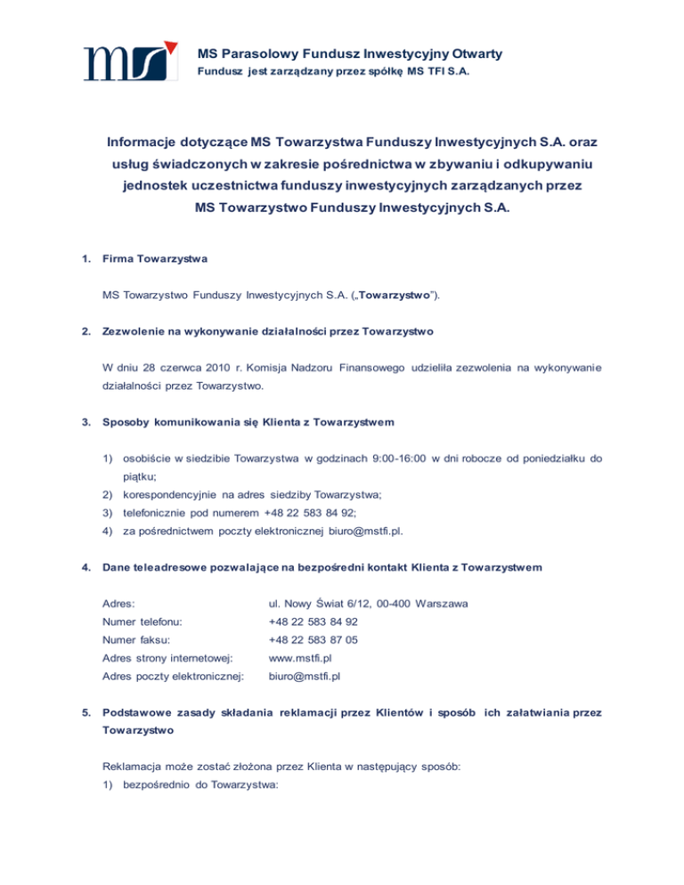 MS Parasolowy Fundusz Inwestycyjny Otwarty Fundusz jest zarządzany przez spółkę MS TFI S.A. Informacje dotyczące MS Towarzystwa Funduszy Inwestycyjnych S.A. oraz usług świadczonych w zakresie pośrednictwa w zbywaniu i odkupywaniu jednostek uczestnictwa funduszy inwestycyjnych zarządzanych przez MS Towarzystwo Funduszy Inwestycyjnych S.A. 1. Firma Towarzystwa MS Towarzystwo Funduszy Inwestycyjnych S.A. („Towarzystwo”). 2. Zezwolenie na wykonywanie działalności przez Towarzystwo W dniu 28 czerwca 2010 r. Komisja Nadzoru Finansowego udzieliła zezwolenia na wykonywanie działalności przez Towarzystwo. 3. Sposoby komunikowania się Klienta z Towarzystwem 1) osobiście w siedzibie Towarzystwa w godzinach 9:00-16:00 w dni robocze od poniedziałku do piątku; 2) korespondencyjnie na adres siedziby Towarzystwa; 3) telefonicznie pod numerem +48 22 583 84 92; 4) za pośrednictwem poczty elektronicznej [email protected]. 4. 5. Dane teleadresowe pozwalające na bezpośredni kontakt Klienta z Towarzystwem Adres: ul. Nowy Świat 6/12, 00-400 Warszawa Numer telefonu: +48 22 583 84 92 Numer faksu: +48 22 583 87 05 Adres strony internetowej: www.mstfi.pl Adres poczty elektronicznej: [email protected] Podstawowe zasady składania reklamacji przez Klientów i sposób ich załatwiania przez Towarzystwo Reklamacja może zostać złożona przez Klienta w następujący sposób: 1) bezpośrednio do Towarzystwa: a) w formie pisemnej – w siedzibie Towarzystwa albo przesyłką pocztową na adres Towarzystwa: MS TFI S.A., Nowy Świat 6/12, 00-400 Warszawa, b) ustnie – telefonicznie albo osobiście do protokołu podczas wizyty Klienta w siedzibie Towarzystwa, c) drogą elektroniczną na adres poczty elektronicznej: [email protected], d) za pośrednictwem faksu na numer +48 22 583 87 05; 2) za pośrednictwem Agenta Transferowego – w sposób wskazany w regulaminie Agenta Transferowego; 3) za pośrednictwem Dystrybutora – w sposób wskazany w regulaminie Dystrybutora. Reklamacje powinny być zgłaszane niezwłocznie po uzyskaniu informacji o zaistnieniu okoliczn ości budzących zastrzeżenia, w celu umożliwienia rzetelnego rozpatrzenia reklamacji. Odpowiedź na reklamacje zostanie udzielona bez zbędnej zwłoki, nie później niż w terminie 30 dni od daty otrzymania reklamacji, chyba że reklamacja dotyczy szczególnie skomplikowanego przypadku, przy czym termin rozpatrzenia takiej reklamacji nie może przekroczyć 60 dni. Jednocześnie Towarzyst wo wyjaśnia przyczyny opóźnienia, wskazuje okoliczności, które muszą zostać ustalone dla rozpatrzenia sprawy oraz określa przewidywany termin rozpatrzenia reklamacji i udzielenia odpowiedzi. Odpowiedź na reklamację Klienta zostanie udzielona w formie pisemnej bądź w innej formie uzgodnionej z Klientem. W przypadku niedotrzymania terminów, o których mowa powyżej, reklamację uważa się za rozpatrzoną zgodnie z wolą Klienta. W przypadku nieuwzględnienia roszczeń wynikających z reklamacji Klienta treść odpowiedzi na reklamację powinna zawierać również pouczenie o możliwości: 1) odwołania się od stanowiska zawartego w odpowiedzi, jeżeli Towarzy stwo przewiduje tryb odwoławczy, a także o sposobie wniesienia tego odwołania; 2) skorzystania z instytucji mediacji albo sądu polubownego, albo innego mechanizmu polubownego rozwiązywania sporów, jeżeli Towarzystwo przewiduje taką możliwość; 3) wystąpienia z wnioskiem o rozpatrzenie sprawy do Rzecznika Finansowego; 4) wystąpienia z powództwem do sądu powszechnego ze wskazaniem podmiotu, który powinien być pozwany i sądu miejscowo właściwego do rozpoznania sprawy. Ponadto Klient będący konsumentem może zwrócić s ię o pomoc do miejskiego lub powiatowego Rzecznika Konsumentów. Towarzystwo podlega nadzorowi Komisji Nadzoru Finansowego. 6. Podstawowe zasady postępowania Towarzystwa w przypadku powstania konfliktu interesów Przez konflikt interesów rozumie się znane Towarzystwu okoliczności mogące doprowadzić do powstania sprzeczności między interesem Towarzystwa lub osoby obowiązanej a obowiązkiem działania przez Towarzystwo w sposób rzetelny, z uwzględnieniem najlepiej pojętego interes u uczestników funduszu inwestycyjnego, jak również znane Towarzystwu okoliczności mogąc e doprowadzić do sprzeczności pomiędzy interesami uczestników funduszy inwestycyjnych. Towarzystwo podejmuje wszelkie działania, aby zapobiegać przepływowi informacji pomiędzy osobami wykonującymi, w ramach działalności prowadzonej przez Towarzystwo, poszczególne czynności, które mogą powodować powstanie konfliktu interesów oraz zapewnia nadzór nad takim przepływem informacji, jeżeli jest on konieczny. Towarzystwo podejmuje działania w celu zapobiegania przypadkom jednoczesnego lub następującego bezpośrednio po sobie wykonywania przez tę samą osobę obwiązaną czynności z zakresu działania Towarzystwa, jeżeli mogłoby to wywrzeć niekorzystny wpływ na prawidłowe zarządzanie konfliktami interesów oraz zapewnia nadzór nad takim sposobem wykonywania czynności, jeżeli jest on konieczny. Towarzyst wo zapobiega istnieniu bezpośrednich zależności pomiędzy wysokością wynagrodzenia osób wykonujących określone czynności w ramach działalności prowadzonej przez Towarzys two, od wynagrodzenia lub zysków osiąganych przez osoby wykonujące czynności innego rodzaju, które powodują lub mogłyby spowodować powstanie konfliktu interesów. W przypadku, gdy rozwiązania organizacyjne Towarzystwa nie są wystarczające, aby z należytą pewnością uznać, że ryzyko naruszenia interesów Klienta lub Uczestnika nie występuje, Towarzystwo jest zobowiązane ujawnić Klientowi lub Uczestnikowi ogólny charakter lub źródło konfliktu przed zawarciem transakcji, aby Klient lub Uczestnik mógł podjąć świadomą decyzję, czy chce nadal korzystać z usług Towarzyst wa w tej konkretnej sytuacji. W przypadku wystąpienia konfliktu interesów