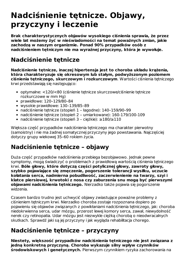 Nadciśnienie tętnicze. Objawy, przyczyny i leczenie Brak charakterystycznych objawów wysokiego ciśnienia sprawia, że przez wiele lat możemy żyć w nieświadomości na temat poważnych zmian, jakie zachodzą w naszym organizmie. Ponad 90% przypadków osób z nadciśnieniem tętniczym nie ma wyraźnej przyczyny, która je wywołuje. Nadciśnienie tętnicze Nadciśnienie tętnicze, inaczej hipertensja jest to choroba układu krążenia, która charakteryzuje się okresowym lub stałym, podwyższonym poziomem ciśnienia tętniczego, skurczowym i rozkurczowym. Wartości ciśnienia tętniczego krwi przedstawiają się następująco: optymalne: <120/<80 (ciśnienie tętnicze skurczowe/ciśnienie tętnicze rozkurczowe w mm Hg) prawidłowe: 120–129/80–84 wysokie prawidłowe: 130–139/85–89 nadciśnienie tętnicze (stopień 1 – łagodne): 140–159/90–99 nadciśnienie tętnicze (stopień 2 – umiarkowane): 160-179/100-109 nadciśnienie tętnicze (stopień 3 – ciężkie): ≥180/≥110 Większa część przypadków nadciśnienia tętniczego ma charakter pierwotny (samoistny) i nie ma żadnej somatycznej przyczyny jego powstawania. Najczęściej dotyczy grupy wiekowej 35–60 rokiem życia. Nadciśnienie tętnicze – objawy Duża część przypadków nadciśnienia przebiega bezobjawowo. Jednak pewne symptomy, mogą świadczyć o problemach z prawidłową wartością ciśnienia tętniczego krwi. Bóle głowy, które dotyczą części potylicznej głowy, zawroty głowy, szybko pojawiające się zmęczenie, pogorszenie tolerancji wysiłku, uczucie kołatania serca, nadmierna pobudliwość, zaczerwienienie na twarzy, szyi i klatce piersiowej, krwotoki z nosa czy zaburzenia snu mogą być pierwszymi objawami nadciśnienia tętniczego. Nierzadko także pojawia się pogorszenie widzenia. Czasem bardzo trudno jest uchwycić objawy zwiastujące poważne problemy z ciśnieniem tętniczym krwi. Nierzadko choroba zostaje rozpoznana dopiero po pojawieniu się objawów związanych z powikłaniami nadciśnienia tętniczego, jak: choroba niedokrwienna serca, udar mózgu, przerost lewej komory serca, zawał, niewydolność nerek czy retinopatia. Udar mózgu jest niezwykle ciężką chorobą o nieodwracalnych skutkach. Sprawdź jaki są jej przyczyny i jak wygląda rehabilitacja chorego. Nadciśnienie tętnicze – przyczyny Niestety, większość przypadków nadciśnienia tętniczego nie jest związana z jedną konkretną przyczyną. Choroba wykazuje silny wpływ czynników środowiskowych i genetycznych. Pierwszym czynnikiem ryzyka zachorowania na chorobę jest spożywanie nadmiernej ilości soli (sodu). Nie tylko nadmierne stosowanie soli dodawanej do potraw przyczynia się do rozwoju nadciśnienia tętniczego, należy pamiętać, że sól kryje się w wielu produktach spożywczych. Następną przyczyną rozwoju nadciśnienia tętniczego może być otyłość i brak aktywności fizycznej. Systematyczne ćwiczenia fizyczne oraz odpowiednia, zdrowa dieta przyczyniają się do obniżenia wartości RR, a co za tym idzie, obniżenia ryzyka rozwoju nadciśnienia. Rozwój nadciśnienia tętniczego jest mocno powiązany ze stylem życia oraz stosowaniem używek, takich jak: alkohol i papierosy, które w połączeniu z siedzącym trybem życia nie sprzyjają obniżeniu ciśnienia tętniczego krwi. Kolejną, bardzo ważną przyczyną powstawania nadciśnienia tętniczego jest genetyka, a na ten czynnik niestety nie mamy wpływu. Skłonność do rodzinnego występowania nadciśnienia tętniczego, powinna skłonić do wzmożonej obserwacji i regularnych pomiarów ciśnienia krwi. W nadciśnieniu wtórnym, wyróżnia się główną przyczynę powstawania nadciśnienia, którą jest choroba, w wyniku której, dochodzi do zaburzenia parametrów ciśnienia krwi. Może to być nadczynność tarczycy, choroby nerek, zwężenie tętnicy nerkowej, hiperaldosteronizm oraz wiele innych. Nadciśnienie tętnicze – leczenie Leczenie nadciśnienia tętniczego krwi ściśle wiąże się z przyczynami jego powstawania. Leczenie można podzielić na niefarmakologiczne oraz z użyciem środków farmakologicznych. Do niefarmakologicznego leczenia nadciśnienia tętniczego zaliczyć można zmianę stylu życia (dietę, aktywność fizyczną, ograniczenie spożycia alkoholu, rzucenie lub ograniczenie palenia oraz ograniczenie spożycia sodu). Dieta i regularna aktywność fizyczna odgrywają bardzo ważną rolę. Wprowadzenie do diety ryb, sporej ilości warzyw i owoców, zamiast tłustego mięsa, słodyczy i niezdrowych przekąsek, korzystnie wpłynie na cały organizm. Stan chorego i postęp oraz powikłania choroby wpływają na przepisane leki przez lekarza. Do najczęściej stosowanych leków w nadciśnieniu tętniczym, należą: ACE – inhibitory konwertazy Blokery kanału wapniowego – antagoniści wapnia β – blokery diuretyki – leki moczopędne α- 1-blokery blokery receptora angiotensynowego (ARB) Nadciśnienie tętnicze z roku na rok dotyka coraz większej liczby osób. Styl życia, pośpiech, stres, niezdrowa dieta, brak aktywności fizycznej, używki – to wszystko przyczynia się do rozwoju chorób cywilizacyjnych. Zmiana nawyków, regularne pomiary ciśnienia tętniczego krwi, kontrola lekarska i ewentualna farmakoterapia to środki, które stosowane regularnie pozwolą na uniknięcie poważnych konsekwencji nadciśnienia tętniczego krwi. Author: Aleksandra Musiał Link do artykułu: http://bonavita.pl/nadcisnienie-tetnicze-objawy-przyczyny-i-leczenie