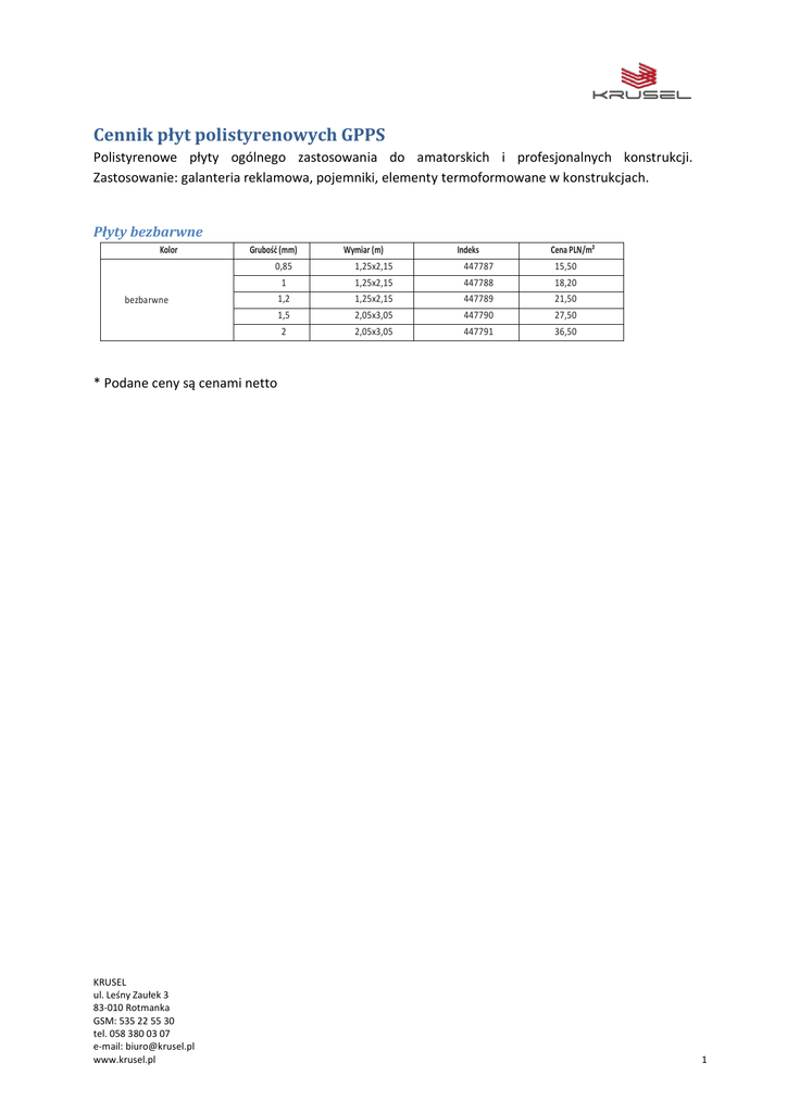 Cennik płyt polistyrenowych GPPS Polistyrenowe płyty ogólnego zastosowania do amatorskich i profesjonalnych konstrukcji. Zastosowanie: galanteria reklamowa, pojemniki, elementy termoformowane w konstrukcjach. Płyty bezbarwne Kolor Grubość (mm) Wymiar (m) Indeks Cena PLN/m² 0,85 1,25x2,15 447787 15,50 1 1,25x2,15 447788 18,20 1,2 1,25x2,15 447789 21,50 1,5 2,05x3,05 447790 27,50 2 2,05x3,05 447791 36,50 bezbarwne * Podane ceny są cenami netto KRUSEL ul. Leśny Zaułek 3 83-010 Rotmanka GSM: 535 22 55 30 tel. 058 380 03 07 e-mail: [email protected] www.krusel.pl 1