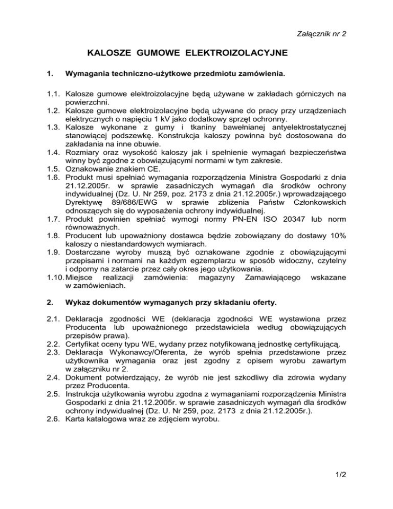 Załącznik nr 2 KALOSZE GUMOWE ELEKTROIZOLACYJNE 1. Wymagania techniczno-uŜytkowe przedmiotu zamówienia. 1.1. Kalosze gumowe elektroizolacyjne będą uŜywane w zakładach górniczych na powierzchni. 1.2. Kalosze gumowe elektroizolacyjne będą uŜywane do pracy przy urządzeniach elektrycznych o napięciu 1 kV jako dodatkowy sprzęt ochronny. 1.3. Kalosze wykonane z gumy i tkaniny bawełnianej antyelektrostatycznej stanowiącej podszewkę. Konstrukcja kaloszy powinna być dostosowana do zakładania na inne obuwie. 1.4. Rozmiary oraz wysokość kaloszy jak i spełnienie wymagań bezpieczeństwa winny być zgodne z obowiązującymi normami w tym zakresie. 1.5. Oznakowanie znakiem CE. 1.6. Produkt musi spełniać wymagania rozporządzenia Ministra Gospodarki z dnia 21.12.2005r. w sprawie zasadniczych wymagań dla środków ochrony indywidualnej (Dz. U. Nr 259, poz. 2173 z dnia 21.12.2005r.) wprowadzającego Dyrektywę 89/686/EWG w sprawie zbliŜenia Państw Członkowskich odnoszących się do wyposaŜenia ochrony indywidualnej. 1.7. Produkt powinien spełniać wymogi normy PN-EN ISO 20347 lub norm równowaŜnych. 1.8. Producent lub upowaŜniony dostawca będzie zobowiązany do dostawy 10% kaloszy o niestandardowych wymiarach. 1.9. Dostarczane wyroby muszą być oznakowane zgodnie z obowiązującymi przepisami i normami na kaŜdym egzemplarzu w sposób widoczny, czytelny i odporny na zatarcie przez cały okres jego uŜytkowania. 1.10. Miejsce realizacji zamówienia: magazyny Zamawiającego wskazane w zamówieniach. 2. Wykaz dokumentów wymaganych przy składaniu oferty. 2.1. Deklaracja zgodności WE (deklaracja zgodności WE wystawiona przez Producenta lub upowaŜnionego przedstawiciela według obowiązujących przepisów prawa). 2.2. Certyfikat oceny typu WE, wydany przez notyfikowaną jednostkę certyfikującą. 2.3. Deklaracja Wykonawcy/Oferenta, Ŝe wyrób spełnia przedstawione przez uŜytkownika wymagania oraz jest zgodny z opisem wyrobu zawartym w załączniku nr 2. 2.4. Dokument potwierdzający, Ŝe wyrób nie jest szkodliwy dla zdrowia wydany przez Producenta. 2.5. Instrukcja uŜytkowania wyrobu zgodna z wymaganiami rozporządzenia Ministra Gospodarki z dnia 21.12.2005r. w sprawie zasadniczych wymagań dla środków ochrony indywidualnej (Dz. U. Nr 259, poz. 2173 z dnia 21.12.2005r.). 2.6. Karta katalogowa wraz ze zdjęciem wyrobu. 1/2 3. Wykaz dokumentów wymaganych przy pierwszej i kolejnych dostawach. 3.1. Przed pierwszą dostawą wyrobu na kopalnie producent lub upowaŜniony dostawca winien dołączyć: certyfikat oceny typu WE, instrukcję uŜytkowania, przechowywania i konserwacji kaloszy, dokument potwierdzający, Ŝe wyrób nie jest szkodliwy dla zdrowia, wydany przez Producenta, a przy kaŜdej dostawie deklarację zgodności WE i świadectwo jakości. 2/2