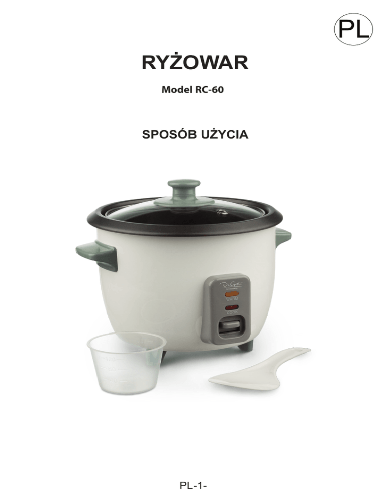 CZ RYŻOWAR RÝŽOVAR Model RC-60 SPOSÓB UŻYCIA NÁVOD K POUŽITÍ PL-1CZ -1- Aktuální verzi návodu v elektronické podobě najdete na www.tvproducts.cz Vážení zákazníci, Szanowny kliencie, děkujeme za Vašizaufania důvěru, i kterou jste produktu. nám projevili nákupem výrobku. Tento dziękujemy Vám za okazanie wybór tego Instrukcja obsługitohoto jest integralną návod k obsluze je součástí výrobku. Obsahuje důležité pokyny k uvedení výrobku do provozu częścią produktu, zawiera informacje pomocne w trakcie jego użytkowania. aPrzekazując k jeho obsluze. Jestliže výrobeknależy předáte jinýmdo osobám, dbejte na to, abyste jim odevzdali produkt innej osobie, dołączyć niego instrukcję obsługi. iInstrukcję tento návod. Ponechejte tento návod, si jej wmohli znovumomencie. kdykoliv přečíst! należy zachować,siaby móc z niejabyste skorzystać dowolnym Bezpečnostní upozornění Środki bezpieczeństwa Tento přístroj opláchněte před prvním a po každém použití. Przemyj urządzenie, przed i po każdym użyciu. 1. Odpojte rýžovar ze zásuvky vždy, pokud je nepoužíváte nebo před jeho čištěním. 1. Nikdy Urządzenie należy odłączyć od instalacji elektrycznej, je myjemy lub kiedy jest wtrakcie 2. neponořujte těleso přístroje do vody nebo jinékiedy tekutiny! spoczynku. 3. Nechte rýžovar před čištěním vychladnout. 2. Nie należy zanurzać korpusu urzadzenia w wodzie lub innych substancjach ciekłych. 4. Nepoužívejte k čištění abrazivní čisticí prostředky ani drátěnku. 3. Przed czyszczeniem urządzenia odłącz go od zasilania i poczekaj, aż ostygnie. 5. Topné těleso a vnitřní část: lehce otřete vnější povrch vlhkým hadříkem nebo houbičkou. 4. Do czyszczeni nie używać środków ściernych oraz czyścików z wełny stalowej (druciaków). Neomývejte topné těleso! 5. Aby wyczyścić elemnt grzejny oraz wewnętrzną część urządzenia, delikatnie przetrzyj je 6. Nádoba na rýži: naplňte horkou vodou nechte chvilku odstát, poté umyjte v teplé wilgotną szmatką lub gąbką.nádobu Nie dopuszczać wilgociado grzałki. vodě se saponátem, vytřete měkkým hadříkem. 6. Żeby umyć pojemnik na ryż, należy napełnić go gorącą wodą i odstawić na jakiś czas. Następnie przemyć ciepłą wodą z mydłem i wytrzeć sucha miekką ściereczką. 7. Víko: umyjte v teplé vodě se saponátem, vytřete do měkkým hadříkem. 7. Zrnka Pokrywkę przemyć w povrchu ciepłej wodzie z płynem i wytrzeć doomyjte. sucha ściereczką. 8. rýženależy mohou ulpět na výrobku. Tyto zbytky rýže 8. Ziarna ryżu mogą przywierać do naczynia. Można je usunąć, używając miekkiej gąbki. Ważne jest,odstranění aby ziarenka ryżurýže nie lze dostawały się między dolną część naczynia, a płytę grzejną. Jeżeli się Na zbylé použít jemnou houbičku. Pro dobrý kontakt mezi topnou deskou tam znajdą, nazleży je całkowicie usunąć. a spodní částí nádoby na rýži je důležité udržovat jejich styčné plochy dokonale čisté. Tento přístroj je určen pouze pro použití v domácnosti!!! Sposób użycia Použití 1.Odmierz ryż przed gotowaniem, opłukaj i zalej pojemnik wodą. do varné nádoby. 1. Odměřenou rýži před vařením propláchněte vodou a nasypte 2. Wsyp do miski wymaganą ilość ryżu, dodaj odpowiednią ilośćpoužijte wody - ogólnie, jestrýži 1 2. K rýži do varné nádoby přidáme vodu. Na jeden díl rýže 1,5 dílu potrzebna vody. Pokud szklanka wody na szklankę ryżu. Nie napełniaj powyżej oznaczenia. neproplachujete vodou (viz. bod 1), můžete použít na 1 díl rýže 2 díly vody. 3. Sprawdź czy pojemnik ma dobry kontakt z elementem grzewczym. 3. nádobu,ztam a zpět, abyste se ujistili, že má dobrý kontakt s topným tělesem. 4. Pootočte Przykryj pojemnik ryżem pokrywką. 4. uzavřete víkem. 5. Rýžovar Podłączyć urządzenie do sieci. 5. rýžovar do sítě. 6. Připojte Naciśnij przełącznik w dół, wtedy zapali się światło gotowania „cook”, po gotowaniu 6. Stiskněte elektronický dolů do polohy „VAŘIT“. automatycznie przejdzie wspínač funkcjęsměrem „warm” (podtrzymywanie ciepła). Rozsvítí se červená kontrolka 7. Po zakończeniu gotowania, włącznik automatycznie wraca do pozycji wyjściowej. pro vaření. 8. Jakmile Gdy ryż bude skończy się gotować, należy zdjąć i wyciągnąć skład 7. vaření dokončeno, spínač se pokrywę automaticky přepnego dołyżką horníwchodzacą polohy prowudržovázestawu lub innym przyrządem, który nie uszkodzi powierzchni naczynia. ní teploty. Rozsvítí se oranžová kontrolka pro udržování teploty. 9. Nie przepełniaj się jego zawartości, do wnętrza urządzenia. 8. Sejměte víko a naczynia, vyndejte aby rýži uniknąć z varné przedostania nádoby. Použijte k tomu lžíci, která je součástí nádoby W przypadku wsypania się tam zawartości, niezwłocznie oczyścić urządzenie przed nastepnym případně jinou plastovou lžíci, která nepoškodí nepřilnavý povrch. użytkowaniem. 9. Varnou nádobu nepřeplňujte, aby se jeho obsah nedostal mimo nádobu. Pokud se tak stane, vše důkladně vyčistěte před dalším použitím. PL-2CZ -2- Aktuální verzi návodu v elektronické podobě najdete na www.tvproducts.cz Ważne informacje Důležitá upozornění Podczas korzystania z urządzeń elektrycznych należy przestrzegać podstawowych Při používáni elektrických spotřebičů, dodržujte vždyzawsze základní bezpečnostní opatření, zasad bezpieczeństwa, w tym: včetně následujících: 1. Dokładnie zapoznaj się z instrukcją obsługi. 2. Uważaj nasiporażenie prądem - nie zanurzaj kabla, wtyczki, ani korpusu urządzenia w wodzie lub 01. Přečtěte všechny pokyny. innym płynie. Urządzenie zawsze stawiaj na suchej powierzchni. 02. Pozor na úraz elektrickým proudem, neponořujte šňůru, zástrčku ani