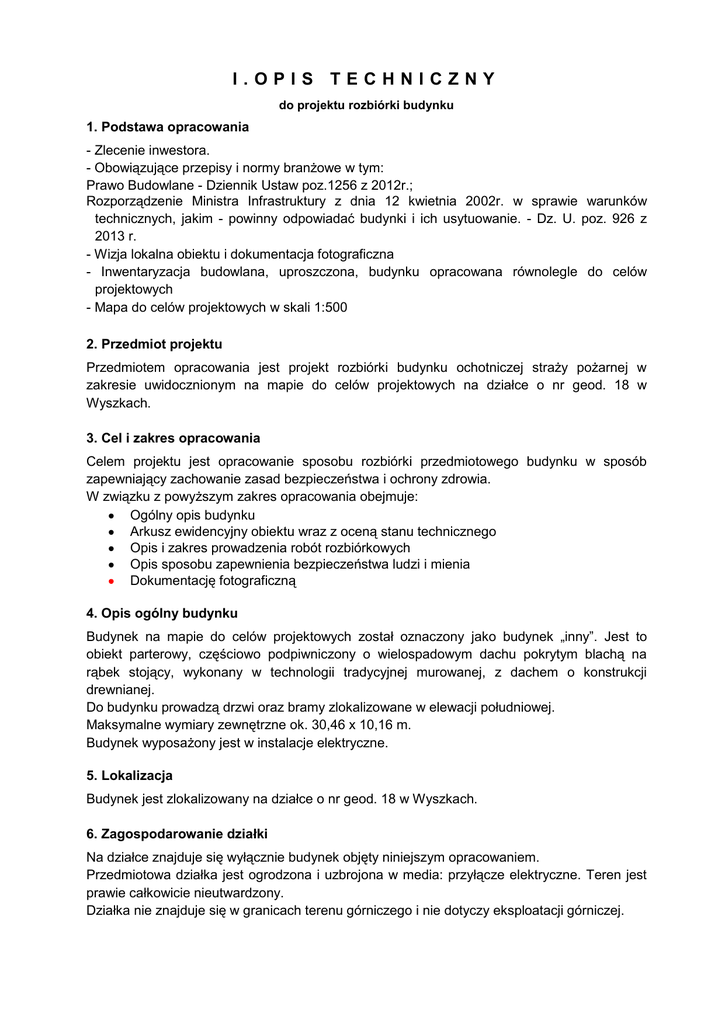 I.OPIS TECHNICZNY do projektu rozbiórki budynku 1. Podstawa opracowania - Zlecenie inwestora. - Obowiązujące przepisy i normy branżowe w tym: Prawo Budowlane - Dziennik Ustaw poz.1256 z 2012r.; Rozporządzenie Ministra Infrastruktury z dnia 12 kwietnia 2002r. w sprawie warunków technicznych, jakim - powinny odpowiadać budynki i ich usytuowanie. - Dz. U. poz. 926 z 2013 r. - Wizja lokalna obiektu i dokumentacja fotograficzna - Inwentaryzacja budowlana, uproszczona, budynku opracowana równolegle do celów projektowych - Mapa do celów projektowych w skali 1:500 2. Przedmiot projektu Przedmiotem opracowania jest projekt rozbiórki budynku ochotniczej straży pożarnej w zakresie uwidocznionym na mapie do celów projektowych na działce o nr geod. 18 w Wyszkach. 3. Cel i zakres opracowania Celem projektu jest opracowanie sposobu rozbiórki przedmiotowego budynku w sposób zapewniający zachowanie zasad bezpieczeństwa i ochrony zdrowia. W związku z powyższym zakres opracowania obejmuje: Ogólny opis budynku Arkusz ewidencyjny obiektu wraz z oceną stanu technicznego Opis i zakres prowadzenia robót rozbiórkowych Opis sposobu zapewnienia bezpieczeństwa ludzi i mienia Dokumentację fotograficzną 4. Opis ogólny budynku Budynek na mapie do celów projektowych został oznaczony jako budynek „inny”. Jest to obiekt parterowy, częściowo podpiwniczony o wielospadowym dachu pokrytym blachą na rąbek stojący, wykonany w technologii tradycyjnej murowanej, z dachem o konstrukcji drewnianej. Do budynku prowadzą drzwi oraz bramy zlokalizowane w elewacji południowej. Maksymalne wymiary zewnętrzne ok. 30,46 x 10,16 m. Budynek wyposażony jest w instalacje elektryczne. 5. Lokalizacja Budynek jest zlokalizowany na działce o nr geod. 18 w Wyszkach. 6. Zagospodarowanie działki Na działce znajduje się wyłącznie budynek objęty niniejszym opracowaniem. Przedmiotowa działka jest ogrodzona i uzbrojona w media: przyłącze elektryczne. Teren jest prawie całkowicie nieutwardzony. Działka nie znajduje się w granicach terenu górniczego i nie dotyczy eksploatacji górniczej. III. ARKUSZ EWIDENCYJNY BUDYNKU 1. Dane ogólne 1.1. Właściciel: Gminne Centrum Biblioteczno - Kulturalne w Wyszkach, ul. Szkolna 17, 17132 Wyszki 1.2. Działka: nr 18 w Wyszkach 1.3. Rok budowy: 1951r. 1.4. Wiek techniczny budynku: 65 lat 2. Dane charakterystyczne obiektu 2.1. Powierzchnia zabudowy budynku ok.: 276,80m2 2.2. Powierzchnia zabudowy budynku przeznaczonego do rozbiórki ok.: 276,80m2 2.3. Kubatura budynku: ok. 1245,60m3 2.4. Liczba izb w budynku: 5 2.5. Powierzchnia użytkowa budynku przeznaczonego do rozbiórki ok.: 148,40 m2 3. Wyposażenie budynku 3.1. Istniejące instalacje wody pitne kanalizacja gaz ogrzewanie elektryczna – oświetleniowa elektryczna - gniazd wtykowych Instalacja odgromowa nieczynne przyłącze brak brak własna kotłownia na opał stały tak tak brak 3.2. Ustępy: brak 3.3. Dźwigi: brak 3.4. Wykończenie elewacji budynku: tynk mineralny typu baranek 3.5. Rodzaj posadzki w budynku: wylewka betonowa 4. Dane techniczne 4.1.1. 4.1.2. 4.1.3. 4.1.4. 4.1.5. 4.1.6. Technologia: budynek murowany, wykonany w technologii tradycyjnej. Fundamenty: w trakcie prac pomiarowych nie wykonywano odkrywek fundamentów. Na podstawie danych na temat budynków można założyć, że są to fundamenty betonowe. Poziom posadowienia: nie znany. Ściany zewnętrzne: prawdopodobnie z bloczków silikatowych gr. 25cm, otynkowane (nie wykonano odkrywki) Dach: Konstrukcja drewniana Wielospadowy o kącie nachylenia ok. 38º Pokrycie dachu – blacha na rąbek stojący Podłogi: Wylewka betonowa bez izolacji przeciwwilgociowej 4.1.7. 4.1.8. 4.1.9. 4.1.10. Schody zewnętrzne – brak Nadproża: żelbetowe wylewane Komin: dymowy z cegły ceramicznej Stolarka budowlana: Okna – drewniane Drzwi zewnętrzne:drewniane i aluminiowe, jednoskrzydłowe Bramy- drewniane 5. Ocena stanu technicznego Stan elewacji – dostateczny Stan ogólny stropów/ konstrukcji dachu- dostateczny Stan techniczny stolarki okiennej drewnianej- niezadowalający Stan techniczny stolarki drzwiowej– niezadowalający Stan techniczny orynnowania – brak Stan techniczny obróbek blacharskich – dostateczny IV. OPIS ROZBIÓRKI 1. KOLEJNOŚĆ WYKONANIA ROBÓT ROZBIÓRKOWYCH 1) Etap I - prace przygotowawcze 2) Etap 2 - rozbiórka elementów konstrukcyjnych a) rozbiórka dachu drewnianego b) rozbiórka stropów miedzykondygnacyjnych c) rozbiórka elementów żelbetowych d) rozbiórka ścian konstrukcyjnych e) rozbiórka elementów komunikacji pionowej f) usunięcie fundamentów 3)Ostateczne uporządkowanie i przekazanie terenu Inwestorowi 2. ETAP 1 – PRACE PRZYGOTOWAWCZE Na tym etapie należy zdemontować skrzydła drzwiowe i okienne, przepierzenia z desek oraz szafki wbudowane. Należy również zdemontować przewody elektryczne, instalacji wod-kan, wentylacji i pozostałe urządzenia technologiczne. 3. ETAP 2 – ROZBIÓRKA ELEMENTÓW KONSTRUKCYJNYCH Rozbiórkę obiektów założono metodą ręczną. rozpoczynając od poszycia dachu. a) DACH DREWNIANY Rozbiórkę rozpoczyna się od pokrycia. Niezależnie od rodzaju pokrycia rozbiórkę rozpoczyna się od zdemontowania rur spustowych, rynien, obróbek blacharskich itp., usuwając je na ziemię. Rozbiórkę pokrycia dachu rozpoczyna się od kalenicy do okapu. Przy rozbiórce dachów o konstrukcji płatwiowo-stolcowej, ze stężeniami płatwi ze stolcami, można usunąć poszycie dachu całkowicie, natomiast przy innej jego konstrukcji należy co 1,0 - 1,2m pozostawić po dwie łaty lub deski dla zapewnienia stężenia dachu w kierunku podłużnym. Przed rozbiórka konstrukcji dachu należy dokonać jej przeglądu w celu wzmocnienia bardzo osłabionych elementów nośnych, aby nie nastąpiło zawalenie dachu. Kolejność rozbiórki elementów konstrukcyjnych dachu: krokwie (jętki), płatwie, kleszcze, stolce, murłaty. b) STROPY MIĘDZYKONDYGNACYJNE Przed przystąpieniem do rozbiórki stropó