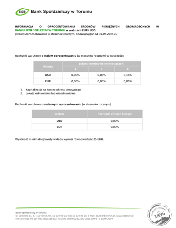 INFORMACJA O OPROCENTOWANIU ŚRODKÓW PIENIĘŻNYCH BANKU SPÓŁDZIELCZYM W TORUNIU w walutach EUR i USD. (stawki oprocentowania w stosunku rocznym, obowiązujące od 03.08.2015 r.) GROMADZONYCH Rachunki walutowe o stałym oprocentowaniu (w stosunku rocznym) w wysokości: Lokaty terminowe (w miesiącach) Waluta 1 3 6 USD 0,00% 0,05% 0,15% EUR 0,00% 0,00% 0,05% 1. Kapitalizacja na koniec okresu umownego 2. Lokata odnawialna lub nieodnawialna Rachunki walutowe o zmiennym oprocentowaniu (w stosunku rocznym). Waluta Rachunki a’vista i bieżące USD 0,00% EUR 0,00% Wysokość minimalnej kwoty wkładu wynosi równowartość 25 EUR. W PRODUKTY WYCOFANE Z OFERTY Rachunki walutowe o stałym oprocentowaniu (w stosunku rocznym) w wysokości: Lokaty terminowe (w miesiącach) Waluta 12 24 36 USD 0,25% 0,35% 0,40% EUR 0,15% 0,15% 0,15% Rachunki walutowe o zmiennym oprocentowaniu (w stosunku rocznym) w wysokości: Lokaty terminowe (w miesiącach) Waluta 6 12 24 36 USD LIBOR 6M minus 0,38 p.p. LIBOR 12M minus 0,71 p.p. LIBOR 12M minus 0,71 p.p. LIBOR 12M minus 0,71 p.p. EUR LIBOR 6M minus 0,03 p.p. LIBOR 12M minus 0,12 p.p. LIBOR 12M minus 0,12 p.p. LIBOR 12M minus 0,12 p.p. Oprocentowanie zmienne ustalane jest w odniesieniu do stawek LIBOR z przedostatniego dnia operacyjnego poprzedniego miesiąca. Stawka LIBOR na dzień 30.07.2015 r. 6M 12M USD 0,479900 0,813600 EUR 0,054860 0,165710 Biorąc pod uwagę powyższe założenia oprocentowanie lokat walutowych na dzień 30.07.2015 r. wynosiło: Waluta Lokaty terminowe (w miesiącach) 6 12 24 36 USD 0,10% 0,10% 0,10% 0,10% EUR 0,02% 0,05% 0,05% 0,05%