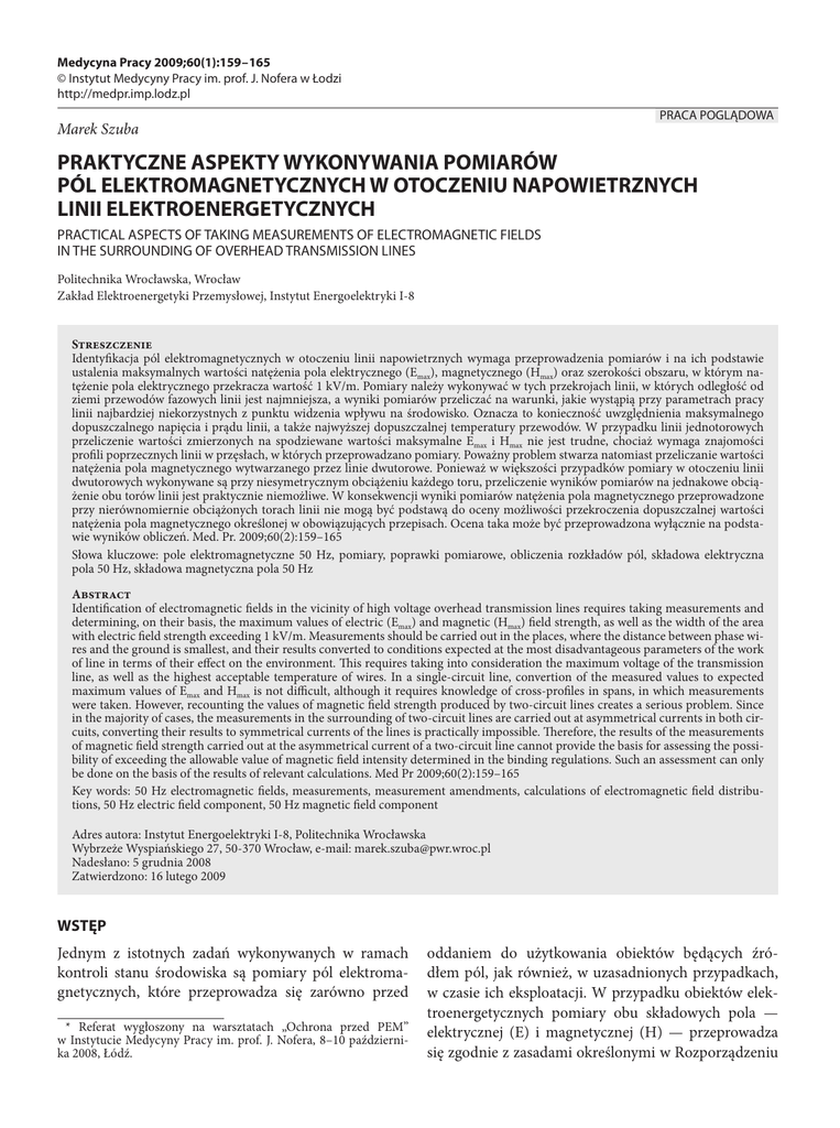 Medycyna Pracy 2009;60(1):159 – 165 © Instytut Medycyny Pracy im. prof. J. Nofera w Łodzi http://medpr.imp.lodz.pl PRACA POGLĄDOWA Marek Szuba PRAKTYCZNE ASPEKTY WYKONYWANIA POMIARÓW PÓL ELEKTROMAGNETYCZNYCH W OTOCZENIU NAPOWIETRZNYCH LINII ELEKTROENERGETYCZNYCH PRACTICAL ASPECTS OF TAKING MEASUREMENTS OF ELECTROMAGNETIC FIELDS IN THE SURROUNDING OF OVERHEAD TRANSMISSION LINES Politechnika Wrocławska, Wrocław Zakład Elektroenergetyki Przemysłowej, Instytut Energoelektryki I-8 Streszczenie Identyfikacja pól elektromagnetycznych w otoczeniu linii napowietrznych wymaga przeprowadzenia pomiarów i na ich podstawie ustalenia maksymalnych wartości natężenia pola elektrycznego (Emax), magnetycznego (Hmax) oraz szerokości obszaru, w którym natężenie pola elektrycznego przekracza wartość 1 kV/m. Pomiary należy wykonywać w tych przekrojach linii, w których odległość od ziemi przewodów fazowych linii jest najmniejsza, a wyniki pomiarów przeliczać na warunki, jakie wystąpią przy parametrach pracy linii najbardziej niekorzystnych z punktu widzenia wpływu na środowisko. Oznacza to konieczność uwzględnienia maksymalnego dopuszczalnego napięcia i prądu linii, a także najwyższej dopuszczalnej temperatury przewodów. W przypadku linii jednotorowych przeliczenie wartości zmierzonych na spodziewane wartości maksymalne Emax i Hmax nie jest trudne, chociaż wymaga znajomości profili poprzecznych linii w przęsłach, w których przeprowadzano pomiary. Poważny problem stwarza natomiast przeliczanie wartości natężenia pola magnetycznego wytwarzanego przez linie dwutorowe. Ponieważ w większości przypadków pomiary w otoczeniu linii dwutorowych wykonywane są przy niesymetrycznym obciążeniu każdego toru, przeliczenie wyników pomiarów na jednakowe obciążenie obu torów linii jest praktycznie niemożliwe. W konsekwencji wyniki pomiarów natężenia pola magnetycznego przeprowadzone przy nierównomiernie obciążonych torach linii nie mogą być podstawą do oceny możliwości przekroczenia dopuszczalnej wartości natężenia pola magnetycznego określonej w obowiązujących przepisach. Ocena taka może być przeprowadzona wyłącznie na podstawie wyników obliczeń. Med. Pr. 2009;60(2):159–165 Słowa kluczowe: pole elektromagnetyczne 50 Hz, pomiary, poprawki pomiarowe, obliczenia rozkładów pól, składowa elektryczna pola 50 Hz, składowa magnetyczna pola 50 Hz Abstract Identification of electromagnetic fields in the vicinity of high voltage overhead transmission lines requires taking measurements and determining, on their basis, the maximum values of electric (Emax) and magnetic (Hmax) field strength, as well as the width of the area with electric field strength exceeding 1 kV/m. Measurements should be carried out in the places, where the distance between phase wires and the ground is smallest, and their results converted to conditions expected at the most disadvantageous parameters of the work of line in terms of their effect on the environment. This requires taking into consideration the maximum voltage of the transmission line, as well as the highest acceptable temperature of wires. In a single-circuit line, convertion of the measured values to expected maximum values of Emax and Hmax is not difficult, although it requires knowledge of cross-profiles in spans, in which measurements were taken. However, recounting the values of magnetic field strength produced by two-circuit lines creates a serious problem. Since in the majority of cases, the measurements in the surrounding of two-circuit lines are carried out at asymmetrical currents in both circuits, converting their results to symmetrical currents of the lines is practically impossible. Therefore, the results of the measurements of magnetic field strength carried out at the asymmetrical current of a two-circuit line cannot provide the basis for assessing the possibility of exceeding the allowable value of magnetic field intensity determined in the binding regulations. Such an assessment can only be done on the basis of the results of relevant calculations. Med Pr 2009;60(2):159–165 Key words: 50 Hz electromagnetic fields, measurements, measurement amendments, calculations of electromagnetic field distributions, 50 Hz electric field component, 50 Hz magnetic field component Adres autora: Instytut Energoelektryki I-8, Politechnika Wrocławska Wybrzeże Wyspiańskiego 27, 50-370 Wrocław, e-mail: [email protected] Nadesłano: 5 grudnia 2008 Zatwierdzono: 16 lutego 2009 WSTĘP Jednym z istotnych zadań wykonywanych w ramach kontroli stanu środowiska są pomiary pól elektromagnetycznych, które przeprowadza się zarówno przed * Referat wygłoszony na warsztatach „Ochrona przed PEM” w Instytucie Medycyny Pracy im. prof. J. Nofera, 8–10 października 2008, Łódź. oddaniem do użytkowania obiektów będących źródłem pól, jak również, w uzasadnionych przypadkach, w czasie ich eksploatacji. W przypadku obiektów elektroenergetycznych pomiary obu składowych pola — elektrycznej (E) i magnetycznej (H) — przeprowadza się zgodnie z zasadami określonymi w Rozporządzeniu 160 M. Szuba z dnia 30 października 2003 r. w sprawie dopuszczalnych poziomów pól elektromagnetycznych w środowisku oraz sposobów sprawdzania dotrzymania tych poziomów (1), które wymaga zastosowania poprawek pomiarowych umożliwiających uwzględnienie parametrów pracy instalacji, które wytwarzają te pola, najbardziej niekorzystnych z punktu widzenia oddziaływania na środowisko. Wymóg ten wydaje się oczywisty, chociaż w wielu przypadkach prowadzi do znacznych błędów w ustaleniu spodziewanych (maksymalnych) poziomów pól, a niekiedy jest niemożliwy do spełnienia. Prowadzi to do sytuacji, w której wyniki pomiarów, w odniesieniu do których nie uwzględniono stosownych poprawek, mają niewielką wartość dla kontroli stanu środowiska w zakresie występowania w nim pól elektromagnetycznych. Może to 