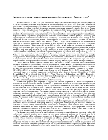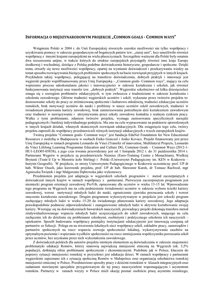 INFORMACJA O MIĘDZYNARODOWYM PROJEKCIE „COMMON GOALS - COMMON WAYS” Wstąpienie Polski w 2004 r. do Unii Europejskiej stworzyło szerokie możliwości nie tylko współpracy i uzyskiwania pomocy w zakresie gospodarczym od bogatszych państw tzw. „starej unii”, lecz umożliwiło również współpracę z innymi krajami europejskimi na wielu płaszczyznach. Szczególnie ważnymi dla Polski były ostatnie dwa rozszerzenia unijne, w trakcie których do struktur europejskich przystąpiły również inne kraje Europy środkowej i wschodniej, dzielące z Polską podobne doświadczenia historyczne, gospodarcze i społeczne. Dzięki temu, otwarły się nowe możliwości współpracy, opartej na wymianie doświadczeń i przekazywaniu wiedzy na temat sposobu rozwiązywania bieżących problemów społecznych na bazie rozwiązań przyjętych w innych krajach. Przykładem takiej współpracy, polegającej na transferze doświadczenia, dobrych praktyk i innowacji jest węgierski projekt współfinansowany przez Unię Europejską - „Common goals- Common ways”, mający na celu wspieranie procesu udoskonalania jakości i innowacyjności w zakresie kształcenia i szkoleń, jak również funkcjonowania instytucji oraz transfer tzw. „dobrych praktyk”. Węgierskie szkolnictwo od kilku dziesięcioleci zmaga się z szeregiem problemów edukacyjnych, w tym zwłaszcza z trudnościami w zakresie kształcenia i szkolenia zawodowego. Główne trudności węgierskich uczniów i szkół, wykazane przez twórców projektu to: dostosowanie szkoły do pracy ze zróżnicowaną społecznie i kulturowo młodzieżą, trudności edukacyjne uczniów romskich, brak motywacji uczniów do nauki i problemy w nauce uczniów szkół zawodowych, trudności w świadomym planowaniu kariery zawodowej, brak zainteresowania potrzebnym dziś kształceniem zawodowym oraz trudności w nawiązywaniu i utrzymywaniu przez szkoły zawodowe kontaktu z realnym rynkiem pracy. Walka z tymi problemami, zdaniem twórców projektu, wymaga zastosowania specyficznych narzędzi pedagogicznych i bardziej indywidualnego podejścia. Ma ono na celu wypracowanie na podstawie sprawdzonych w innych krajach działań, własnych skutecznych rozwiązań edukacyjnych. Dla osiągnięcia tego celu, twórcy projektu zaprosili do współpracy przedstawicieli różnych instytucji edukacyjnych z trzech europejskich krajów. Twórcą projektu “Common goals- Common ways” jest fundacja EduNet Foundation for New Educational Resources z siedzibą w Budapeszcie w osobach Eniko Gonczol i Aniko Kovacs. Projekt finansowany jest przez Unię Europejską w ramach programu Leonardo da Vinci (Transfer of innovation, Multilateral Projects, Leonardo da Vinci Lifelong Learning Programme Education and Culture DG, Common Goals – Common Ways (2012-1HU1-LEO05-05838), a jego czas trwania przewidziany jest od 1 listopada 2012 r. do 31 października 2014 r. Partnerami Węgrów w projekcie są przedstawiciele Niemiec (Euro-Training Centre z Monachium), Wielkiej Brytanii (Train’d Up w Menstrie koło Stirling) i Polski (Uniwersytet Pedagogiczny im. KEN w Krakowie – Instytut Geografii). W projekcie, ze strony Uniwersytetu Pedagogicznego w Krakowie uczestniczą: prof. UP dr hab. Wiktor Osuch, jako kierownik projektu, prof. UP dr hab. Sławomir Kurek, dr Tomasz Rachwał, mgr Agnieszka Świętek i mgr Małgorzata Dąbrowska jako wykonawcy. Przedmiotem projektu jest adaptacja w węgierskich szkołach programów i metod zaczerpniętych z doświadczeń innych krajów w ramach współpracy z partnerami. Pierwszym zaczerpniętym programem jest niemiecki program orientacji zawodowej ProVib, opracowany dla uczniów w wieku 13-15 lat. Wprowadzenie tego programu na Węgrzech ma na celu podniesienie świadomości uczniów w zakresie wyboru ścieżki kariery zawodowej, wzrost motywacji młodych ludzi do nauki, ograniczenie zjawiska porzucania szkoły i wzrost znaczenia kształcenia zawodowego. Drugim programem wykorzystywanym w projekcie jest szkocki program zachęcający młodych ludzi w wieku 15-20 do świadomego planowania kariery zawodowej. Jego adaptacja prawdopodobnie podniesie odpowiedzialność i zaangażowanie młodych ludzi w aktywne kształtowanie swojej kariery. Wzorując się na doświadczeniach bawarskich nauczycieli, prowadzący projekt dokonują transferu metod zindywidualizowanego wsparcia młodych ludzi uczęszczających do szkół zawodowych, mającego na celu zachęcenie ich do dzielenia się problemami szkolnymi, osobistymi i praktycznego szkolenia ich nauczycieli – opiekunów. Sposób budowania współpracy pomiędzy instytucjami edukacyjnymi jest innowacją czerpaną od partnerów ze Szkocji. Polega on na stworzeniu lokalnych sieci współpracy szkół, zakładów pracy, samorządów i partnerów społecznych na rzecz wsparcia rozwoju społeczności lokalnej, wykorzystywania zasobów na optymalnym poziomie i wspierania wysiłków społeczności na rzecz zmniejszenia współczynnika porzucania szkół przez uczniów, bez uzyskania przez nich wykształcenia zawodowego. Z doświadczeń polskich dla autorów projektu istotnym elementem są doświadczenia w zakresie znajomości problematyki edukacji Romów, którzy stanowią największą mniejszość etniczną na Węgrzech (ok. 3,5% populacji), dotkniętą silnie problemami społecznymi i ekonomicznymi. Podobnie jak w Polsce, kluczem do poprawy sytuacji mniejszości romskiej w przyszłości jest edukacja dzieci. W ramach współpracy z partnerami węgierskimi zapoznano ich z sytuacją społeczną Romów w Małopolsce oraz organizacją szkolnictwa romskiej mniejszości etnicznej w Polsce. Przedstawiono sposoby pracy z dziećmi romskimi w klasach integracyjnych oraz zadaniami stawianymi specjalnie przygotowanym do tej pracy nauczycielom wspomagającym i asystentom romskim. Partnerzy w ramach wizyty w Polsce mieli okazję poznać osobiście pracę asystenta romskiego, kierującego jedną ze specjalnie przygotowanych ś