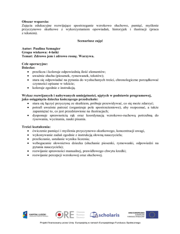 Obszar wsparcia: Zajęcia edukacyjne rozwijające spostrzeganie wzrokowo słuchowe, pamięć, myślenie przyczynowo skutkowe z wykorzystaniem opowiadań, historyjek i ilustracji (praca z tekstem). Scenariusz zajęć Autor: Paulina Szmagier Grupa wiekowa: 4-latki Temat: Zdrowo jem i zdrowo rosnę. Warzywa. Cele operacyjne: Dziecko: przelicza i koloruje odpowiednią ilość elementów; uważnie słucha (piosenek, rymowanek, tekstów); stara się odpowiadać na pytania do wysłuchanych treści, chronologiczne porządkować czynności opisane w tekście; koloruje zgodnie z instrukcją. Wykaz rozwijanych i nabywanych umiejętności, ujętych w podstawie programowej, jako osiągnięcia dziecka kończącego przedszkole: stara się łączyć przyczynę ze skutkiem, próbuje przewidywać, co się może zdarzyć; potrafi uważnie patrzeć (organizuje pole spostrzeżeniowe), aby rozpoznać, a także zapamiętać to, co jest przedstawione na ilustracjach; dysponuje sprawnością rąk oraz koordynacją wzrokowo-ruchową potrzebną do rysowania, wycinania, nauki pisania. Treści kształcenia: ćwiczenie pamięci i myślenia przyczynowo-skutkowego, koncentracji uwagi, wykonywanie zadań zgodnie z instrukcją słowną nauczyciela; przeliczanie, ustalanie wyniku liczenia; wzbogacanie słownictwa dziecka (słuchanie piosenki, rymowanki, odpowiedzi na pytania nauczyciela); rozwijanie sprawności manualnej, prawidłowego chwytu kredki; rozwijanie percepcji wzrokowej oraz słuchowej. Projekt finansowany przez Unię Europejską w ramach Europejskiego Funduszu Społecznego Opis sposobu realizacji: Lp. Rodzaj ćwiczenia 1. Nawiązanie do tematu zajęć. 2. Ćwiczenia usprawniające 3. Ćwiczenia właściwe Przebieg Czas 1. Pyszne i zdrowe, 3 min. warzywa kolorowe: słuchanie piosenki, zabawa muzycznoruchowa. Nauczyciel (N) zaprasza dzieci do wysłuchania piosenki i zabawy przy muzyce. Podczas odtwarzania utworu dzieci poruszają się w rytm muzyki „rysując w powietrzu” (na zmianę raz prawą, raz lewą ręką) kolejno: marchewkę, kapustę i pora. Dla ułatwienia N, prezentuje kolejne ruchy. 1. Smakołyki: 4 min. zabawy do wyboru przez dzieci: układanie puzzli multimedialnych, przeliczanie i kolorowanie odpowiedniej liczby warzyw na ilustracji, kolorowanka multimedialna. 1. Przepis na sałatkę 4 min. jarzynową: słuchanie tekstu. N zaprasza dzieci do uważnego wysłuchania przepisu. Może zachęcić dzieci mówiąc: wyobraźcie sobie, że jesteśmy kucharzami i zaraz przygotujemy pyszną sałatkę. Jednak najpierw, musimy się dowiedzieć jak ją zrobić. Po zapoznaniu się z tekstem, dzieci Uwagi o realizacji, warunki pobudzające aktywność dziecka W kąciku przyrody zgromadzone są świeże warzywa. Materiały: tekst piosenki (załącznik nr 5), podkład muzyczny (załącznik nr 6). Materiały: puzzle multimedialne (załącznik nr 8), ilustracja (załącznik nr 4), kolorowanka multimedialna (załącznik nr 7). Materiały: przepis kulinarny (załącznik nr 2). Projekt finansowany przez Unię Europejską w ramach Europejskiego Funduszu Społecznego odpowiadają na pytania dotyczące jego treści, próbują chronologicznie uporządkować poszczególne czynności opisane w przepisie. 4. Ćwiczenia kończące 2. Które warzywa 3 min. potrzebne są do przygotowania sałatki?: kolorowanie na ilustracji tylko tych warzyw które, będą potrzebne do sałatki. Po zajęciach dzieci mogą pomóc przy przygotowaniu sałatki. 1. Warzywa: 2 min. zabawy indywidualne zgodnie z zainteresowaniami dzieci: słuchanie rymowanki Warzywa i odpowiadanie na pytania do tekstu i/lub multimedialna gra typu memory. Materiały: ilustracja (załącznik nr 3). Materiały: tekst rymowanki (załącznik nr 1), gra multimedialna (załącznik nr 9). Uwagi: Propozycje zawarte w scenariuszu zostały przygotowane w taki sposób, aby nauczyciel mógł dostosować czas realizacji zajęć do możliwości dzieci w grupie oraz z zachowaniem tzw. zasady 1/5, zalecanej w części podstawy programowej dotyczącej zalecanych warunków i sposobu jej realizacji. Zajęcia nie powinny trwać dłużej niż 15 minut. Jeżeli niektóre dzieci pomimo upływu czasu są zainteresowane proponowanymi działaniami nie należy im przerywać tej aktywności. Dzieci, których uwaga się wyczerpała, w naturalny sposób powracają do realizacji „programu własnego”, czyli wybranego przez siebie rodzaju aktywności (np. zabawowej). Metody za M. Kwiatowską (1985): Czynne: ćwiczenia praktyczne, kierowanie własną działalnością, zadania stawiane dziecku, elementy kinezjologii edukacyjnej. Słowne: opowiadanie, rozmowy, objaśnienia, instrukcje. Percepcyjne: obserwacja i pokaz. Formy: praca indywidualna jednolita i zróżnicowana, grupowa jednolita. Środki dydaktyczne: Projekt finansowany przez Unię Europejską w ramach Europejskiego Funduszu Społecznego kredki, warzywa, arkusze papieru formatu A4 dla każdego dziecka, komputer z dostępem do Internetu oraz głośnikami lub tablica multimedialna, środki dydaktyczne zamieszczone na portalu Scholaris (dla nauczyciela do wykorzystania w pracy z dzieckiem): 1. Treść rymowanki Warzywa wraz z przykładowymi pytaniami – materiał do wydrukowania; 2. Przepis na sałatkę jarzynową wraz z przykładowymi pytaniami – materiał do wydrukowania; 3. Które warzywa potrzebne są do przygotowania sałatki?– materiał do wydrukowania; 4. Marchewki i ziemniaczki – materiał do wydrukowania; 5. Tekst piosenki - Pyszne, zdrowe, warzywa kolorowe; 6. Nagranie piosenki Pyszne, zdrowe, warzywa kolorowe; 7. Kolorowanka multimedialna Kosz z warzywami; 8. Puzzle multimedialne Smakołyki; 9. Multimedialna gra memory Warzywne memory. Projekt finansowany przez Unię Europejską w ramach Europejskiego Funduszu Społecznego