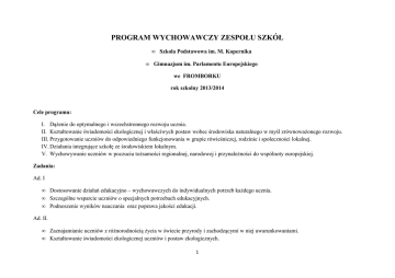 PROGRAM WYCHOWAWCZY ZESPOŁU SZKÓŁ • Szkoła Podstawowa im. M. Kopernika • Gimnazjum im. Parlamentu Europejskiego we FROMBORKU rok szkolny 2013/2014 Cele programu: I. Dążenie do optymalnego i wszechstronnego rozwoju ucznia. II. Kształtowanie świadomości ekologicznej i właściwych postaw wobec środowiska naturalnego w myśl zrównoważonego rozwoju. III. Przygotowanie uczniów do odpowiedniego funkcjonowania w grupie rówieśniczej, rodzinie i społeczności lokalnej. IV. Działania integrujące szkołę ze środowiskiem lokalnym. V. Wychowywanie uczniów w poczuciu tożsamości regionalnej, narodowej i przynależności do wspólnoty europejskiej. Zadania: Ad. I • Dostosowanie działań edukacyjno – wychowawczych do indywidualnych potrzeb każdego ucznia. • Szczególne wsparcie uczniów o specjalnych potrzebach edukacyjnych. • Podnoszenie wyników nauczania oraz poprawa jakości edukacji. Ad. II. • Zaznajamianie uczniów z różnorodnością życia w świecie przyrody i zachodzącymi w niej uwarunkowaniami. • Kształtowanie świadomości ekologicznej uczniów i postaw ekologicznych. 1 • Kontynuacja przedsięwzięć promujących zdrowie i racjonalne odżywianie się oraz zdrowy styl życia. Ad. III. • • • • Kształtowanie zachowań sprzyjających zdrowiu, bezpieczeństwu w szkole i poza nią. Doskonalenie u uczniów postaw prospołecznych. Przygotowanie do życia w rodzinie i w społeczności lokalnej. Przeciwdziałanie wykluczeniu społecznemu. Ad. IV. • Organizowanie imprez na rzecz społeczności szkolnej i lokalnej zgodnie z tradycją szkoły /załącznik: Kalendarz imprez/. • Uaktywnianie rodziców (praca na rzecz szkoły). • Działania zmierzające do pogłębienia wiedzy i umiejętności wychowawczej rodziców. Ad. V. • Rozwijanie zainteresowania kulturą regionu i życiem społeczności lokalnej. • Pielęgnowanie postaw patriotycznych i poczucia tożsamości narodowej. • Działania prowadzące do pogłębiania u uczniów wiedzy o Unii Europejskiej. Źródła planowania: • Analiza wyników sprawdzianów i egzaminów zewnętrznych. • Wnioski z posiedzeń rady pedagogicznej. • Plany doskonalenia zawodowego nauczycieli. Metody pracy: • Praca z książką • Lekcje biblioteczne 2 • • • • • • • Lekcje w środowisku przyrodniczym (wycieczki, rajdy, biwaki) Lekcje muzealne, spotkania z ciekawymi ludźmi Gry i zabawy sportowe Uroczystości szkolne i środowiskowe Praca w kołach zainteresowań Zajęcia z pedagogiem szkolnym, pielęgniarką medycyny szkolnej, logopedą Zajęcia w szkolnym Klubie Wolontariatu Formy pracy: • Indywidualna • Grupowa Ewaluacja programu przeprowadzona poprzez: • • • • • Obserwacje zachowań uczniów Wywiady z uczniami, nauczycielami i rodzicami Prace praktyczne uczniów Dyskusje Wewnętrzne mierzenie jakości pracy szkoły PLAN DZIAŁAŃ WYCHOWAWCZYCH Lp. I. Dążenie do optymalnego i wszechstronnego rozwoju ucznia. Zadanie szczegółowe Dostosowanie działań edukacyjno – wychowawczych do indywidualnych potrzeb każdego ucznia. Sposoby i formy realizacji Odpowiedzialni - Integracja zespołu klasowego poprzez organizowanie imprez, wychowawcy opracowanie regulaminu klasowego oraz kalendarza imprez. - Wykorzystywanie w procesie dydaktycznym technik nauczyciele informacyjnych i informatycznych. - Stosowanie metod aktywizujących. nauczyciele 3 - Wychodzenie naprzeciw potrzebom uczniów poprzez rozwijanie dyrektor, nauczyciele ich zainteresowań. - Organizowanie zajęć dodatkowych dla uczniów. dyrektor, nauczyciele - Poszerzanie działalności szkoły poprzez organizację wycieczek do kina, muzeów i teatru, nawiązanie współpracy z instytucjami kulturalnymi. - Udział uczniów w różnych imprezach klasowych, szkolnych i lokalnych. - Udział uczniów w konkursach i olimpiadach przedmiotowych. - Ślubowanie uczniów klasy I szkoły podstawowej i klasy I gimnazjum. - Organizacja pracy w szkolnym radiowęźle – gimnazjum - Realizacja projektów edukacyjnych zgodnie z predyspozycjami i zainteresowaniami uczniów. - -wspieranie rozwoju dziecka młodszego w związku z obniżeniem wieku realizacji obowiązku szkolnego – 6 latek w szkole. Szczególne wsparcie uczniów Prowadzenie działalności korekcyjnej, wyrównawczej o specjalnych potrzebach i rewalidacyjnej poprzez: zajęcia korekcyjno – kompensacyjne, edukacyjnych. zajęcia dydaktyczno- wyrównawcze, zajęcia logopedyczne, zajęcia dla dyslektyków, zajęcia dla uczniów mających trudności w czytaniu i pisaniu. - Spotkania zespołów nauczycieli w celu opracowania Indywidualnych Programów Edukacyjno Terapeutycznych dla uczniów z orzeczeniami. - Organizowanie pracy z uczniem zdolnym. - Organizowanie pracy z uczniem chorym i sprawiającym trudności wychowawcze. Podnoszenie wyników nauczyciele, wychowawcy klas nauczyciele, wychowawcy nauczyciele wychowawcy opiekun radiowęzła realizatorzy projektów dyrektor, pedagog, wychowawca Pedagog, logopeda, nauczyciele Pedagog zespół nauczycieli Pedagog, nauczyciele Pedagog, nauczyciele - Zajęcia dla uczniów klasy VI szkoły podstawowej i klas III Dyrektor, nauczyciele 4 nauczania oraz poprawa jakości edukacji. gimnazjum przygotowujące do sprawdzianu i egzaminu. - Przeprowadzenie próbnych sprawdzianów w klasie II i VI szkoły Dyrektor, nauczyciele podstawowej oraz w II i III klasie gimnazjum. - Sprawdzian w klasie III i VI szkoły podstawowej oraz egzamin w III klasie gimnazjum - Zajęcia dla uczniów zdolnych – przygotowanie do konkursów i olimpiad. - Podwyższanie poziomu przygotowania merytorycznego i pedagogicznego nauczycieli poprzez doskonalenie zawodowe: kursy, studia podyplomowe, szkolenia, rady pedagogiczne itp. - Systematyczne doposażenie szkoły w nowoczesny sprzęt i pomoce dydaktyczne. - Wnikliwa ocena jakości pracy szkoły dokonywana poprzez zespół do spraw ewaluacji wewnętrznej szkoły. - Organizacja zajęć wyrównawczych skierowanych do uczniów z 