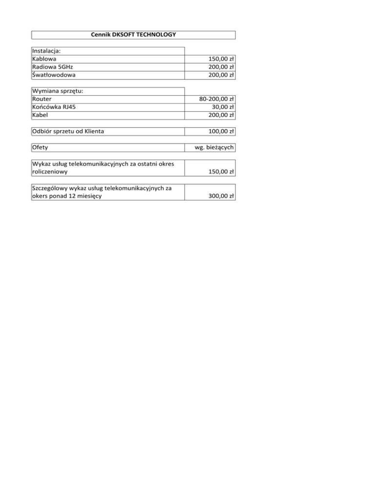 Cennik DKSOFT TECHNOLOGY Instalacja: Kablowa