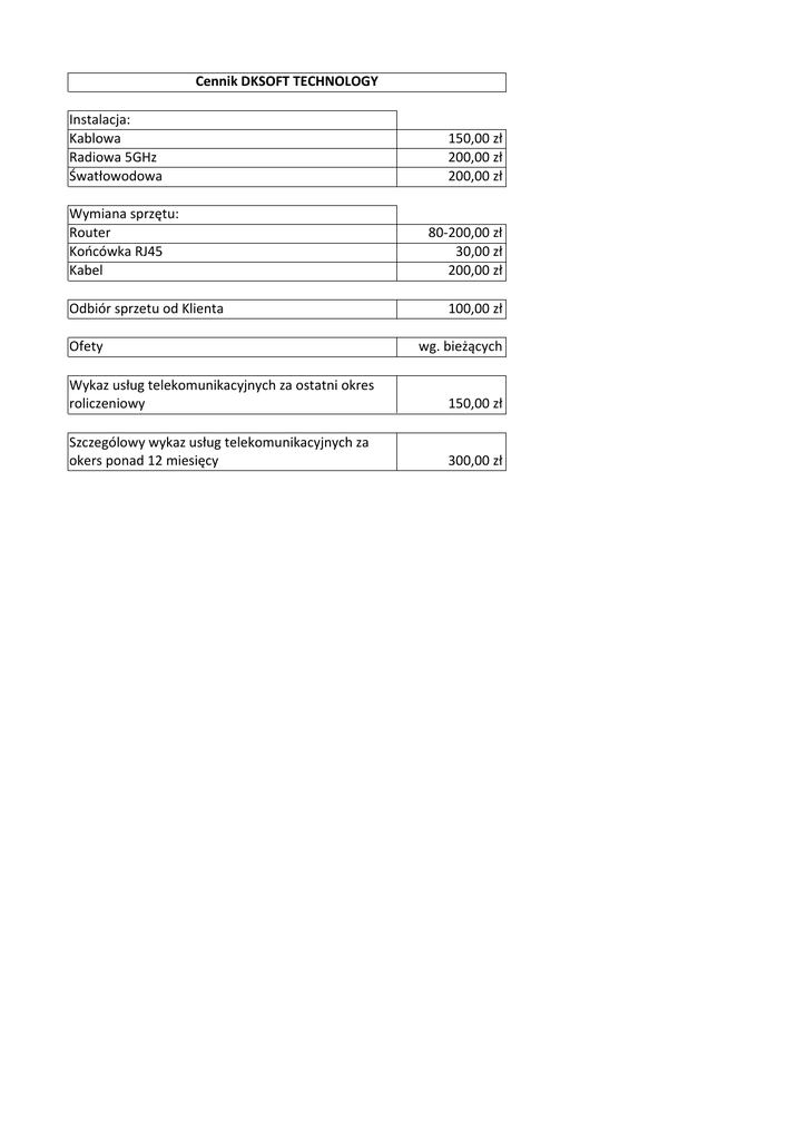 Cennik DKSOFT TECHNOLOGY Instalacja: Kablowa Radiowa 5GHz Śwatłowodowa Wymiana sprzętu: Router Końcówka RJ45 Kabel Odbiór sprzetu od Klienta Ofety 150,00 zł 200,00 zł 200,00 zł 80-200,00 zł 30,00 zł 200,00 zł 100,00 zł wg. bieżących Wykaz usług telekomunikacyjnych za ostatni okres roliczeniowy 150,00 zł Szczególowy wykaz usług telekomunikacyjnych za okers ponad 12 miesięcy 300,00 zł