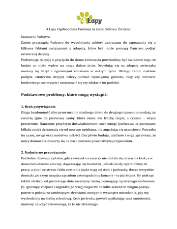 4 Łapy Ogólnopolska Fundacja na rzecz Ochrony Zwierząt Szanowni Państwo, Zanim przystąpią Państwo do wypełniania ankiety zapraszam do zapoznania się z kilkoma faktami związanymi z adopcją, które być może pomogą Państwu podjąć ostateczną decyzję. Podejmując decyzję o przyjęciu do domu zwierzęcia powinniśmy być świadomi tego, że będzie to miało wpływ na nasze dalsze życie. Decydując się na adopcję zwierzaka musimy się liczyć z ogromnymi zmianami w naszym życiu. Dlatego zanim zostanie podjęta ostateczna decyzja należy poznać wymagania gatunku, rasy czy wreszcie konkretnego zwierzęcia i zastanowić się czy zdołacie im podołać. Podstawowe problemy, które mogą wystąpić: 1. Brak przywiązania Długa bezdomność albo przerzucanie z jednego domu do drugiego czasem powodują, że zwierzę lgnie do pierwszej osoby, która okaże mu trochę ciepła, a czasem – wręcz przeciwnie. Nauczone przykrym doświadczeniem czworonogi (zwłaszcza te porzucane kilkakrotnie) dystansują się od nowego opiekuna, nie angażując się uczuciowo. Potrzeba im czasu, uwagi oraz mnóstwa miłości. Cierpliwie budując zaufanie i więź, sprawimy, że nowy domownik otworzy się na nas i zostanie prawdziwym przyjacielem. 2. Nadmierne przywiązanie Pochlebia i bywa przydatne, gdy zwierzak na smyczy nie oddala się od nas na krok, a w domu bezustannie adoruje, dopraszając się kontaktu. Jednak, kiedy wychodzimy do pracy, a pupil ze stresu i bólu rozstania zjada nogę od stołu i poduszkę, tłucze wszystkie doniczki, po czym urządza sąsiadom czterogodzinny koncert – to już kłopot. By uniknąć takich atrakcji, od pierwszego dnia zacznijmy naukę, wymagając spokojnego zostawania (tj. ignorując rozpacz i nagradzając ciszę) najpierw na kilka sekund w drugim pokoju, potem w pokoju za zamkniętymi drzwiami, następnie wewnątrz mieszkania, gdy my wychodzimy na klatkę schodową. Krok po kroku, powoli wydłużając czas samotności, możemy nauczyć czworonoga, że to nic strasznego. 4 Łapy Ogólnopolska Fundacja na rzecz Ochrony Zwierząt 3.Strach Skrzywdzone zwierzę, nieraz bite, a czasem wręcz torturowane w poprzednim „domu”, często reaguje paniką na wszelkie próby porozumienia ze strony człowieka. Lekarstwem jest czas, cierpliwa łagodność, niewymuszone relacje z przewodnikiem (zwłaszcza nagradzanie każdej próby nawiązania kontaktu). Obowiązuje zasada: nic na siłę i nic szybko, bo tego uzasadnionego przecież lęku nie da się przełamać, można go co najwyżej oswoić i stopniowo wyciszyć. 4. Agresja Najczęściej bywa lękowa (nabyta wskutek złych doświadczeń czy zbyt wczesnego oddzielenia od matki) bądź wyuczona (spowodowana szczuciem, umyślnym drażnieniem i/lub przemocą). Postępowanie z psem agresywnym zawsze musi być starannie zaplanowane i jeśli nie jesteśmy pewni słuszności wyboru metody, poradźmy się dobrego szkoleniowca. Generalnie zawsze chodzi o to, by po pierwsze uniemożliwić ataki – do czego potrzebna jest smycz, zwykle również kaganiec, a na pewno oczy dookoła głowy – a po drugie skojarzyć obiekt niechęci z przyjemnymi bodźcami, obficie nagradzając spokój. Ten proces odczulania może trwać bardzo długo, ale jest jedyną naprawdę efektywną metodą wyciszenia agresji. 5. Żarłoczność Okresy śmiertelnego głodu potrafią całkowicie zmienić podejście do jedzenia. Wychudzone czworonogi nieraz nie mogą odejść od pełnej miski, jedząc tak wiele, jak mogą pomieścić ich żołądki. A potem jeszcze więcej. To niebezpieczne dla zdrowia, powinniśmy zatem reglamentować pożywienie – wydzielać kilka niewielkich porcji dziennie, dopóki układ pokarmowy naszego ulubieńca nie przyzwyczai się do nowych warunków. Potem bywa różnie, bo część zwierzaków zaczyna przyjmować obfitość przysmaków za stan naturalny (te mogą mieć zawsze pełną miskę), inne zaś już zawsze 4 Łapy Ogólnopolska Fundacja na rzecz Ochrony Zwierząt starają się wchłonąć wszystkie jadalne produkty w zasięgu wzroku (trzeba pilnować ich posiłków). 7. Brudzenie Ten trywialny problem potrafi zniechęcić początkującego opiekuna, na szczęście stosunkowo łatwo go wyeliminować – pod warunkiem, że odpuścimy sobie taktykę krzyków i kar w reakcji na niespodzianki zostawione na dywanie, bo to prędzej przyniesie odwrotne efekty. Pamiętajmy, że w warunkach schroniskowych futrzak zwykle nie miał innego wyjścia, niż załatwiać się w swoim boksie. Najczęściej nie trzeba więc robić nic specjalnego, wystarczy poczekać, aż pies przyzwyczai się do określonych prób spacerów. 8. Ucieczki Nieznajomość nowego otoczenia, a niekiedy również przyzwyczajenie powodują częste ucieczki. W pierwszej kolejności należy po prostu do nich nie dopuścić, trzymając czworonoga na smyczy, dopóki nie mamy pewności, że wróci do nas na wołanie, a następnie pokazać mu, że to my jesteśmy bardziej interesujący niż świat po drugiej stronie ulicy, lepiej więc zostać w nowym domu niż szukać szczęścia na własną łapę. 10. Zniszczenia w domu Prawie zawsze wynikają ze stresu spowodowanego brakiem pewności siebie, tęsknotą za człowiekiem, nieumiejętnością bycia samemu. W pewnym stopniu pomogą gryzaki, na których zwierzak będzie mógł wyładować relaksującą potrzebę żucia. Najważniejszy jest jednak trening mający na celu częściowe usamodzielnienie psa, podbudowanie jego psychiki, a także nauczenie spokojnego czekania na powrót opiekuna. Możemy wykorzystać klatkę kennelową, o ile dowiemy się, jak z niej prawidłowo korzystać. Odpowiedzialna i przemyślana adopcja jest najważniejszym czynnikiem wpływającym na to, czy Twój zwierzak spełni Twoje oczekiwania i czy będziecie razem szczęśliwi. 4 Łapy Ogólnopolska Fundacja na rzecz Ochrony Zwierząt Jeżeli powyższe treści nie zmieniły Państwa zdania na temat adopcji, zapraszamy do wypełnienia ankiety.