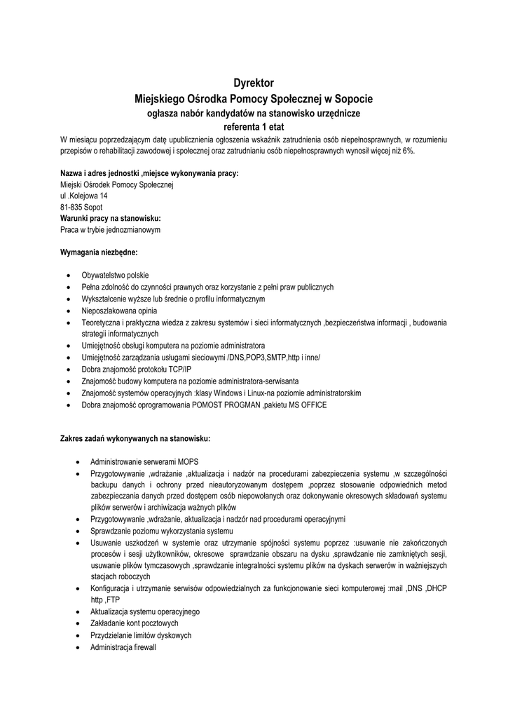 Dyrektor Miejskiego Ośrodka Pomocy Społecznej w Sopocie ogłasza nabór kandydatów na stanowisko urzędnicze referenta 1 etat W miesiącu poprzedzającym datę upublicznienia ogłoszenia wskaźnik zatrudnienia osób niepełnosprawnych, w rozumieniu przepisów o rehabilitacji zawodowej i społecznej oraz zatrudnianiu osób niepełnosprawnych wynosił więcej niż 6%. Nazwa i adres jednostki ,miejsce wykonywania pracy: Miejski Ośrodek Pomocy Społecznej ul .Kolejowa 14 81-835 Sopot Warunki pracy na stanowisku: Praca w trybie jednozmianowym Wymagania niezbędne: Obywatelstwo polskie Pełna zdolność do czynności prawnych oraz korzystanie z pełni praw publicznych Wykształcenie wyższe lub średnie o profilu informatycznym Nieposzlakowana opinia Teoretyczna i praktyczna wiedza z zakresu systemów i sieci informatycznych ,bezpieczeństwa informacji , budowania strategii informatycznych Umiejętność obsługi komputera na poziomie administratora Umiejętność zarządzania usługami sieciowymi /DNS,POP3,SMTP,http i inne/ Dobra znajomość protokołu TCP/IP Znajomość budowy komputera na poziomie administratora-serwisanta Znajomość systemów operacyjnych :klasy Windows i Linux-na poziomie administratorskim Dobra znajomość oprogramowania POMOST PROGMAN ,pakietu MS OFFICE Zakres zadań wykonywanych na stanowisku: Administrowanie serwerami MOPS Przygotowywanie ,wdrażanie ,aktualizacja i nadzór na procedurami zabezpieczenia systemu ,w szczególności backupu danych i ochrony przed nieautoryzowanym dostępem ,poprzez stosowanie odpowiednich metod zabezpieczania danych przed dostępem osób niepowołanych oraz dokonywanie okresowych składowań systemu plików serwerów i archiwizacja ważnych plików Przygotowywanie ,wdrażanie, aktualizacja i nadzór nad procedurami operacyjnymi Sprawdzanie poziomu wykorzystania systemu Usuwanie uszkodzeń w systemie oraz utrzymanie spójności systemu poprzez :usuwanie nie zakończonych procesów i sesji użytkowników, okresowe sprawdzanie obszaru na dysku ,sprawdzanie nie zamkniętych sesji, usuwanie plików tymczasowych ,sprawdzanie integralności systemu plików na dyskach serwerów in ważniejszych stacjach roboczych Konfiguracja i utrzymanie serwisów odpowiedzialnych za funkcjonowanie sieci komputerowej :mail ,DNS ,DHCP http ,FTP Aktualizacja systemu operacyjnego Zakładanie kont pocztowych Przydzielanie limitów dyskowych Administracja firewall Przydzielanie uprawnień użytkownikom Projektowanie sieci Diagnostyka obciążenia sieci Nadzór nad instalacją, konfiguracją i utrzymaniem w sprawności sprzętu komputerowego i oprogramowania systemowego Nadzór nad instalacją, konfiguracją i utrzymaniem w sprawności aplikacji zainstalowanych użytkowników Organizowanie środowiska sieci lokalnej i rozległej Instalowanie oprogramowania w sieci Udzielanie pomocy użytkownikom w zakresie poprawnego dostępu do zasobów informatycznych ,systemów dziedzinowych POMOST,PROGMAN Pomoc i udzielanie konsultacji pracownikom MOPS w zakresie konfiguracji komputerów i programów w celu uzyskania poprawnego dostępu da zasobów sieci komputerowych Ustalanie zezwoleń na korzystanie z oprogramowania Przyłączanie stacji roboczych do sieci komputerowej Ośrodka Projektowanie nowych stanowisk komputerowych Obsługa informatyczna wszystkich działów MOPS Organizowanie dostępu do baz danych Nadzorowanie zakupu sprzętu komputerowego we współpracy z kierownikiem DAT oraz uczestniczenie w przygotowaniu przetargów na sprzęt informatyczny Zarządzanie licencjami na oprogramowaniu Administrowanie serwerami plików Aktualizowanie informacji w BIP Zarządzanie stronami WWW i aktualizacja witryny WWW.mopssopot.pl Serwisowanie komputerów i przeprowadzanie modernizacji sprzętu i oprogramowania Wykonywanie obowiązków Administratora Systemu Informatycznego Znajomość zagadnień bezpieczeństwa danych Oferty kandydatów muszą zawierać: CV-życiorys List motywacyjny Kwestionariusz osobowy kandydata Kserokopie dyplomów potwierdzających wykształcenie Oświadczenie o posiadaniu obywatelstwa polskiego Oświadczenie o posiadaniu pełnej zdolności do czynności prawnych oraz korzystaniu z pełni praw publicznych Oświadczenie o braku przeciwwskazań do zatrudnienia na określonym stanowisku Oświadczenie kandydata o braku skazania prawomocnym wyrokiem sądu za umyślne przestępstwo ścigane z oskarżenia publicznego lub umyślne przestępstwo skarbowe Oświadczenie ,że kandydat cieszy się nieposzlakowaną opinią Oświadczenie o wyrażeniu zgody na przetwarzanie danych osobowych zawartych w ofercie dla potrzeb niezbędnych do realizacji procesu rekrutacji Miejsce i termin składania dokumentów: Oferty z wymaganymi dokumentami kandydaci winni składać w zamkniętych i zaadresowanych kopertach z dopiskiem „Nabór na stanowisko referenta Miejskiego Ośrodka Pomocy Społecznej w Sopocie do dnia 7 grudnia 2016r. do godz.12.00 w sekretariacie pok.1-1 Miejskiego Ośrodka Pomocy Społecznej w Sopocie 81-835 Sopot ul .Kolejowa 14. Oferty można składać osobiście lub drogą pocztową -decyduje data wpływu. Dokumenty, które wpłyną po wyżej określonym terminie nie będą rozpatrywane. Dodatkowe informacje: Kandydaci spełniający wymogi formalne zostaną poinformowani telefonicznie o terminie i miejscu dalszego postępowania rekrutacyjnego(test kompetencyjny oraz rozmowa kwalifikacyjna). Informacja o wynikach naboru będzie umieszczona w Biuletynie Informacji Publicznej Miejskiego Ośrodka Pomocy Społecznej w Sopocie( www.bip.mopssopot.pl ) oraz na tablicy informacyjnej Miejskiego Ośrodka Pomocy Społecznej w Sopocie, ul. Kolejowa 14. Dokumenty aplikacyjne wybranego i zatrudnionego kandydata zostaną dołączone do jego akt osobowych. Pozostałe dokumenty nie odebrane przez kandydata w terminie 3 miesięcy od daty upowszechnienia informacji o wyniku naboru ,zostaną komisyjnie zniszczone. Druki oświadczeń a także kwestionariusz osobowy kandydata są do