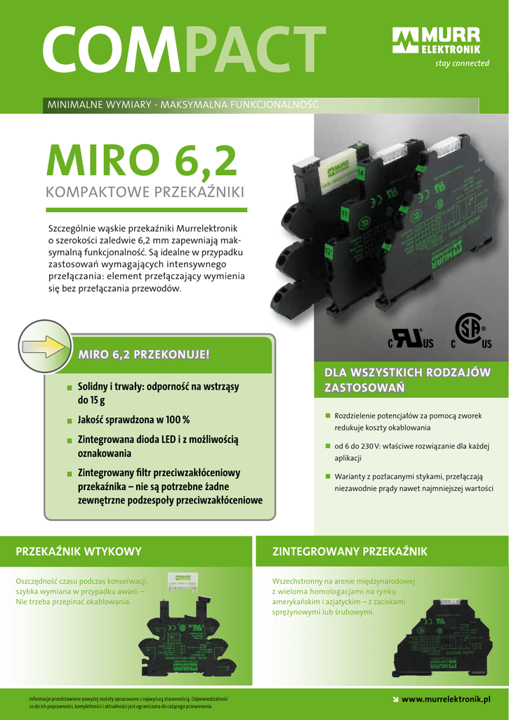 MINIMALNE WYMIARY - MAKSYMALNA FUNKCJONALNOŚĆ MIRO 6,2 KOMPAKTOWE PRZEKAŹNIKI Szczególnie wąskie przekaźniki Murrelektronik o szerokości zaledwie 6,2 mm zapewniają maksymalną funkcjonalność. Są idealne w przypadku zastosowań wymagających intensywnego przełączania: element przełączający wymienia się bez przełączania przewodów. miro 6,2 PRZEKONUJE! Solidny i trwały: odporność na wstrząsy do 15 g DLA WSZYSTKICH RODZAJÓW ZASTOSOWAŃ Jakość sprawdzona w 100 % Rozdzielenie potencjałów za pomocą zworek Zintegrowana dioda LED i z możliwością oznakowania od 6 do 230 V: właściwe rozwiązanie dla każdej Zintegrowany filtr przeciwzakłóceniowy przekaźnika – nie są potrzebne żadne zewnętrzne podzespoły przeciwzakłóceniowe redukuje koszty okablowania aplikacji Warianty z pozłacanymi stykami, przełączają niezawodnie prądy nawet najmniejszej wartości PRZEKAŹNIK WTYKOWY ZINTEGROWANY PRZEKAŹNIK Oszczędność czasu podczas konserwacji, szybka wymiana w przypadku awarii – Nie trzeba przepinać okablowania. Wszechstronny na arenie międzynarodowej z wieloma homologacjami na rynku amerykańskim i azjatyckim – z zaciskami sprężynowymi lub śrubowymi. enthaltenen powyżej Angabenzostały wurdenopracowane mit der größtmöglichen Sorgfalt erarbeitet. Für die Richtigkeit, InformacjeDie przedstawione z najwyższą starannością. Odpowiedzialność Vollständigkeit und Aktualität ist die Haftung auf grobes do Verschulden begrenzt. co do ich poprawności, kompletności i aktualności jest ograniczona rażącego przewinienia. ÔÔ Ô www.murrelektronik.com Ô www.murrelektronik.pl PRZEKAŹNIK WYJŚCIOWY: min. 100 mA, max. 6 A Napięcie znamionowe Przekaźnik zintegrowany Zaciski śrubowe Zaciski sprężynowe 6 V AC/DC 12 V AC/DC 52050 6652050 24 V AC/DC 52001 6652001 60 V AC/DC 125 V AC 52030 6652030 230 V AC 52040 6652040 Przekaźnik wtykowy Zaciski Push-In 3000-16023-3100022 3000-16023-3100005 3000-16013-3100020 3000-16513-3100022 3000-16013-3100025 3000-16013-3100030 Przekaźnik zapasowy 3000-16023-2100000 3000-16023-2100005 3000-16023-2100010 3000-16023-2100020 3000-16023-2100020 3000-16023-2100020 PRZEKAŹNIK WEJŚCIOWY: min. 1 mA, max. 50 mA Napięcie znamionowe 24 V AC/DC 125 V AC 230 V AC Przekaźnik zintegrowany Zaciski śrubowe 52003 52031 52041 Przekaźnik wtykowy Zaciski sprężynowe Zaciski Push-In Przekaźnik zapasowy 6652003 3000-16013-3100040* 3000-16023-2100030 6652031 6652041 Opis Zworka potencjałowa 2-stykowa Kolor szara Nr kat. 90961 Szyna potencjałowa 10-pinowa tylko dla zacisków śrubowych czerwona 90976 Szyna potencjałowa 10-pinowa tylko dla zacisków śrubowych niebieska 90975 Łańcuch elastyczny 16-pinowy dla zacisków sprężynowych czarny 90977 *min. 10 mA AKCESORIA Przekaźnik zintegrowany Przekaźnik wtykowy Opis Kolor Nr kat. Szyna potencjałowa 20-pinowa czarna 3000-90000-0300020 Szyna potencjałowa 20-pinowa niebieska 3000-90000-0300010 Płytka izolacyjna* 3000-90000-0300030 *do separacji między niskim napięciem (PELV/SELV) i innymi napięciami POTRZEBNA JEST MAKSYMALNA LICZBA CYKLÓW PRZEŁĄCZANIA? Polecamy Państwu w tym przypadku optoizolator. Murrelektronik oferuje szeroki i sprawdzony asortyment produktów. przedstawione powyżej opracowane zSorgfalt najwyższą starannością. DieInformacje enthaltenen Angaben wurden mitzostały der größtmöglichen erarbeitet. Für dieOdpowiedzialność Richtigkeit, co do ich poprawności, kompletności i aktualności jest ograniczona rażącego przewinienia. Vollständigkeit und Aktualität ist die Haftung auf grobes Verschuldendo begrenzt. ÔÔ www.murrelektronik.pl