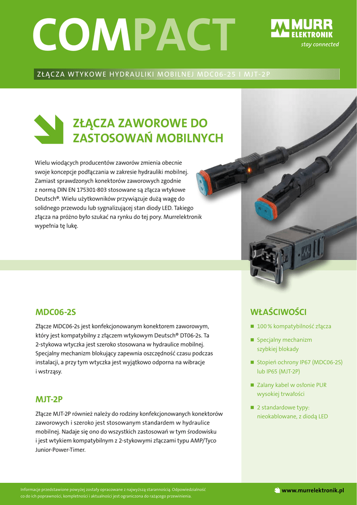COMPACT Z Ł Ą C Z A WTY KOWE HY D R A UL IKI MO B ILN EJ MDC 06- 25 I MJ T- 2P ZŁĄCZA ZAWOROWE DO ZASTOSOWAŃ MOBILNYCH Wielu wiodących producentów zaworów zmienia obecnie swoje koncepcje podłączania w zakresie hydrauliki mobilnej. Zamiast sprawdzonych konektorów zaworowych zgodnie z normą DIN EN 175301-803 stosowane są złącza wtykowe Deutsch®. Wielu użytkowników przywiązuje dużą wagę do solidnego przewodu lub sygnalizującej stan diody LED. Takiego złącza na próżno było szukać na rynku do tej pory. Murrelektronik wypełnia tę lukę. MDC06-2s WŁAŚCIWOŚCI Złącze MDC06-2s jest konfekcjonowanym konektorem zaworowym, który jest kompatybilny z złączem wtykowym Deutsch® DT06-2s. Ta 2-stykowa wtyczka jest szeroko stosowana w hydraulice mobilnej. Specjalny mechanizm blokujący zapewnia oszczędność czasu podczas instalacji, a przy tym wtyczka jest wyjątkowo odporna na wibracje i wstrząsy. 100 % kompatybilność złącza Specjalny mechanizm szybkiej blokady Stopień ochrony IP67 (MDC06-2S) lub IP65 (MJT-2P) Zalany kabel w osłonie PUR MJT-2P Złącze MJT-2P również należy do rodziny konfekcjonowanych konektorów zaworowych i szeroko jest stosowanym standardem w hydraulice mobilnej. Nadaje się ono do wszystkich zastosowań w tym środowisku i jest wtykiem kompatybilnym z 2-stykowymi złączami typu AMP/Tyco Junior-Power-Timer. Informacje przedstawione powyżej zostały opracowane z najwyższą starannością. Odpowiedzialność co do ich poprawności, kompletności i aktualności jest ograniczona do rażącego przewinienia. wysokiej trwałości 2 standardowe typy: nieokablowane, z diodą LED ÔÔ www.murrelektronik.pl COMPACT | ZŁĄCZA ZAWOROWE z wolnym końcem przewodu Złącze MJT-2P Złącze MDC06-2S proste proste 1 Typ Nr 70001 70021 Okablowanie 12...230 V AC/DC, 4 A 12...30 V AC/DC, 4 A bez elektroniki Schemat połączeń brązowa brown 1 brązowa brown 1 72001 72021 12...230 V AC/DC, 4 A bez elektroniki 12...30 V AC/DC, 4 A brązowa brown 1 brązowa brown 1 yellow niebieska blue 2 yellow niebieska blue 2 niebieska blue 2 Układ styków 15 24 2 2 Typ przewodu niebieska blue 2 1 2 Kolor izolacji Kolor izolacji Przekrój żył 0,75 mm czarny PUR 754 PUR/PVC 750 Kolor izolacji czarny 2 1 czarny 754 0 750 Kolor izolacji czarny 754 3 Długość przewodu 3 Długość przewodu 1,5 m 3,0 m 5,0 m 7,5 m 10,0 m 0150 0300 0500 0750 1000 0150 0300 0500 0750 1000 Numer artykułu 7 0 7 2 – – 1 Typ Informacje przedstawione powyżej zostały opracowane z najwyższą starannością. Odpowiedzialność co do ich poprawności, kompletności i aktualności jest ograniczona do rażącego przewinienia. 2 Typ przewodu ÔÔ www.murrelektronik.pl