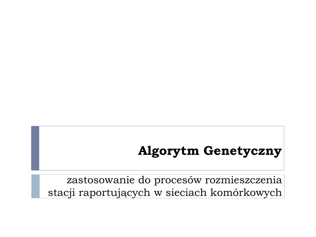 Algorytm Genetyczny zastosowanie do procesów rozmieszczenia stacji raportujących w sieciach komórkowych Dlaczego Algorytmy Inspirowane Naturą? Rozwój nowych technologii: złożone problemy obliczeniowe w nauce i technice XX i XXI wieku: duże przestrzenie potencjalnych rozwiązań rozwiązania suboptymalne są zadowalające dla wielu zastosowań jak odnaleźć w rozsądnym czasie dobre (suboptymalne) rozwiązanie Tradycyjne metody poszukiwania rozwiązań realnych problemów były mało efektywne Konieczność opracowania nowych algorytmów przeszukiwania przestrzeni rozwiązań: mechanizmy Natury i biologii są bardzo obiecujące Złożoność Problemów Problem klasy P (ang. deterministic polynomial deterministycznie wielomianowy) to problem decyzyjny, dla którego rozwiązanie można znaleźć w czasie wielomianowym. Problem klasy NP (niedeterministycznie wielomianowy, ang. nondeterministic polynomial) to problem decyzyjny, dla którego rozwiązanie można zweryfikować w czasie wielomianowym. Różnica pomiędzy problemami P i NP polega na tym, że w przypadku P znalezienie rozwiązania ma mieć złożoność wielomianową, podczas gdy dla NP sprawdzenie podanego z zewnątrz rozwiązania ma mieć taką złożoność. W teorii złożoności obliczeniowej problem NP-trudny (NPH) to taki problem obliczeniowy, którego rozwiązanie jest co najmniej tak trudne jak rozwiązanie każdego problemu z klasy NP. Literatura nt. algorytmów inspirowanych Naturą 1. 2. 3. 4. 5. 6. 7. Z. Michalewicz, Algorytmy genetyczne + struktury danych = programy ewolucyjne, WNT, 2003 L. Rutkowski, Metody i techniki sztucznej inteligencji, PWN, 2009 Z. Michalewicz, D. B. Fogel, Jak to rozwiązać czyli nowoczesna heurystyka, WNT, 2006 David A. Goldberg, Algorytmy genetyczne i ich zastosowania, WNT, 2003 J. Arabas, Wyklady z algorytmow ewolucyjnych, WNT, 2001 F. Seredyński, Evolutionary Paradigms Materiały z dorocznych międzynarodowych konferencji: GECCO, CEC, PPSN Ewolucja Darwinowska Dzisiaj najbardziej znane algorytmy ewolucyjne są oparte na symulowanej ewolucji darwinowskiej Darwinowska teoria ewolucji naturalnej wskazuje dwa główne czynniki: naturalną selekcję i genetyczne zmiany Naturalna selekcja zakłada, że osobniki które są lepiej przystosowane do środowiska posiadają większe prawdopodobieństwo przeżycia Tylko te osobniki, które przeżyły mogą wydać potomstwo na zasadach, którymi rządzi genetyka Algorytm genetyczny Twórcą algorytmów genetycznych (zaliczanych do grupy algorytmów ewolucyjnych) jest John Henry Holland, który z biologii czerpał inspiracje do swoich prac, dlatego sposób działania algorytmów genetycznych przypomina zjawisko ewolucji biologicznej. Algorytmy genetyczne powstały z latach ’60 na Uniwersytecie Michigan w USA, a obecnie rozwijane są przez: De Yong’a, Goldberg’a, Michalewicza i wielu innych. Terminologia algorytmów genetycznych Populacja to zbiór osobników o wspólnych cechach genetycznych. Osobnikami populacji w algorytmach genetycznych są zakodowane w postaci chromosomów zbiory parametrów zadania, czyli rozwiązania, określane też jako punkty przestrzeni poszukiwań. Osobniki nazywane są też organizmami. Chromosomy to inaczej łańcuchy lub ciągi kodowe, uporządkowane ciągi genów. Gen jest nazywany cechą, znakiem, detektorem i stanowi pojedynczy element genotypu, w szczególności chromosomu. Genotyp, czyli struktura to zespół chromosomów danego osobnika. Zatem osobnikami populacji mogą być genotypy albo pojedyncze chromosomy (jeśli genotyp składa się tylko z jednego chromosomu, tak się często przyjmuje). Fenotyp jest zestawem wartości odpowiadających danemu genotypowi, czyli zdekodowaną strukturą, a więc zbiorem parametrów zadania (rozwiązaniem, punktem przestrzeni poszukiwań). Allel to wartość danego genu, określona też jako wartość cechy lub wariant cechy. Locus to pozycja wskazująca miejsce położenia danego genu w łańcuchu, czyli chromosomie. Klasyczny algorytm genetyczny Hollanda Binarne kodowanie (chromosom, łańcuch) rozwiązania problemu – osobnik populacji Populacja osobników – potencjalnych rozwiązań problemu Symulowana ewolucja z użyciem 3 operatorów stosowanych w kolejności: selekcja proporcjonalna krzyżowanie jednopunktowe wykonywane z prawdopodobieństwem pk mutacja bitów wykonywana z prawdopodobieństwem pm Klasyczny algorytm genetyczny Kodowanie rozwiązania problemu w postać osobnika populacji t=0 Losowa inicjalizacja populacji P(t) Ocena dopasowania osobników P(t) WHILE warunek stopu NOT TRUE t=t+1 Selekcja osobników z P(t – 1) do P(t) Krzyżowanie w P(t) Mutacja w P(t) Ocena dopasowania osobników w P(t) DO Rozwiązanie problemu = najlepszy osobnik w P(t) Operator selekcji proporcjonalnej To metoda stochastycznej selekcji (symuluje naturalną selekcję), która dokonuje selekcji osobnika i (aby przeżył i miał szansę wydania potomstwa z prawdopodobieństwem: Selekcja ruletkowa dla funkcji dopasowania f(x) = 2(x2 + 1) Chromosom Dopasowanie Procentowy udział Rozkład na kole ruletki Operatory genetyczne Krzyżowanie Rodzice Dzieci Punkt krzyżowania 1 1 0 1 0 0 1 0 0 0 0 1 1 1 0 1 1 0 1 1 1 1 0 1 0 0 1 0 1 1 0 1 1 1 0 1 1 0 0 0 Mutacja Gen wylosowany do mutacji Przed mutacją 1 1 0 1 0 0 1 1 0 0 Po mutacji 1 1 0 1 0 1 1 1 0 0 Rodzaje selekcji Proporcjonalna (koło ruletki) Rankingowa (rangowa) Turniejowa: Twarda Miękka Elitarna Progowa Stłoczenia … Rodzaje krzyżowania Jednopunktowe Wielopunktowe Uśredniające Wg wzorca Jednorodne … Rodzaje mutacji Algorytm genetyczny – Przykład 1 Znaleźć maximum funkcji f(x) = - (x – 31)2 + 1024 w zakresie [0, 63] liczb całkowitych. Kodowanie problemu zmienna x [0, 1, 2, ..., 63] (x-liczba całkowita) Kodowanie binarne: x(10) → x(2) , np. jeżeli x(10) = 20, to 20(10) → (010100)(2) Aby zakodować 64 wartości zmiennej x potrzebujemy łańcucha binarnego o długości l = 6 przestrzeń rozwiązań 0 → 