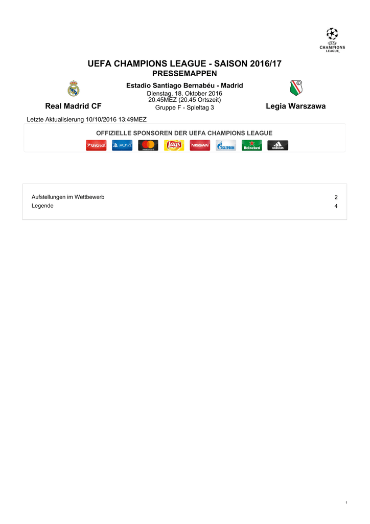 UEFA CHAMPIONS LEAGUE - SAISON 2016/17 PRESSEMAPPEN Estadio Santiago Bernabéu - Madrid Real Madrid CF Dienstag, 18. Oktober 2016 20.45MEZ (20.45 Ortszeit) Gruppe F - Spieltag 3 Legia Warszawa Letzte Aktualisierung 10/10/2016 13:49MEZ OFFIZIELLE SPONSOREN DER UEFA CHAMPIONS LEAGUE Aufstellungen im Wettbewerb 2 Legende 4 1 Real Madrid CF - Legia Warszawa Dienstag 18 Oktober 2016 - 20.45CET (20.45 Ortszeit) Pressemappe Estadio Santiago Bernabéu, Madrid Aufstellungen im Wettbewerb Real Madrid CF UEFA-Superpokal - Finale Spieltag 1 (09/08/2016) Real Madrid CF 3-2 Sevilla FC Tore: 1-0 Asensio 21, 1-1 Vázquez 41, 1-2 Konoplyanka 72 (E) , 2-2 Ramos 90+3, 3-2 Carvajal 119 Verl. Real Madrid CF: Casilla, Carvajal, Ramos, Varane, Marcelo, Casemiro, Kovačić (73 James Rodríguez), Lucas Vázquez, Morata (62 Benzema), Isco (66 Modrić), Asensio UEFA Champions League - Gruppenphase Gruppe F Verein Sp. S U N ET KT Pkt. Borussia Dortmund 2 1 1 0 8 2 4 Real Madrid CF 2 1 1 0 4 3 4 Sporting Clube de Portugal 2 1 0 1 3 2 3 Legia Warszawa 2 0 0 2 0 8 0 Spieltag 1 (14/09/2016) Real Madrid CF 2-1 Sporting Clube de Portugal Tore: 0-1 Bruno César 48, 1-1 Ronaldo 89, 2-1 Morata 90+4 Real Madrid CF: Casilla, Carvajal, Ramos, Varane, Ronaldo, Kroos (77 James Rodríguez), Benzema (68 Morata), Bale (67 Lucas Vázquez), Marcelo, Casemiro, Modrić Spieltag 2 (27/09/2016) Borussia Dortmund 2-2 Real Madrid CF Tore: 0-1 Ronaldo 17, 1-1 Aubameyang 43, 1-2 Varane 68, 2-2 Schürrle 87 Real Madrid CF: Navas, Carvajal, Ramos, Varane, Ronaldo, Kroos, Benzema (88 Morata), James Rodríguez (69 Kovačić), Bale, Modrić, Danilo Spieltag 3 (18/10/2016) Real Madrid CF-Legia Warszawa Spieltag 4 (02/11/2016) Legia Warszawa-Real Madrid CF Spieltag 5 (22/11/2016) Sporting Clube de Portugal-Real Madrid CF Spieltag 6 (07/12/2016) Real Madrid CF-Borussia Dortmund Legia Warszawa UEFA Champions League - Zweite Qualifikationsrunde (12/07/2016) HŠK Zrinjski 1-1 Legia Warszawa Tore: 0-1 Nikolić 49, 1-1 Katanec 57 Legia Warszawa: Malarz (46 Cierzniak), Jodłowiec, Lewczuk, Guilherme, Duda (60 Alexandrov), Nikolić (76 Prijovic), Hloušek, Kucharczyk, Rzeźniczak, Broź, Moulin (19/07/2016) Legia Warszawa 2-0 HŠK Zrinjski (ges: 3-1) Tore: 1-0 Nikolić 28 (E) , 2-0 Nikolić 62 Legia Warszawa: Malarz, Pazdan, Jodłowiec, Lewczuk, Guilherme (15 Hämäläinen), Nikolić (75 Kopczyński), Hloušek, Kucharczyk (84 Brzyski), Broź, Moulin, Alexandrov 2 Real Madrid CF - Legia Warszawa Pressemappe Dienstag 18 Oktober 2016 - 20.45CET (20.45 Ortszeit) Estadio Santiago Bernabéu, Madrid Dritte Qualifikationsrunde (27/07/2016) FK AS Trenčín 0-1 Legia Warszawa Tore: 0-1 Nikolić 69 Legia Warszawa: Malarz, Pazdan, Jodłowiec (85 Hämäläinen), Lewczuk, Nikolić (75 Prijovic), Kopczyński, Brzyski, Kucharczyk, Bereszyński, Moulin, Alexandrov (89 Broź) (03/08/2016) Legia Warszawa 0-0 FK AS Trenčín (ges: 1-0) Legia Warszawa: Malarz, Pazdan, Jodłowiec, Lewczuk, Langil (69 Alexandrov), Nikolić (78 Prijovic), Hloušek, Kopczyński, Kucharczyk, Bereszyński (56 Broź), Moulin Play-offs (17/08/2016) Dundalk FC 0-2 Legia Warszawa Tore: 0-1 Nikolić 56 (E) , 0-2 Prijovic 90+4 Legia Warszawa: Malarz, Pazdan, Jodłowiec, Lewczuk, Langil (88 Alexandrov), Odjidja (76 Kopczyński), Nikolić (83 Prijovic), Hloušek, Kucharczyk, Broź, Moulin (23/08/2016) Legia Warszawa 1-1 Dundalk FC (ges: 3-1) Tore: 0-1 Benson 19, 1-1 Kucharczyk 90+2 Legia Warszawa: Malarz, Pazdan, Jodłowiec, Lewczuk, Langil (65 Guilherme), Odjidja, Nikolić (71 Bereszyński), Hloušek, Kucharczyk, Broź, Moulin (93 Prijovic) Gruppenphase Spieltag 1 (14/09/2016) Legia Warszawa 0-6 Borussia Dortmund Tore: 0-1 Götze 7, 0-2 Papastathopoulos 15, 0-3 Bartra 17, 0-4 Raphaël Guerreiro 51, 0-5 Castro 76, 0-6 Aubameyang 87 Legia Warszawa: Malarz, Jodłowiec, Czerwiński, Dąbrowski, Guilherme, Langil, Odjidja, Kazaishvili (66 Alexandrov), Bereszyński, Moulin (76 Radović), Prijovic (63 Nikolić) Spieltag 2 (27/09/2016) Sporting Clube de Portugal 2-0 Legia Warszawa Tore: 1-0 Ruiz 28, 2-0 Dost 37 Legia Warszawa: Malarz, Jodłowiec, Czerwiński, Guilherme, Langil (46 Alexandrov), Nikolić (60 Odjidja), Hloušek, Bereszyński, Rzeźniczak, Radović, Moulin (86 Kopczyński) Spieltag 3 (18/10/2016) Real Madrid CF-Legia Warszawa Spieltag 4 (02/11/2016) Legia Warszawa-Real Madrid CF Spieltag 5 (22/11/2016) Borussia Dortmund-Legia Warszawa Spieltag 6 (07/12/2016) Legia Warszawa-Sporting Clube de Portugal 3 Real Madrid CF - Legia Warszawa Dienstag 18 Oktober 2016 - 20.45CET (20.45 Ortszeit) Pressemappe Estadio Santiago Bernabéu, Madrid Legende GESAMT-STATISTIK Die Gesamt-Statistik der Vereine, die an einem UEFA-Vereinswettbewerb teilnehmen. UEFA-Vereinswettbewerbe: Dies sind die offiziellen Statistiken, die als offizielle Bilanzen in den einzelnen UEFAWettbewerben - im Pokal der europäischen Meistervereine, in der UEFA Champions League, in der UEFA Europa League, im Europapokal der Pokalsieger, im UEFA-Superpokal, dem UEFA Intertoto Cup und dem Europa/Südamerika-Pokal - gelten. Der Messestädte-Pokal sowie der Superpokal 1972 werden nicht in der Statistik erfasst, da beide kein UEFA-Wettbewerb waren. Die FIFA-Klubweltmeisterschaft ist nicht eingeschlossen. Unparteiische UCL: Alle seit der Saison 1992/93 in der UEFA Champions League geleiteten Spiele, von der Gruppenphase bis zum Finale. Begegnungen, bei denen der Schiedsrichter als vierter Offizieller im Einsatz war, sind hier nicht aufgeführt. Dies sind die offiziellen Statistiken, die als offizielle Bilanzen in diesem Wettbewerb gelten. UEFA: Alle in einem UEFA-Vereinswettbewerb geleiteten Spiele, inklusive den Qualifikationsspielen. Begegnungen, bei denen der Schiedsrichter als vierter Offizieller im Einsatz war, sind hier nicht aufgeführt. Dies sind die offiziellen Statistiken, die als offizielle Bilanzen in diesem Wettbewerb gelten. Wettbewerbe Klubwettbewerbe Nationalmannschaftswettbewerbe UCL: UEFA Champions League ECCC: Pokal der europäischen 