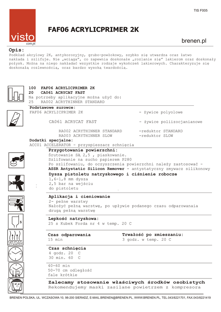 TIS F005 FAF06 ACRYLICPRIMER 2K brenen.pl Opis: Podkład akrylowy 2K, antykorozyjny, grubo-powłokowy, szybko się utwardza oraz łatwo nakłada i szlifuje. Nie „wciąga”, co zapewnia doskonałe „rozlanie się” lakierom oraz doskonały połysk. Można na niego nakładać wszystkie rodzaje wykończeń lakierowych. Charakteryzuje się doskonałą rozlewnością, oraz bardzo wysoką twardością. 100 FAF06 ACRYLICPRIMER 2K 20 CA061 ACRYCAT FAST Na potrzeby aplikacyjne można użyć do: 25 RA002 ACRYTHINNER STANDARD Podstawowe surowce: FAF06 ACRYLICPRIMER 2K - żywice polyolowe CA061 ACRYCAT FAST - żywice poliizocjanianowe RA002 ACRYTHINNER STANDARD RA003 ACRYTHINNER SLOW Dodatki specjalne: ACC01 ACCELERATOR - przyspieszacz schnięcia -reduktor STANDARD -reduktor SLOW Przygotowanie powierzchni: Śrutowanie SĄ 2,5 , piaskowanie. Szlifowanie na sucho papierem P280 Po szlifowaniu, do oczyszczenia powierzchni należy zastosować ASSR Antystatic Silicon Remover - antystatyczny zmywacz silikonowy Dysza pistoletu natryskowego i ciśnienie robocze o o 1,6-1,8 mm dysza 2,5 bar na wejściu do pistoletu O Aplikacja i cieniowanie 2- pełne warstwy Nałożyć pełną warstwę, po upływie podanego czasu odparowanaia drugą pełną warstwę O Lepkość natryskowa: 25 s Kubek Forda nr 4 w temp. 20 C Czas odparowania Trwałość po zmieszaniu: 15 min 3 godz. w temp. 20 C Czas schnięcia 4 godz. 20 30 min. 60 C C 40-60 min 50-70 cm odległość fale krótkie Zalecamy stosowanie właściwych środków osobistych Rekomendujemy maski zasilane powietrzem z kompresora BRENEN POLSKA, UL. WCZASOWA 10, 98-200 SIERADZ, [email protected], WWW.BRENEN.PL, TEL.043/8221701, FAX.043/8221419 TIS F005 FAF06 ACRYLICPRIMER 2K brenen.pl Dysze pistoletów natryskowych i ciśnienia: Wielkość dyszy 1,6 - 1,8 mm Konwencjonalny DeVilbiss, Sata Trans-Tech grawitacyjny 1,6 - 1,8 mm DeVilbiss, Sata Trans-Tech ssący 1,8 - 2,0 mm Natrysk hydrodynamiczny Airmix lub Airless 0,28 mm Ciśnienie robocze 3,5-4 bar na wejściu do pistoletu 2,5 bar na wejściu do pistoletu 2,5 bar na wejściu do pistoletu 120-140 bar na wejściu do pistoletu Grubość powłoki: Według rekomendowanej aplikacji - 80-120 um Suszenie: O 20 C Czas odparowania Pyłosuchość 60 min O 60 C Promiennik IR (fale krótkie) odległość 50-70 cm 5-8 min 5-8 min 10 min 2-3 min Możliwość 30 min 8-10 min 8 godz manipulacji Uwaga: po suszeniu w temperaturze 60 C i promiennikiem IR należy wystudzić objekt do temperatury otoczenia przed przystąpieniem do dalszych czynności technologicznych. Czasy suszenia podane dla rekomendowanej aplikacji i zalecanej temperatury objektu. Temperatura objektu podczas suszenia nie może przekroczyć 100 C . O O Polerowanie: Nie polerujemy Wydajność: Praktyczne zużycie materiału zależy od wielu czynników, między innymi: kształt obiektu, chropowatość podłoża, metody nakładania, warunki pracy oraz przede wszystkim grubości powłoki itp.. Czyszczenie sprzętu: Rozcieńczalniki do mycia pistoletów, rozcieńczalnik nitrocelulozowy. Rekomendujemy rozcieńczalnik do myjek i mycia sprzętu lakierniczego RC001 CLEANSOL BRENEN POLSKA, UL. WCZASOWA 10, 98-200 SIERADZ, [email protected], WWW.BRENEN.PL, TEL.043/8221701, FAX.043/8221419 TIS F005 FAF06 ACRYLICPRIMER 2K brenen.pl Lotne Związki Organiczne (VOC): Lakier spełnia wymagania Dyrektywy UE 2004/42/CE z 21 kwietnia 2004 roku, wg której limit wynosi 540 g/l VOC z mieszanki gotowej do użycia. Zawartość VOC dla tego produktu gotowego do użycia wynosi maksymalnie 420 g/l. Przechowywanie: Przechowuj produkt szczelnie zamknięty. Unikaj dużych różnic temperatur. Temperatura przechowywania 15-20 C. Okres magazynowania 12 miesięcy. O Przepisy BHP: Wyłącznie do profesjonalnego użytku. Sprawdź etykietę produktu. Użytkownik tego produktu jest zobowiązany do przestrzegania ustawowo obowiązujących w danym kraju przepisów BHP i postępowania z odpadami. O Informacje i sugestie zawarte w tej instrukcji wynikają z naszego doświadczenia i przeprowadzonych badań. Zapewniamy, że nasze produkty posiadają najwyższą jakość. Nie bierzemy odpowiedzialności za wpływ na rezultat końcowy czynników będących poza naszą kontrolą. Klient ponosi odpowiedzialność za właściwy dobór produktów do określonej sytuacji i warunków jakimi dysponuje. Zapoznaj się z Kartą Charakterystyki FAF06 BRENEN POLSKA, UL. WCZASOWA 10, 98-200 SIERADZ, [email protected], WWW.BRENEN.PL, TEL.043/8221701, FAX.043/8221419