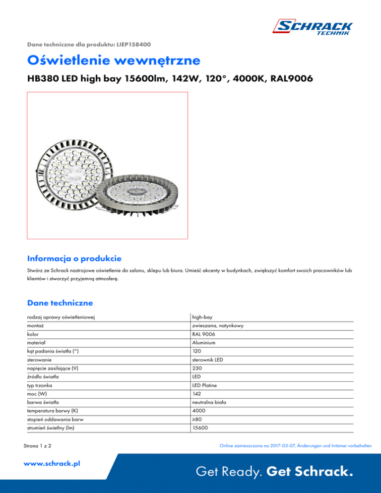 Dane techniczne dla produktu: LIEP158400 Oświetlenie wewnętrzne HB380 LED high bay 15600lm, 142W, 120°, 4000K, RAL9006 Informacja o produkcie Stwórz ze Schrack nastrojowe oświetlenie do salonu, sklepu lub biura. Umieść akcenty w budynkach, zwiększyć komfort swoich pracowników lub klientów i stworzyć przyjemną atmosferę. Dane techniczne rodzaj oprawy oświetleniowej high-bay montaż zwieszana, natynkowy kolor RAL 9006 materiał Aluminium kąt padania światła (°) 120 sterowanie sterownik LED napięcie zasilające (V) 230 źródło światła LED typ trzonka LED Platine moc (W) 142 barwa światła neutralna biała temperatura barwy (K) 4000 stopień oddawania barw ≥80 strumień świetlny (lm) 15600 Strona 1 z 2 www.schrack.pl Online zamieszczone na 2017-03-07, Änderungen und Irrtümer vorbehalten Get Ready. Get Schrack. Dane techniczne - kontynuacja ilość lamp 1 ściemniany tak klasa ochrony I stopień szczelności IP65 Klasy efektywności energetycznej A zawiera żródła światła tak ØxW mm 380x114 Lista produktów OPIS Dostępny HB380 LED high bay 15600lm, 142W, 120°, 4000K, RAL9006 STORE Nr katalogowy LIEP158400 Dodatkowe akcesotia Uchwyt do montażu sufitowego do ARKTUR STORE W magazynie, gotowy do dostawy w dniu zamówienia Strona 2 z 2 www.schrack.pl LIHBMB380 W magazynie, czas realizacji 24 h w Online zamieszczone na 2017-03-07, Änderungen und Irrtümer vorbehalten Get Ready. Get Schrack.