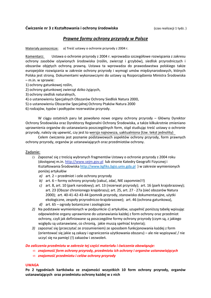 Ćwiczenie nr 3 z Kształtowania i ochrony środowiska (czas realizacji 1 tydz. ) Prawne formy ochrony przyrody w Polsce Materiały pomocnicze: a) Treść ustawy o ochronie przyrody z 2004 r. Komentarz: Ustawa o ochronie przyrody z 2004 r. wprowadza szczegółowe rozwiązania z zakresu ochrony zasobów ożywionych środowiska (roślin, zwierząt i grzybów), siedlisk przyrodniczych i obszarów objętych ochroną prawną. Ustawa ta wprowadza do prawodawstwa polskiego także europejskie rozwiązania w zakresie ochrony przyrody i wymogi umów międzynarodowych, których Polska jest stroną. Dokumentami wykonawczymi do ustawy są Rozporządzenia Ministra Środowiska – m.in. w sprawie: 1) ochrony gatunkowej roślin, 2) ochrony gatunkowej zwierząt dziko żyjących, 3) ochrony siedlisk naturalnych, 4) o ustanowieniu Specjalnych Obszarów Ochrony Siedlisk Natura 2000, 5) o ustanowieniu Obszarów Specjalnej Ochrony Ptaków Natura 2000 6) rodzajów, typów i podtypów rezerwatów przyrody. W ciągu ostatnich paru lat powołano nowe organy ochrony przyrody – Główny Dyrektor Ochrony Środowiska oraz Dyrektorzy Regionalni Ochrony Środowiska, a także kilkukrotnie zmieniano uprawnienia organów do ustanawiania poszczególnych form, stąd studiując treść ustawy o ochronie przyrody, należy się upewnić, czy jest to wersja najnowsza, uaktualniona (tzw. tekst jednolity) Celem ćwiczenia jest poznanie podstawowych aspektów ochrony przyrody, form prawnych ochrony przyrody, organów je ustanawiających oraz przedmiotów ochrony. Zadanie: 1) Zapoznać się z treścią wybranych fragmentów Ustawy o ochronie przyrody z 2004 roku (dostępnej m.in. http://www.sejm.gov.pl lub stronie Katedry Geografii Fizycznej i Kształtowania Środowiska http://www.kgfiks.bgio.univ.gda.pl ) w zakresie wymienionych poniżej artykułów a) art. 2 – przedmiot i cele ochrony przyrody b) art. 6 – formy ochrony przyrody (zakuć, zdać, NIE zapomnieć!!) c) art. 8, art. 10 (park narodowy); art. 13 (rezerwat przyrody); art. 16 (park krajobrazowy); art. 23 (Obszar chronionego krajobrazu); art. 25, art. 27 - 27a (sieć obszarów Natura 2000); art. 40-41-42-43-44 (pomnik przyrody, stanowisko dokumentacyjne, użytki ekologiczne, zespoły przyrodniczo-krajobrazowe); art. 46 (ochrona gatunkowa), d) art. 65 – ogrody botaniczne i zoologiczne 2) Na podstawie wymienionych w podpunkcie c) artykułów, uzupełnić poniższą tabelę wpisując odpowiednie organy uprawnione do ustanawiania każdej z form ochrony oraz przedmiot ochrony, czyli jak definiowane są poszczególne formy ochrony przyrody (czym są, z jakiego względu są ustanawiane, co chronią, jakie muszą spełniać kryteria); 3) zapoznać się (przeczytać ze zrozumieniem) ze sposobem funkcjonowania każdej z form (orientować się jakie są zakazy i ograniczenia użytkowania obszaru) – ale nie wypisywać / nie uczyć się na pamięć (!) zakazów i zezwoleń. Do zaliczenia przedmiotu w zakresie tej części materiału i ćwiczenia obowiązuje: • znajomość form ochrony przyrody, przedmiotu ich ochrony i organów ustanawiających • znajomość przedmiotu i celów ochrony przyrody UWAGA Po 2 tygodniach kartkówka ze znajomości wszystkich 10 form ochrony przyrody, organów ustanawiających oraz przedmiotu ochrony każdej w z nich Lp Forma ochrony przyrody 1 Park Narodowy 2 Rezerwat przyrody 3 Park Krajobrazowy 4 Obszar Chronionego Krajobrazu 5 Obszary Natura2000 6 Pomnik przyrody 7 Użytek ekologiczny 8 Stanowisko dokumentacyjne 9 Zespół przyrodniczo-krajobrazowy 10 Ochrona gatunkowa Organ ustanawiający Co jest przedmiotem ochrony; z jakiego względu się chroni