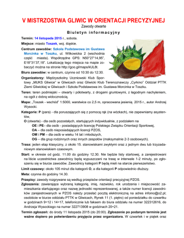 V MISTRZOSTWA GLIWIC W ORIENTACJI PRECYZYJNEJ Zawody otwarte Biuletyn info rmacyjny Termin: 14 listopada 2015 r., sobota. Miejsce: miasto Toszek, woj. śląskie. Centrum zawodów: Szkoła Podstawowa im Gustawa Morcinka w Toszku, ul. Wilkowicka 2 (wschodnia część miasta). Współrzędne GPS: N50°27’14,95”, E18°31’37,18”. Lokalizację tego miejsca na mapie zobaczyć można na stronie http://goo.gl/maps/kUL8t. Biuro zawodów: w centrum, czynne od 10:30 do 12:30. Organizatorzy: Międzyszkolny Uczniowski Klub Sportowy „MUKS Gliwice” w Gliwicach oraz Gliwicki Klub Terenoznawczy „Cyrkino” Oddział PTTK Ziemi Gliwickiej w Gliwicach i Szkoła Podstawowa im. Gustawa Morcinka w Toszku. Teren: teren podmiejski – otwarty i półotwarty, z drogami gruntowymi, z łagodnym nachyleniem, na ogół z dobrą widocznością. Mapa: „Toszek - wschód” 1:5000, warstwice co 2,5 m, opracowana jesienią 2015 r., autor Andrzej Wysocki. Kategorie: P (para) - dla poruszających się z pomocą rąk (na wózkach), nie zapewniamy asystentów, O (otwarte) - dla osób pozostałych, startujących indywidualnie, z podziałem na OE i PE– dla osób - posiadających licencję Polskiego Związku Orientacji Sportowej, OA – dla osób nieposiadających licencji PZOS, OM i PM – dla osób w wieku 14 lat i młodszych, OG – dla grup rodzinnych oraz innych zespołów (maksymalnie 2-3 osobowych). Trasa: jeden etap klasyczny, z około 15. stanowiskami zwykłymi oraz z jednym dwu lub trzyzadaniowym stanowiskiem czasowym. Start: w okresie od godz. 11.00 do godziny 12.30. Nie będzie listy startowej, a zarejestrowani na liście uczestnictwa zawodnicy będą wypuszczani na trasę w interwale 1-2 minuty, po zgłoszeniu się w biurze zawodów. Zawodnicy kategorii P będą mieli na starcie pierwszeństwo. Limit czasowy: około 105 minut dla kategorii O, a dla kategorii P odpowiednio dłuższy. Meta: czynna do godziny 14.30. Przepisy: zawody rozgrywane są według przepisów orientacji precyzyjnej PZOS. Zgłoszenia: zawierające wybraną kategorię, imię, nazwisko, rok urodzenia i miejscowość zamieszkania startującego oraz nazwę jednostki reprezentowanej, a także numer licencji zawodników zarejestrowanych w PZOS należy przesłać pocztą elektroniczną na adres [email protected]; osobiście w biurze oddziału PTTK w Gliwicach, Rynek 11 (1. piętro) od poniedziałku do czwartku w godzinach 9÷12 i 14÷17, telefonicznie lub faksem do biura oddziału na numer 322312616, do Andrzeja Wysockiego na numer 322713908 w godzinach 20÷21. Termin zgłoszeń: do środy 11 listopada 2015 (do 20:00). Zgłoszenie po podanym terminie jest ważne dopiero po potwierdzeniu przyjęcia przez organizatora. W czwartek i w piątek oraz w dniu imprezy do godziny 11.00 możemy przyjąć zgłoszenia tylko pojedynczych osób, w ramach drobnej rezerwy materiałów startowych. Opłaty startowe (od osoby albo grupy w kategorii OG): kategoria P - 5 zł, kategorie pozostałe 10 zł. Opłaty uiszcza się bezpośrednio w biurze Oddziału PTTK (Gliwice, Rynek 11, 1 piętro, godz. 9÷12 i 14÷17, od poniedziałku do czwartku) lub na konto „PTTK – Oddział Ziemi Gliwickiej (koniecznie z podaniem nazwy imprezy) – nr konta 91 1240 4272 1111 0000 4839 4990 albo w dniu zawodów w biurze zawodów. Uczestnicy równolegle odbywających się XLVI Jesiennych Marszów na Orientację korzystają ze zniżki 60% w opłacie. Odległości: parkowanie samochodów na ulicach w rejonie centrum zawodów; start – w rejonie centrum zawodów, a meta – do około 1 km od centrum. Dojazd: do Toszka dojechać można pojazdami własnymi a także pociągami i autobusami MZKP i KZK GOP. Wybrane połączenia kolejowe i autobusowe (‘ - minuty czasu jazdy): - pociągami - z Gliwic (22’) 10.33, z Opola (47-51’) 9.11, z Pyskowic (9’) 10.46, ze Strzelec Op. (17’) 9.43, - autobusem z Pyskowic (Plac Wyszyńskiego) – linia 207 (20’) 9.33 i 11.33, - autobusowe połączenia do autobusów z Pyskowic – z Bytomia (z dworca autobusowego) linią 20 (65’) 8.10 i 10.10 oraz z Gliwic (Plac Piastów) linią 677 (24’) 8,57 i 10,57. Szczegółowe rozkłady jazd oraz mapy ulic i przystanków są na stronach – dla autobusów http://rozklady.kzkgop.pl i http://www.mzkp.pl, dla kolei http://rozklad.plk-sa.pl/Tablice. Ogłoszenie ostatecznych wyników: w centrum zawodów - w kategorii P niezwłocznie po ustaleniu wyników i wypisaniu dyplomów, pozostałe kategorie o godz. 15.45. Najlepsi trzej zawodnicy i zespoły w każdej kategorii otrzymają drobne nagrody i dyplomy. WC: w centrum zawodów nie ma możliwości korzystania z bezbarierowych toalet. Tereny zakazane do penetracji: pas o szerokości 1 km, przylegający od północy do ulicy Wilkowickiej. Porada praktyczna: jesienią w dni pochmurne światło dzienne bywa słabe - zalecamy posiadanie drobnego oświetlenia do podświetlenia mapy. Osoby funkcyjne: kierownik zawodów – Agnieszka Ćmiel, zastępca kierownika i sędzia główny – Andrzej Wysocki, budowniczy tras i sędzia obliczeniowy – Zbigniew Socha. Informacja o dyscyplinie orientacja precyzyjna (orientacja ścieżkowa, orientacja dokładna, trail orienteering). Jest to bardzo spokojna, choć opracowana przez sportowców, odmiana imprez na orientację. Wymyślona dla osób niepełnosprawnych, szybko znalazła również duże uznanie i zwolenników wśród pełnosprawnych. Opis szczegółowych zasad uczestnictwa i pokonywania trasy znaleźć można było na polskiej stronie http://www.orienteering.mastela.pl/trailo, gdzie w zakładce „Wirtualny trening” znajdują się przydatne materiały a także wspaniałe przykłady do ćwiczeń przed wyjściem w teren. Przydatne informacje są też na stronie http://www.orientop.eu/trail. Zdjęcia z polskich i czeskich zawodów poszukać i zobaczyć można na stronie http://infoino.rajce.idnes.cz/ Strony internetowe: MUKS „MUKS Gliwice” - http://www.muksgliwice.cba.pl; GKT „Cyrkino” http://cyrkino.g