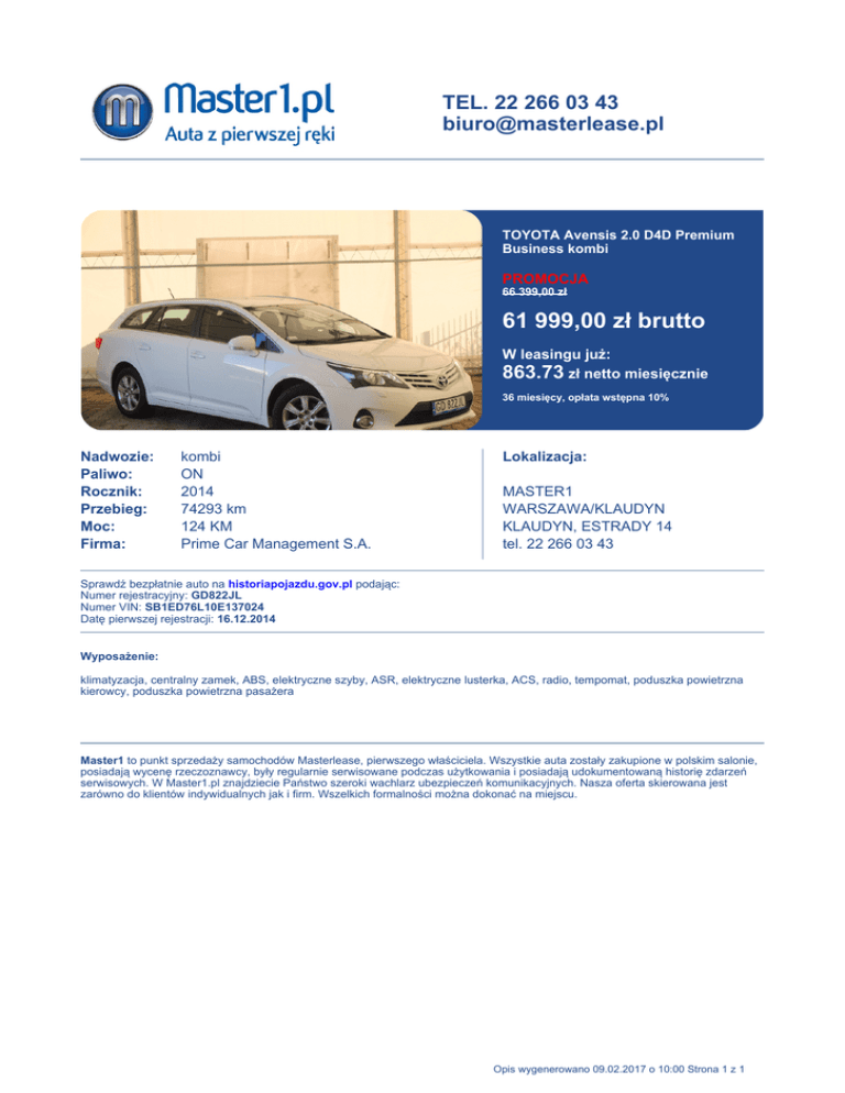 TEL. 22 266 03 43 [email protected] TOYOTA Avensis 2.0 D4D Premium Business kombi PROMOCJA 66 399,00 zł 61 999,00 zł brutto W leasingu już: 863.73 zł netto miesięcznie 36 miesięcy, opłata wstępna 10% Nadwozie: Paliwo: Rocznik: Przebieg: Moc: Firma: kombi ON 2014 74293 km 124 KM Prime Car Management S.A. Lokalizacja: MASTER1 WARSZAWA/KLAUDYN KLAUDYN, ESTRADY 14 tel. 22 266 03 43 Sprawdź bezpłatnie auto na historiapojazdu.gov.pl podając: Numer rejestracyjny: GD822JL Numer VIN: SB1ED76L10E137024 Datę pierwszej rejestracji: 16.12.2014 Wyposażenie: klimatyzacja, centralny zamek, ABS, elektryczne szyby, ASR, elektryczne lusterka, ACS, radio, tempomat, poduszka powietrzna kierowcy, poduszka powietrzna pasażera Master1 to punkt sprzedaży samochodów Masterlease, pierwszego właściciela. Wszystkie auta zostały zakupione w polskim salonie, posiadają wycenę rzeczoznawcy, były regularnie serwisowane podczas użytkowania i posiadają udokumentowaną historię zdarzeń serwisowych. W Master1.pl znajdziecie Państwo szeroki wachlarz ubezpieczeń komunikacyjnych. Nasza oferta skierowana jest zarówno do klientów indywidualnych jak i firm. Wszelkich formalności można dokonać na miejscu. Opis wygenerowano 09.02.2017 o 10:00 Strona 1 z 1