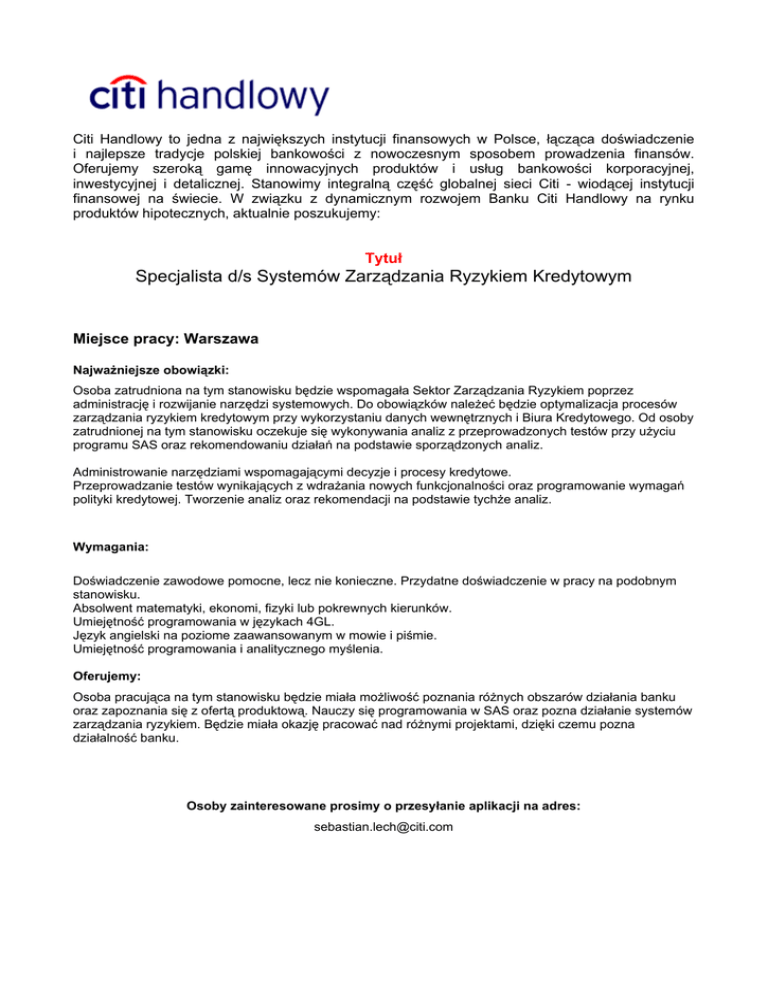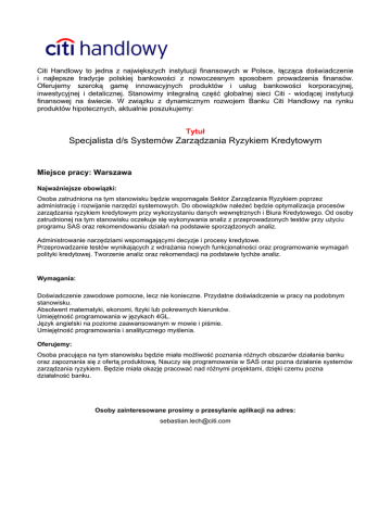 Citi Handlowy to jedna z największych instytucji finansowych w Polsce, łącząca doświadczenie i najlepsze tradycje polskiej bankowości z nowoczesnym sposobem prowadzenia finansów. Oferujemy szeroką gamę innowacyjnych produktów i usług bankowości korporacyjnej, inwestycyjnej i detalicznej. Stanowimy integralną część globalnej sieci Citi - wiodącej instytucji finansowej na świecie. W związku z dynamicznym rozwojem Banku Citi Handlowy na rynku produktów hipotecznych, aktualnie poszukujemy: Tytuł Specjalista d/s Systemów Zarządzania Ryzykiem Kredytowym Miejsce pracy: Warszawa Najważniejsze obowiązki: Osoba zatrudniona na tym stanowisku będzie wspomagała Sektor Zarządzania Ryzykiem poprzez administrację i rozwijanie narzędzi systemowych. Do obowiązków należeć będzie optymalizacja procesów zarządzania ryzykiem kredytowym przy wykorzystaniu danych wewnętrznych i Biura Kredytowego. Od osoby zatrudnionej na tym stanowisku oczekuje się wykonywania analiz z przeprowadzonych testów przy użyciu programu SAS oraz rekomendowaniu działań na podstawie sporządzonych analiz. Administrowanie narzędziami wspomagającymi decyzje i procesy kredytowe. Przeprowadzanie testów wynikających z wdrażania nowych funkcjonalności oraz programowanie wymagań polityki kredytowej. Tworzenie analiz oraz rekomendacji na podstawie tychże analiz. Wymagania: Doświadczenie zawodowe pomocne, lecz nie konieczne. Przydatne doświadczenie w pracy na podobnym stanowisku. Absolwent matematyki, ekonomi, fizyki lub pokrewnych kierunków. Umiejętność programowania w językach 4GL. Język angielski na poziome zaawansowanym w mowie i piśmie. Umiejętność programowania i analitycznego myślenia. Oferujemy: Osoba pracująca na tym stanowisku będzie miała możliwość poznania różnych obszarów działania banku oraz zapoznania się z ofertą produktową. Nauczy się programowania w SAS oraz pozna działanie systemów zarządzania ryzykiem. Będzie miała okazję pracować nad różnymi projektami, dzięki czemu pozna działalność banku. Osoby zainteresowane prosimy o przesyłanie aplikacji na adres: [email protected]