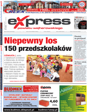 Piątek, 30 marca 2012 r. Nr 13 (245) NAKŁAD 12 000 EGZ. Niepewny los 150 przedszkolaków OŚWIATA | Jedno z największych przedszkoli w Wejherowie, do którego uczęszcza obecnie ok. 150 dzieci, może przestać istnieć dosłownie z dnia na dzień. Podczas spotkania właścicielek placówki z władzami miasta nie udało się wypracować wspólnego stanowiska. czytaj więcej na stronie 3 Drożej za przejazd KOMUNIKACJA | O 20 groszy zdrożeje jednorazowy bilet w autobusach na liniach obsługiwanych przez Miejski Zakład Komunikacji w Wejherowie. Podwyżkę – przy zdecydowanym sprzeciwie opozycji – zatwierdzili wejherowscy radni. Za bilet jednorazowy (papierowy) na przejazd autobusem komunikacji miejskiej w Wejherowie od czerwca trzeba będzie zapłacić 3 zł. Nieco tańszy będzie bilet elektroniczny – jednorazowy przejazd to wydatek 2,8 zł. Nie zmienią się natomiast ceny biletów miesięcznych. Czytaj więcej na str. 3 Wybierz szkołę dla siebie Fot. Rafał Korbut www.facebook.com/gwe24 | www.facebook.com/gwe24 | www.facebook.com/gwe24 | www.facebook.com/gwe24 |www.facebook.com/gwe24 Express Powiatu Lęborskiego tel. 533 903 900 | tel. 791 980 155 Express Powiatu Wejherowskiego | tel. 660 731 738 Express Gdyński | tel. 791 764 155 Express Gdańsk Sopot | tel. 604 414 540 Express Powiatu Kartuskiego | tel. 501 226 085 EDUKACJA | Już po raz kolejny władze powiatu wejherowskiego zorganizowały dla młodzieży „Giełdę ponadgimnazjalnej oferty edukacyjnej” w Redzie. Głównym celem przedsięwzięcia była promocja pomorskich szkół ponadgimnazjalnych wśród gimnazjalistów i rodziców. Każdy uczeń, wahający się co do wyboru przyszłej szkoły, mógł przyjść i rozwiać wszelkie swoje wątpliwości. Choć decyzja nie była łatwa, oferty były bardzo atrakcyjne. Czytaj więcej na str. 5 www WYDARZENIA 2 [email protected] JAKUB W. PO PRZERWIE Nowa Kwiatowa FELIETON | Od pewnego czasu zapanowała w naszym pięknym kraju moda na nowe „stare” ulice. Właśnie w Gdańsku budowana jest Nowa Słowackiego. Dopiero, co wybudowano Nową Łódzką, też w stolicy województwa, ale zmarł był prezio Havel i został patronem tejże ulicy. Wejherowski prezio też zapragnął podążyć za modą. Zaplanował, bowiem Nową Kwiatową. Starą Kwiatową wszyscy znają. Gdzie miałaby powstać ta druga? Otóż Matematyk wice prezio namalował ją (rękami projektantów) równolegle do starej wzdłuż torów kolejowych. Ta nowa ulica miałaby łączyć się tunelem z rondem „Solidarności” na drodze krajowej nr 6. I do tego momentu to piękna bajka. Przecież brakuje nam w Wejherowie bezkolizyjnych przejazdów jak deszczu w czasie suszy. Tylko, dlaczego tunel na końcu Nowej Kwiatowej a nie gdzie indziej? Na to pytanie prezio ma odpowiedź wprost genialną. Posłuchajcie! Przy dworcach PKP i PKS należy wybudować olbrzymie rondo, które wraz z ulicami Dworcową, 10 Lutego i Nową Kwiatową oraz z tunelem pod torami stanowić będzie węzeł metropolitalny. Tłumacząc na język polski oznacza to ni mniej ni więcej, że niemal cały ruch z obu stron Wejherowa docelowo ma koncentrować się w okolicach wspomnianych dworców. Wyobrażacie sobie te tysiące aut dziennie na wspomnianych wyżej ulicach? Już dziś nie można tam spokojnie jeździć ani chodzić. Dzisiejsze korki na ulicy Sobieskiego będą wspominane z rozrzewnieniem. Przecież jest rzeczą oczywistą, że gdyby taki tunel w tym miejscu powstał to każdy kierowca będzie dążył, aby nim szybko przejechać z północy na południe lub na odwrót. Co się jednak stało, że poszły w niepamięć inne bezkolizyjne rozwiązania drogowe? Co z Węzłem „Zryw? Dlaczego nie budujemy Węzła Nanice? A może wyjąć z szuflady projekty Węzła „Działki”? Dodajmy do tego nieśmiałe pomysły tunelu lub wiaduktu w okolicach ulic Sienkiewicza i Św. Jana. W ten sposób mamy, co najmniej 5 koncepcji a nic nie budujemy. Gołębie, które bez przerwy brudzą moją głowę gruchają mi jednak do ucha, co legło u podstaw tej Nowej Kwiatowej? Po pierwsze przy obecnej ulicy Kwiatowej mieszka stary urzędnik i nie mógłby się wysypiać przy wzmożonym ruchu. Po drugie magistrat nie lubi szefostwa firmy PKS i gotów jest robić im na złość w każdy możliwy sposób. Po trzecie konieczny jest szybki dojazd prezia z domu do…Filharmonii. Po czwarte obecnie budowany jest na byłym placu manewrowym w/w firmy autobusowej niewielki „markecik” znanego potentata handlowego. Ma tam też być bank. I tu wracamy znów do tego samego starego urzędnika. Otóż w jego domu przy starej Kwiatowej jest już bank i po co mu konkurencja? Miasto jest gotowe zapłacić olbrzymie odszkodowanie, aby tylko nie budować „markeciku”. Po to wymyślono Nową Kwiatową. Poza tym, gdy ktoś ważny przestanie już chodzić po ziemskim padole to tej Nowej Kwiatowej nada się jego imię. Proste? Jakub W. po przerwie WASZYM ZDANIEM Kontrowersyjna podwyżka cen biletów Codziennie na portalu GWE24.pl pojawiają się dziesiątki Waszych komentarzy. Ostatnio często komentowana była uchwała, przegłosowana przez radnych z klubu „Wolę Wejherowo”, o podniesieniu cen biletów autobusowych. Oto kilka wybranych opinii: Konieczna jest nowelizacja ustawy: wyjęcie autobusów miejskich spod e-myta.wyborca Być może opozycja lepiej zarządzałaby nie tylko miastem, ale i naszymi pieniędzmi. No, ale są tacy, którzy wolą rozbuchane fanaberie prezydenta, typu Filharmonia, alfabet kaszubski itp., nazywając to wizjonerstwem. Dla wielu to marnowanie kasy w czasie kryzysu, która mogłaby zostać wydana korzystniej, efektywniej - w sposób przemyślany i uwzględniający nie tylko bieżące potrzeby mieszkańców, ale i długofalową strategię rozwoju miasta. do adie Więcej komentarzy przeczytaj na GWE24.pl. (oprac. raf) Wielkopostne zamyślenia w kolegiacie W gościnnej dla artystów wejherowskiej Kolegiacie wystąpił chór Camerata Musicale po
