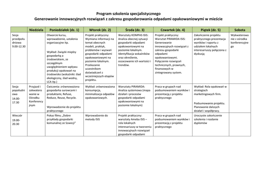 Program szkolenia specjalistycznego Generowanie innowacyjnych rozwiązań z zakresu gospodarowania odpadami opakowaniowymi w mieście Niedziela Sesja przedpołu dniowa 9.00-12.30 Poniedziałek (dz. 1) Otwarcie kursu, wprowadzenie, ustalenia organizacyjne itp. Wykład: Związki między gospodarką a środowiskiem, ze szczególnym uwzględnieniem wpływu produkcji opakowań na środowisko (wskaźniki: ślad ekologiczny, ślad wodny, LCA itp.) Sesja popołudni owa 14.0017.30 Wieczór 19.0020.30 Przyjazd i zakwatero wanie w Ośrodku Konferency jnym Ćwiczenia: zrównoważona gospodarka surowcami i produktami, Refuse, Reduce, Reuse, Recycle. Wtorek (dz. 2) Środa (dz. 3) Projekt praktyczny: Wymiana informacji na temat obecnych modeli, praktyk, problemów i wyzwań gospodarki odpadami opakowaniowymi na poziomie lokalnym. Przekazanie uczestnikom doświadczeń z wcześniejszych etapów projektu. Warsztaty KOMPAS ISIS: Analiza obecnej sytuacji gospodarki odpadami opakowaniowymi na poziomie lokalnym. Identyfikacja wskaźników oraz określenie, oszacowanie ich wartości i trendów. Wykład: zrównoważona konsumpcja, minimalizacja odpadów opakowaniowych. Wprowadzenie do projektu praktycznego Pokaz filmu „Dobre przykłady gospodarki komunalnej ze Szwecji” Wprowadzenie do metody ISIS Czwartek (dz. 4) Piątek (dz. 5) Sobota Projekt praktyczny: Warsztat PIRAMIDA ISIS: Generowanie innowacyjnych rozwiązań z zakresu gospodarki odpadami opakowaniowymi. Połączenie rozwiązań technicznych, prawnych, finansowych w zintegrowany system. Zakończenie projektu praktycznego prezentacja wyników i raportu z udziałem lokalnych interesariuszy połączona z dyskusją Wykwaterowa nie z ośrodka konferencyjne go Warsztaty PIRAMIDA: Analiza systemowa (mapa działań i procesów gospodarki odpadami opakowaniowymi na poziomie lokalnym) Praca w grupach nad podsumowaniem wyników i prezentacją z projektu praktycznego Wykład: Rola opakowań w strategiach marketingowych firm. Projekt praktyczny: warsztaty Ameba ISIS – rola lokalnych interesariuszy w tworzeniu innowacyjnych rozwiązań gospodarki odpadami Praca w grupach nad podsumowaniem wyników i prezentacją z projektu praktycznego Podsumowanie projektu. Planowanie dalszych działań i współpracy. Uroczyste zakończenie szkolenia i rozdanie dyplomów Projekt praktyczny „Generowanie innowacyjnych rozwiązań z zakresu gospodarowania odpadami opakowaniowymi w mieście” realizowany we współpracy z lokalnymi interesariuszami. Uczestnicy wykorzystują wiedzę uzyskaną w trakcie szkolenia e-learningowego oraz pierwszego dnia kursu w praktyce. Problem poznają w bezpośrednich rozmowach z interesariuszami, następnie biorą udział w kompleksowej symulacji z wykorzystaniem narzędzi Kompas, Piramida i Ameba zrównoważonego rozwoju, w celu wypracowania możliwych rozwiązań głównych wyzwań gospodarki odpadami opakowaniowymi w mieście. Na kolejnych etapach podsumowują efekty spotkań, analizując główne wyzwania, następnie dobierają wskaźniki, które służą monitorowaniu zachodzących zmian; dokonują analizy systemowej problemu, tak by podjąć decyzję w jakich punktach systemu najefektywniej będzie wprowadzić zmiany; wreszcie wypracowują propozycje najlepszych rozwiązań, które następnie przedstawiają interesariuszom. Główne efekty szkolenia: – – – – Zwiększenie wiedzy uczestników w zakresie głównych wyzwań gospodarki odpadami opakowaniowymi w polskich miastach; Zwiększenie wśród uczestników zrozumienia różnorodnych interesów związanych z gospodarowaniem odpadami opakowaniowymi; Poznanie przez uczestników narzędzi pracy z różnorodnymi interesariuszami i wypracowywania rozwiązań złożonego problemu gospodarki odpadami opakowaniowymi w mieście; Zestaw innowacyjnych pomysłów rozwiązań problemów gospodarki odpadami opakowaniowymi dostosowanych do lokalnych warunków w mieście realizacji projektu. Prowadzący szkolenie: Nadzór merytoryczny nad programem i jego realizacją (dr Jakub Kronenberg i dr inż. Tomasz Bergier) Zespół trenerski: Karolina Maliszewska (licencjonowana trenerka ISIS, certyfikowana trenerka umiejętności miękkich, psycholożka środowiskowa) Dr Jakub Kronenberg (ekonomista ekologiczny z Uniwersytetu Łódzkiego, specjalista społecznej odpowiedzialności biznesu, licencjonowany trener ISIS) Dr inż. Tomasz Bergier (inżynier środowiska z Akademii Górniczo-Hutniczej, specjalizujący się w tematyce gospodarki wodnej, licencjonowany trener ISIS) Do przeprowadzenia niektórych wykładów zostaną zaproszeni wykładowcy gościnni – eksperci danego tematu.