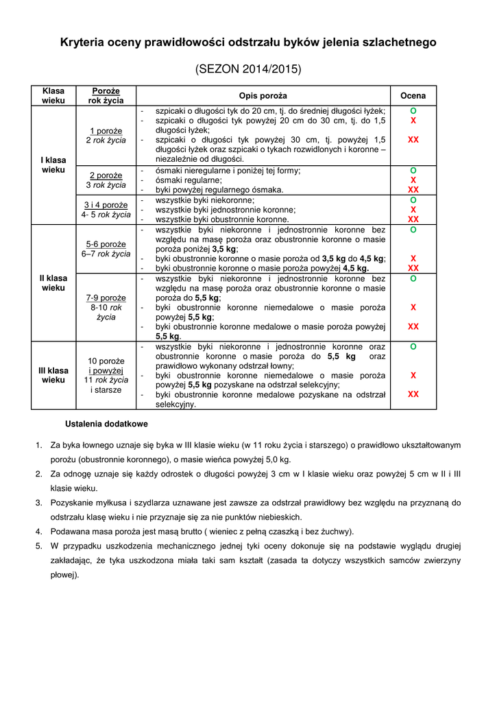 Kryteria oceny prawidłowości odstrzału byków jelenia szlachetnego (SEZON 2014/2015) Klasa wieku Poroże rok życia Opis poroża - 1 poroże 2 rok życia I klasa wieku 2 poroże 3 rok życia 3 i 4 poroże 4- 5 rok życia 5-6 poroże 6–7 rok życia II klasa wieku 7-9 poroże 8-10 rok życia - - III klasa wieku 10 poroże i powyżej 11 rok życia i starsze - szpicaki o długości tyk do 20 cm, tj. do średniej długości łyżek; szpicaki o długości tyk powyżej 20 cm do 30 cm, tj. do 1,5 długości łyżek; szpicaki o długości tyk powyżej 30 cm, tj. powyżej 1,5 długości łyżek oraz szpicaki o tykach rozwidlonych i koronne – niezależnie od długości. ósmaki nieregularne i poniżej tej formy; ósmaki regularne; byki powyżej regularnego ósmaka. wszystkie byki niekoronne; wszystkie byki jednostronnie koronne; wszystkie byki obustronnie koronne. wszystkie byki niekoronne i jednostronnie koronne bez względu na masę poroża oraz obustronnie koronne o masie poroża poniżej 3,5 kg; byki obustronnie koronne o masie poroża od 3,5 kg do 4,5 kg; byki obustronnie koronne o masie poroża powyżej 4,5 kg. wszystkie byki niekoronne i jednostronnie koronne bez względu na masę poroża oraz obustronnie koronne o masie poroża do 5,5 kg; byki obustronnie koronne niemedalowe o masie poroża powyżej 5,5 kg; byki obustronnie koronne medalowe o masie poroża powyżej 5,5 kg. wszystkie byki niekoronne i jednostronnie koronne oraz obustronnie koronne o masie poroża do 5,5 kg oraz prawidłowo wykonany odstrzał łowny; byki obustronnie koronne niemedalowe o masie poroża powyżej 5,5 kg pozyskane na odstrzał selekcyjny; byki obustronnie koronne medalowe pozyskane na odstrzał selekcyjny. Ocena O X XX O X XX O X XX O X XX O X XX O X XX Ustalenia dodatkowe 1. Za byka łownego uznaje się byka w III klasie wieku (w 11 roku życia i starszego) o prawidłowo ukształtowanym porożu (obustronnie koronnego), o masie wieńca powyżej 5,0 kg. 2. Za odnogę uznaje się każdy odrostek o długości powyżej 3 cm w I klasie wieku oraz powyżej 5 cm w II i III klasie wieku. 3. Pozyskanie myłkusa i szydlarza uznawane jest zawsze za odstrzał prawidłowy bez względu na przyznaną do odstrzału klasę wieku i nie przyznaje się za nie punktów niebieskich. 4. Podawana masa poroża jest masą brutto ( wieniec z pełną czaszką i bez żuchwy). 5. W przypadku uszkodzenia mechanicznego jednej tyki oceny dokonuje się na podstawie wyglądu drugiej zakładając, że tyka uszkodzona miała taki sam kształt (zasada ta dotyczy wszystkich samców zwierzyny płowej). Kryteria oceny prawidłowości odstrzału sarn – rogaczy (SEZON 2014/2015) Klasa wieku Poroże rok życia 1 poroże 2 rok życia I klasa wieku 2 poroże 3 rok życia Opis parostków - 3 poroże i starsze II klasa wieku 4 rok życia i starsze - - guzikarze, szpicaki, myłkusy, a także widłaki o średniej długości tyk do 10 cm widłaki o średniej długości tyk powyżej 10 cm. szóstaki szóstaki nieregularne i poniżej tej formy regularne szóstaki i powyżej tej formy o masie do 200 g regularne szóstaki i powyżej tej formy o masie większej niż 200 g nieregularne szóstaki i poniżej tej formy oraz regularne szóstaki o masie parostków poniżej 300 g oraz prawidłowo wykonany odstrzał łowny, regularne szóstaki lub powyżej tej formy o masie parostków od 300 g do 370 g regularne szóstaki lub powyżej tej formy o masie parostków powyżej 370 g Ocena O X XX O X XX O X XX Podane wyżej średnie masy parostków dla obwodów położonych w nadleśnictwach: A) Spychowo, Szczytno, Wielbark, Strzałowo – należy obniżyć o 10 % od ustalonej średniej B) Dobrocin, Srokowo, Nidzica, Kudypy, Maskulińskie - należy podwyższyć o 10 % od ustalonej średniej Ustalenia dodatkowe 1. Za rogacza łownego uznaje się regularnego szóstaka (lub powyżej tej formy), w wieku od szóstego roku życia wzwyż, o masie trofeum ponad przeciętną 2. Za selekcyjne uznaje się wszystkie myłkusy i szydlarze oraz nie przyznaje się za ich odstrzał punktów niebieskich. 3. Zaleca się oszczędzanie szpicaków o długości powyżej długości łyżek 4. Przy ocenie prawidłowości odstrzału za odnogę uznaje się w I klasie wieku odrostek o długości powyżej 1 cm, a w II klasie wieku – odrostek o długości powyżej 3 cm. 5. Wyznaczając średnia masę parostków w II klasie wieku w danym okręgu należy pamiętać, iż poza średnią masa parostków w II klasie wieku, należy ustalić również wartość graniczną przy odstrzale kwalifikowanym na dwa punkty czerwone. Wartość ta musi być większa od średniej masy parostków w II klasie (300 g), a mniejsza od minimalnej masy parostków medalowych (370 g) 6. Podawana masa parostków jest masą brutto ( parostki z czaszka bez żuchwy) 7. W przypadku uszkodzenia mechanicznego jednej tyki oceny dokonuje się na podstawie wyglądu drugiej zakładając, że tyka uszkodzona miała taki sam kształt (zasada ta dotyczy wszystkich samców zwierzyny płowej).