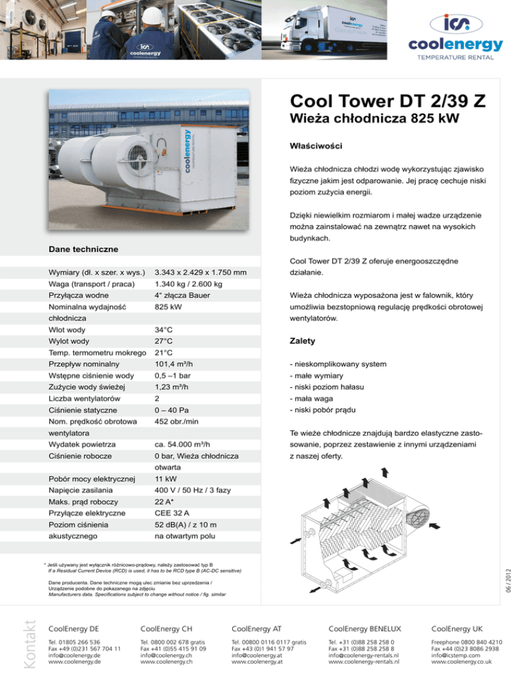 Cool Tower DT 2/39 Z Wieża chłodnicza 825 kW Właściwości Wieża chłodnicza chłodzi wodę wykorzystując zjawisko fizyczne jakim jest odparowanie. Jej pracę cechuje niski poziom zużycia energii. Dzięki niewielkim rozmiarom i małej wadze urządzenie można zainstalować na zewnątrz nawet na wysokich budynkach. Dane techniczne Cool Tower DT 2/39 Z oferuje energooszczędne Wymiary (dł. x szer. x wys.) 3.343 x 2.429 x 1.750 mm Waga (transport / praca) 1.340 kg / 2.600 kg Przyłącza wodne 4“ złącza Bauer Wieża chłodnicza wyposażona jest w falownik, który Nominalna wydajność 825 kW umożliwia bezstopniową regulację prędkości obrotowej chłodnicza działanie. wentylatorów. Wlot wody 34°C Wylot wody 27°C Temp. termometru mokrego 21°C Przepływ nominalny 101,4 m³/h - nieskomplikowany system Wstępne ciśnienie wody 0,5 –1 bar - małe wymiary Zużycie wody świeżej 1,23 m³/h - niski poziom hałasu Liczba wentylatorów 2 - mała waga Ciśnienie statyczne 0 – 40 Pa - niski pobór prądu Nom. prędkość obrotowa 452 obr./min Zalety Te wieże chłodnicze znajdują bardzo elastyczne zasto- wentylatora Wydatek powietrza ca. 54.000 m³/h sowanie, poprzez zestawienie z innymi urządzeniami Ciśnienie robocze 0 bar, Wieża chłodnicza z naszej oferty. otwarta Pobór mocy elektrycznej 11 kW Napięcie zasilania 400 V / 50 Hz / 3 fazy Maks. prąd roboczy 22 A* Przyłącze elektryczne CEE 32 A Poziom ciśnienia 52 dB(A) / z 10 m akustycznego na otwartym polu 06 / 2012 * Jeśli używany jest wyłącznik różnicowo-prądowy, należy zastosować typ B If a Residual Current Device (RCD) is used, it has to be RCD type B (AC-DC sensitive) Kontakt Dane producenta. Dane techniczne mogą ulec zmianie bez uprzedzenia / Urządzenie podobne do pokazanego na zdjęciu Manufacturers data. Specifications subject to change without notice / fig. similar CoolEnergy DE CoolEnergy CH CoolEnergy AT CoolEnergy BENELUX CoolEnergy UK Tel. 01805 266 536 Fax +49 (0)231 567 704 11 [email protected] www.coolenergy.de Tel. 0800 002 678 gratis Fax +41 (0)55 415 91 09 [email protected] www.coolenergy.ch Tel. 00800 0116 0117 gratis Fax +43 (0)1 941 57 97 [email protected] www.coolenergy.at Tel. +31 (0)88 258 258 0 Fax +31 (0)88 258 258 8 [email protected] www.coolenergy-rentals.nl Freephone 0800 840 4210 Fax +44 (0)23 8086 2938 [email protected] www.coolenergy.co.uk